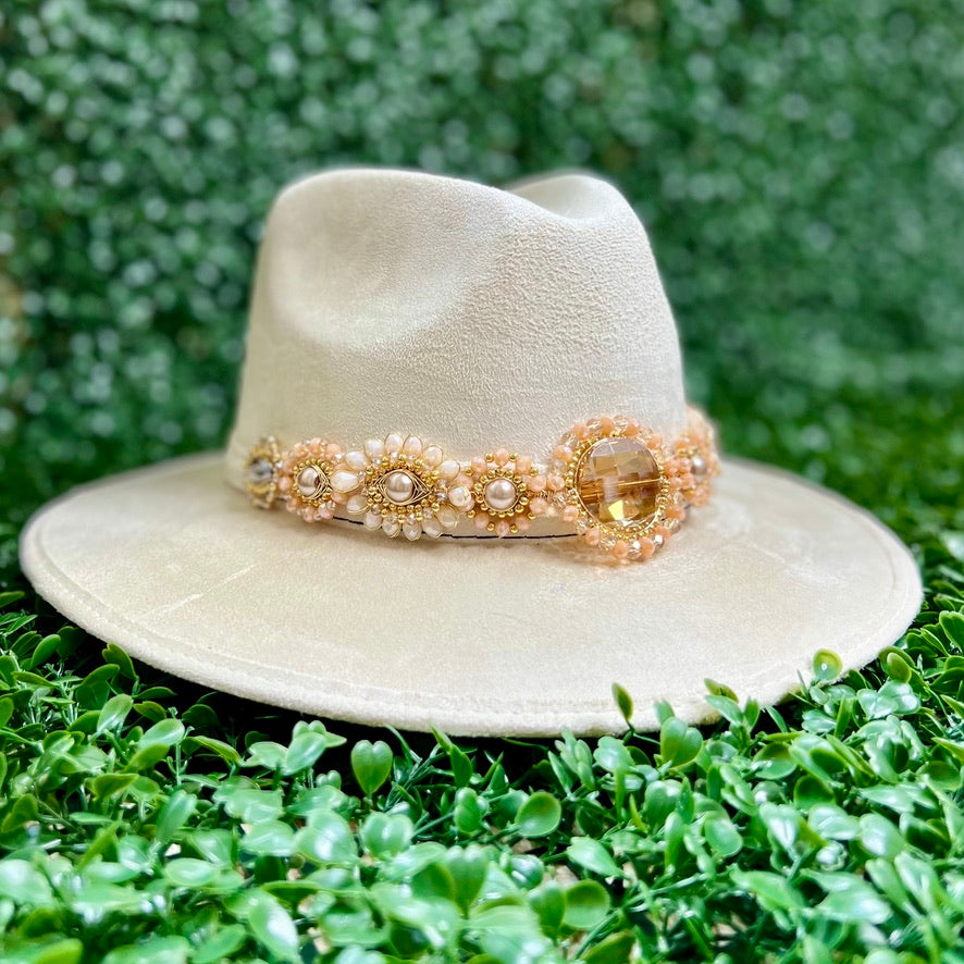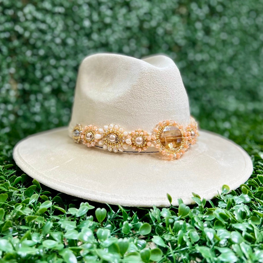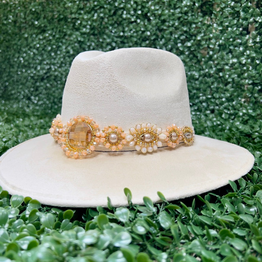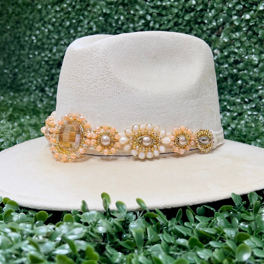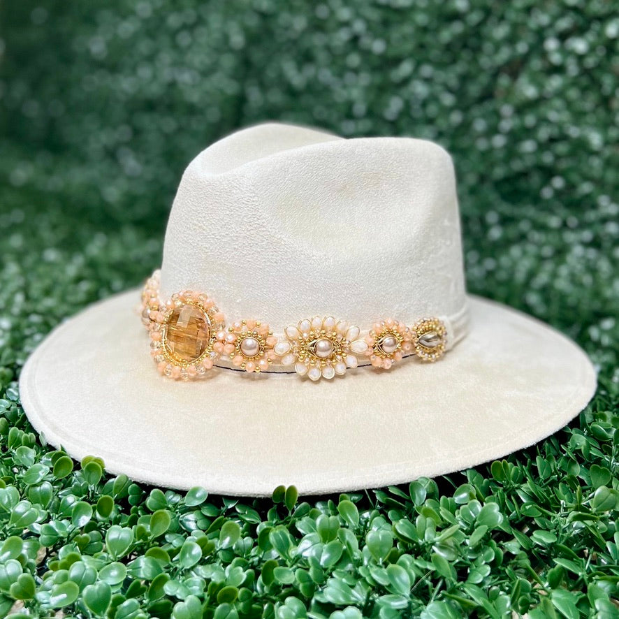 White Sombrero de gamusa styled with traditional gemstone/crystal beaded multi-colored flower design.