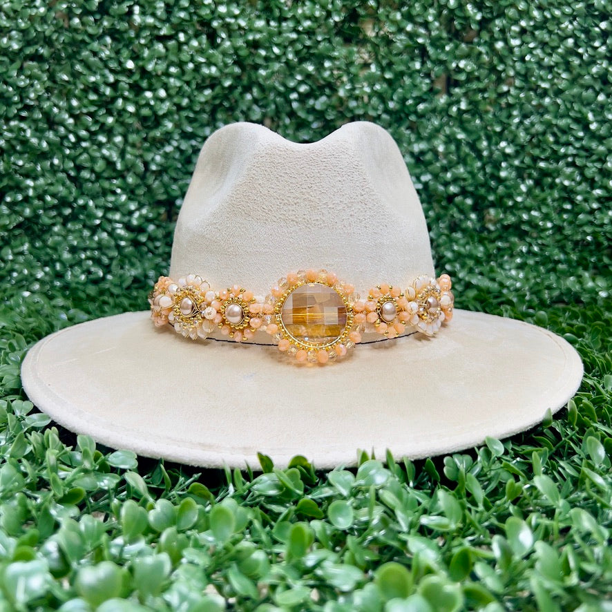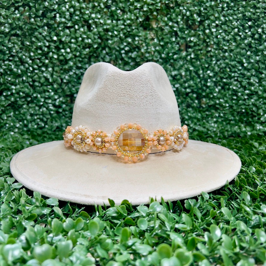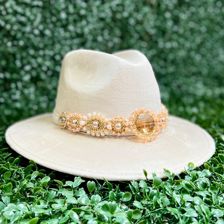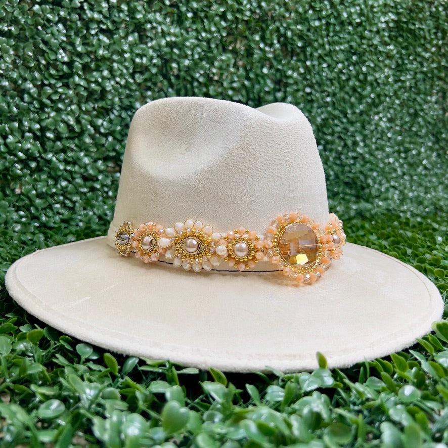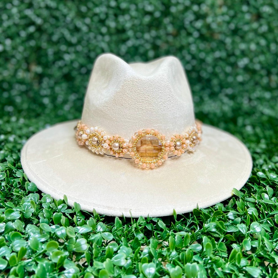 White Sombrero de gamusa styled with traditional gemstone/crystal beaded multi-colored flower design.
