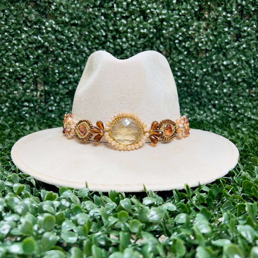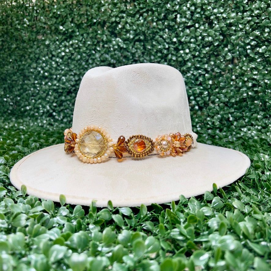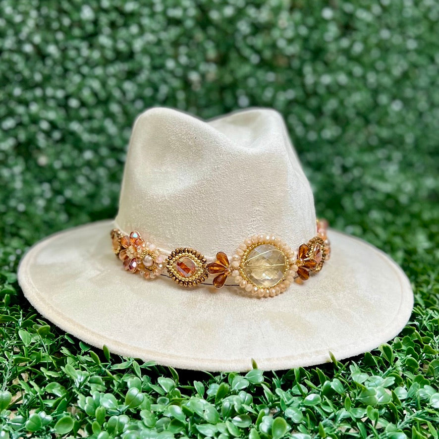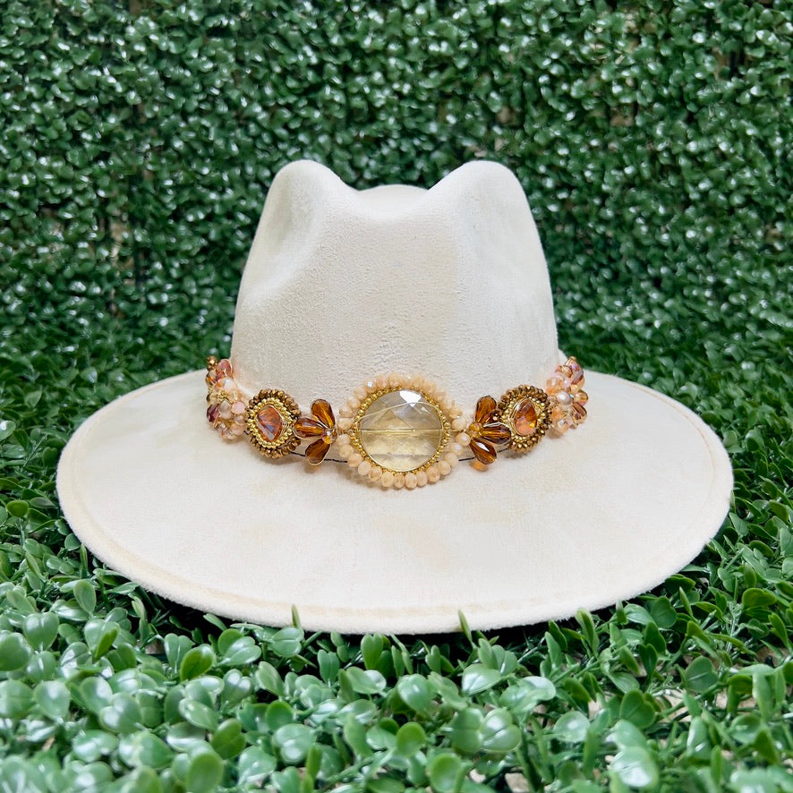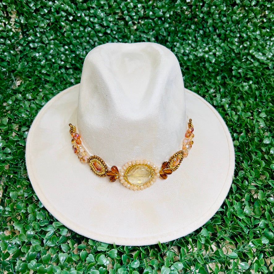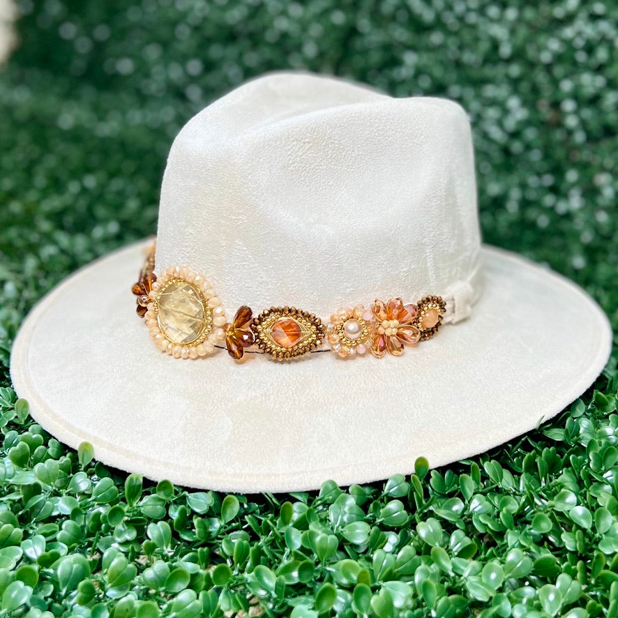 White Sombrero de gamusa styled with traditional gemstone/crystal beaded multi-colored flower design.