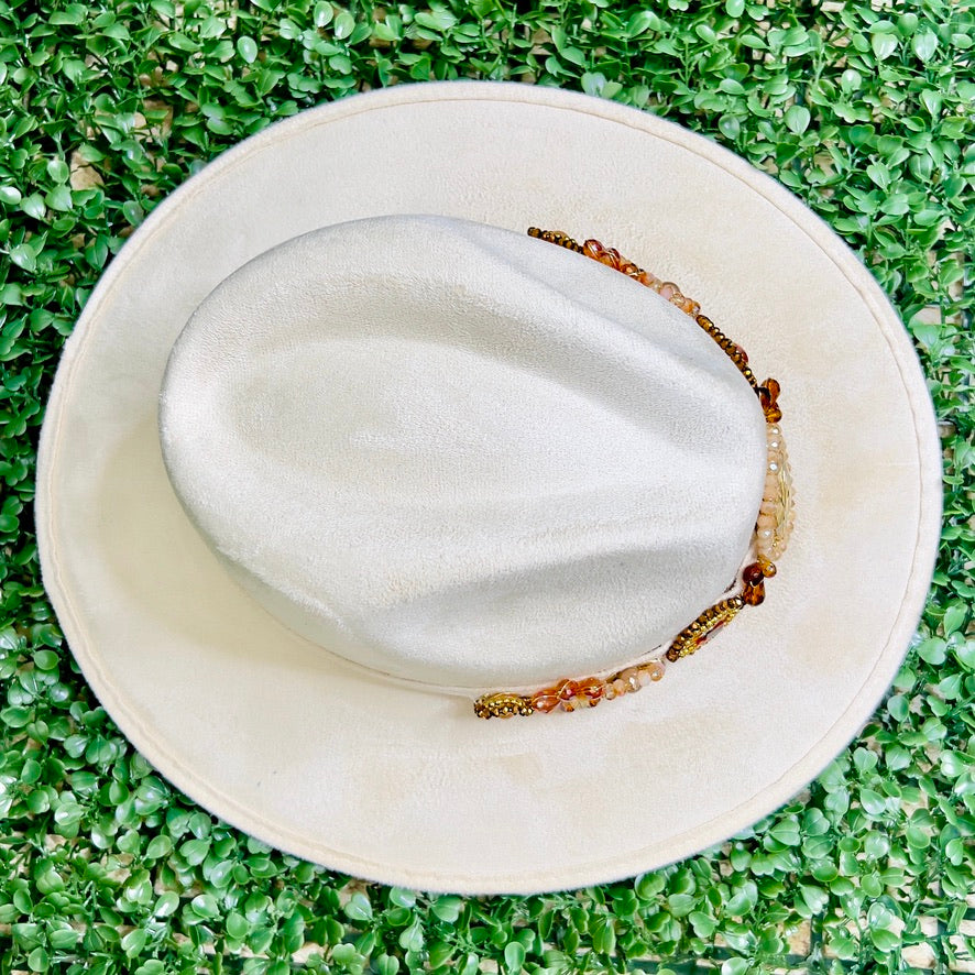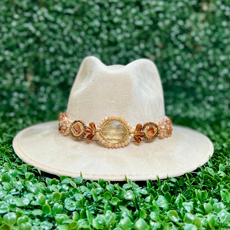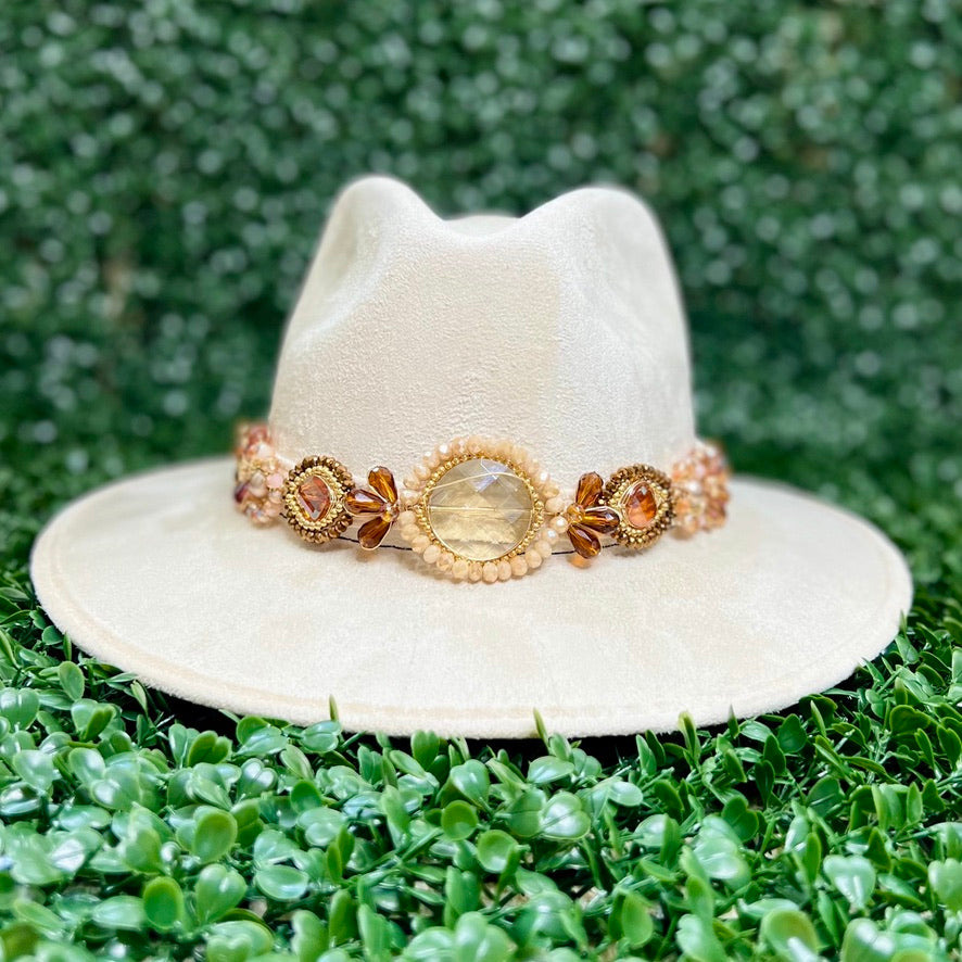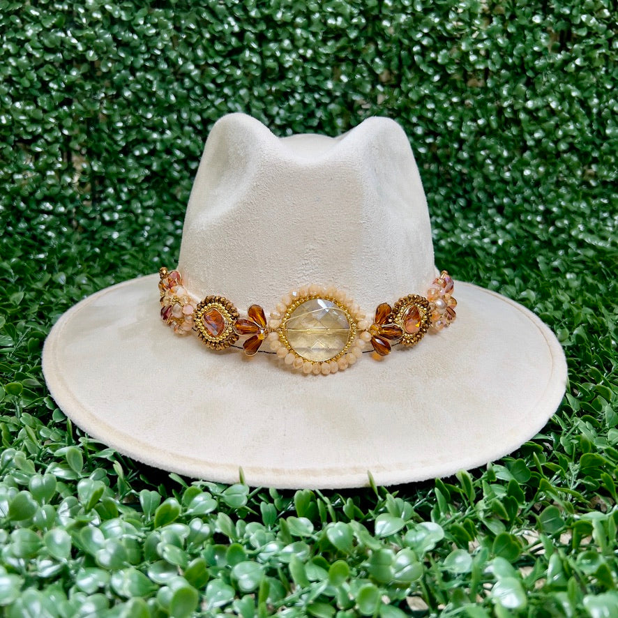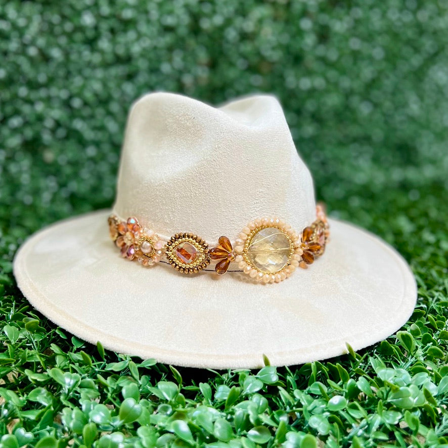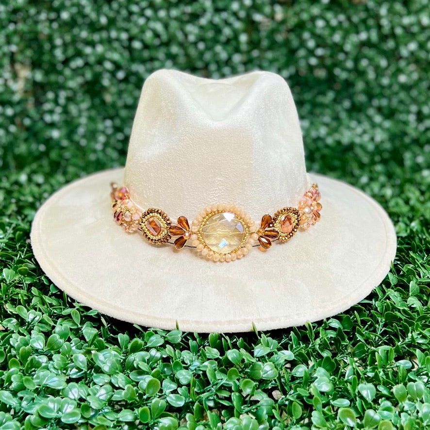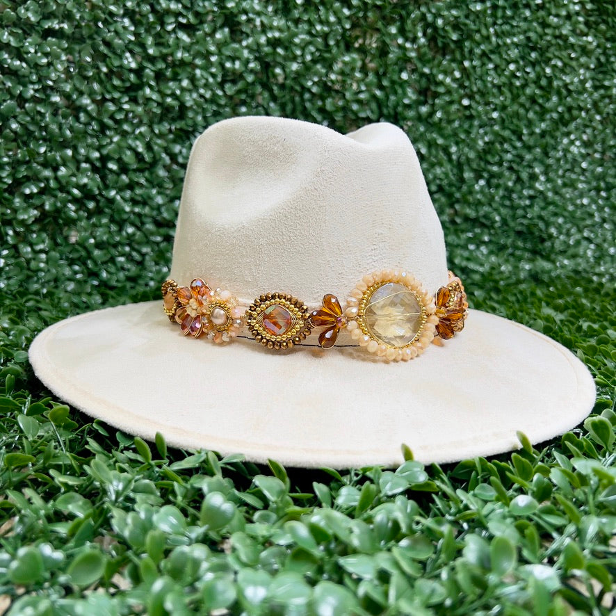 White Sombrero de gamusa styled with traditional gemstone/crystal beaded multi-colored flower design.