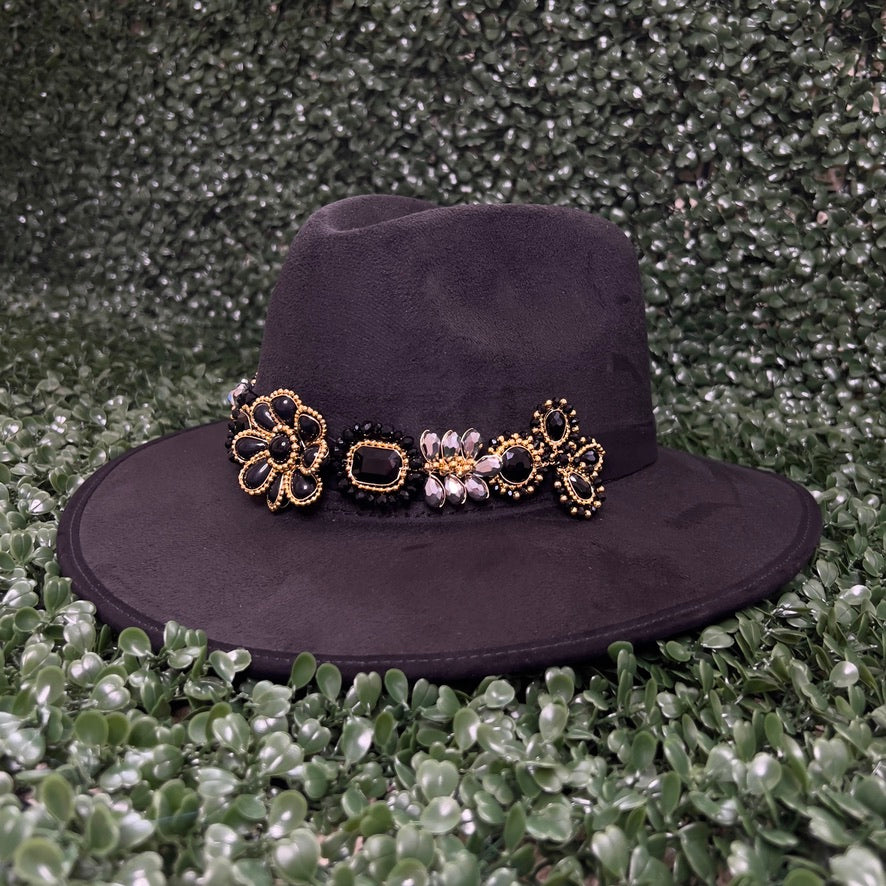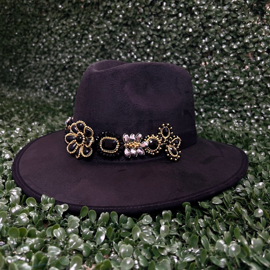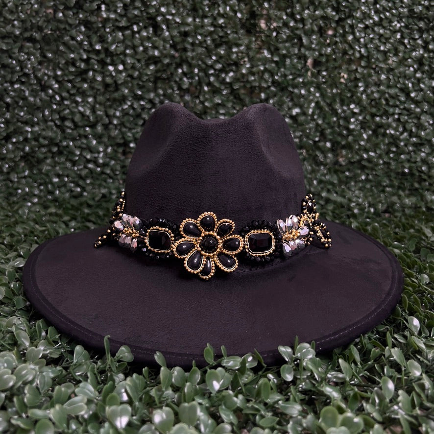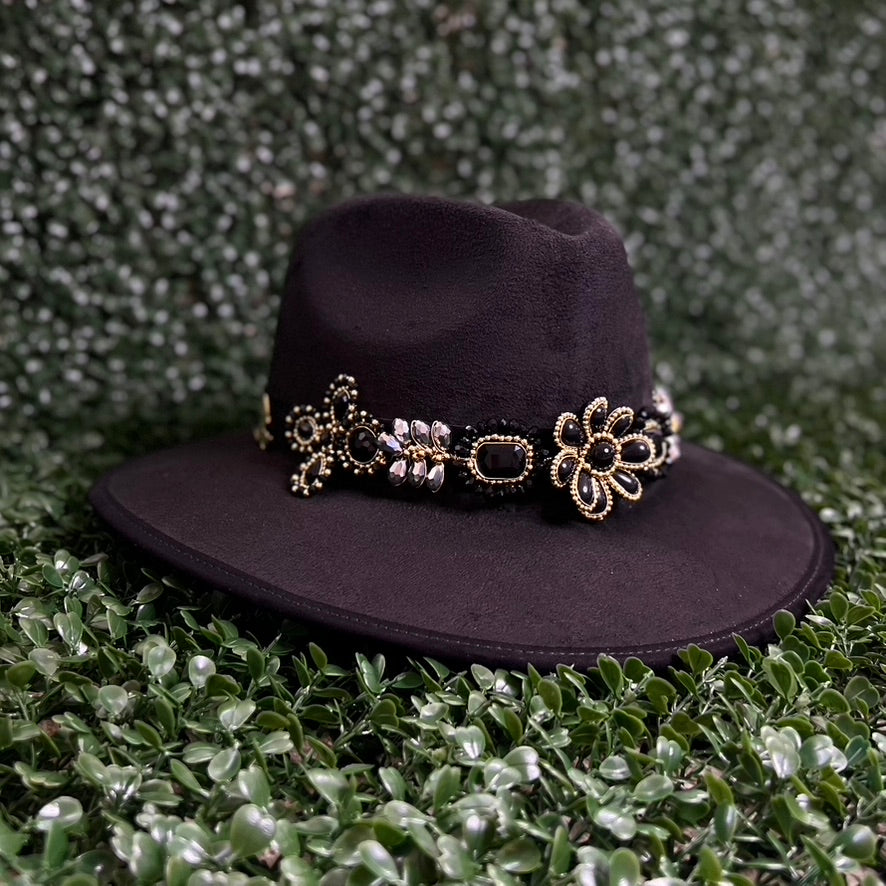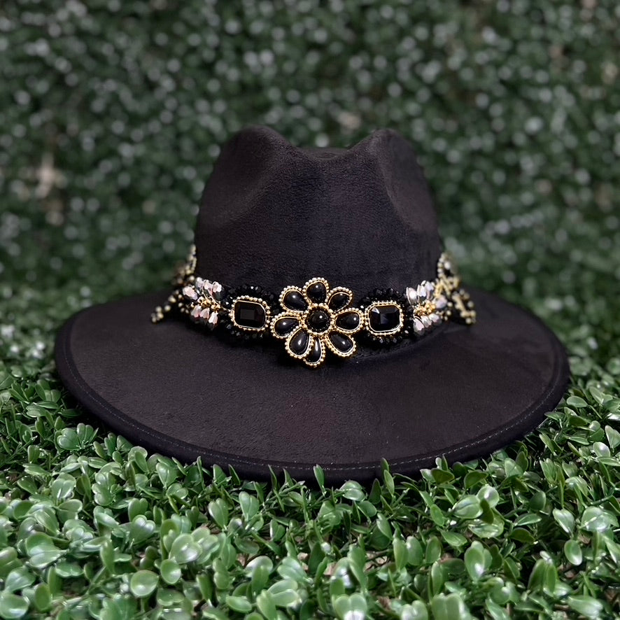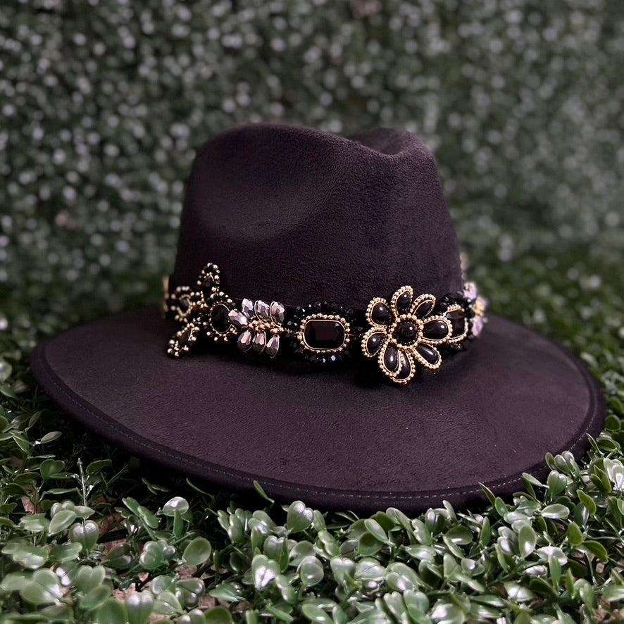 Black Sombrero de gamusa styled with traditional gemstone/crystal beaded multi-colored flower design.