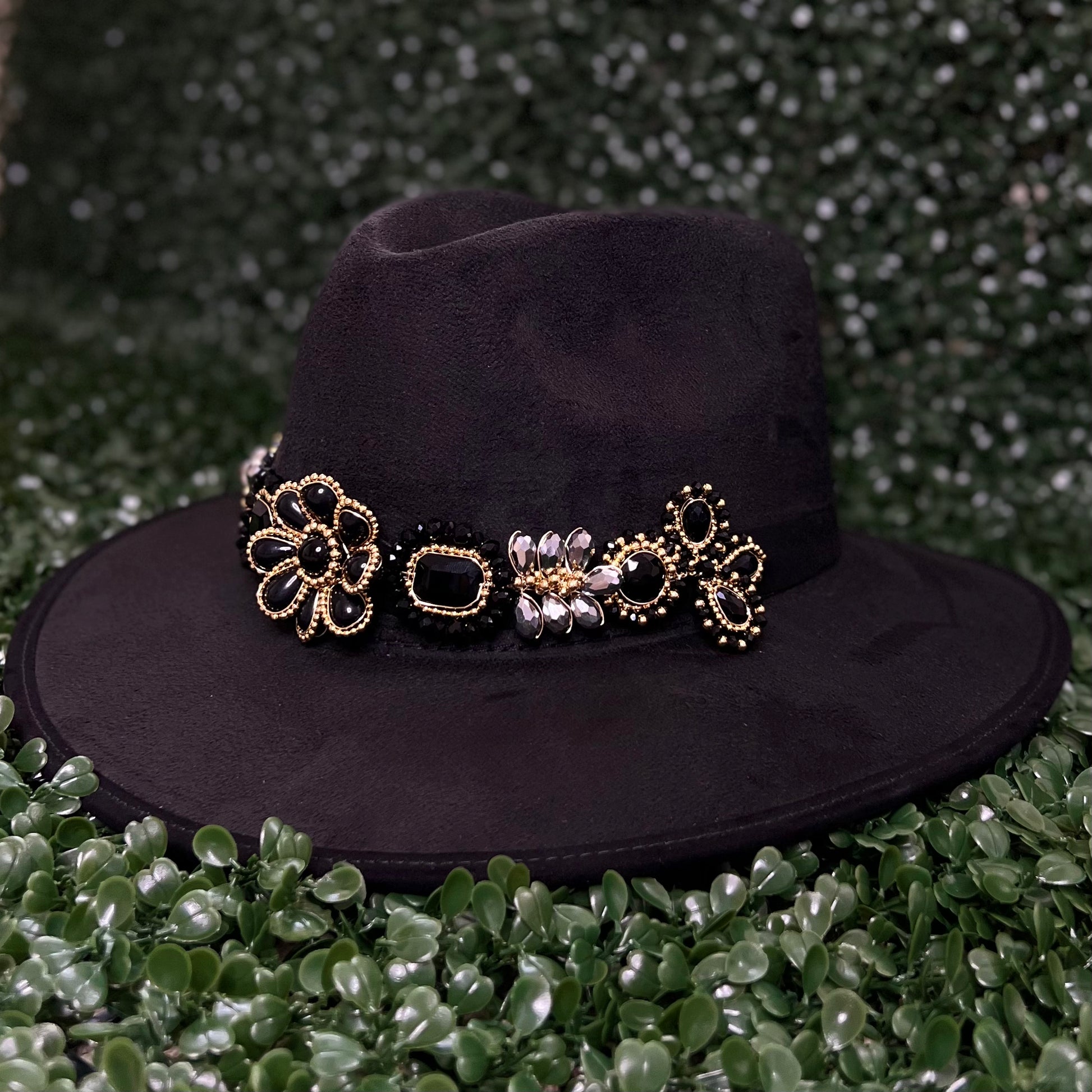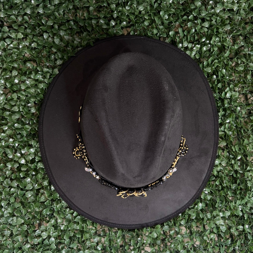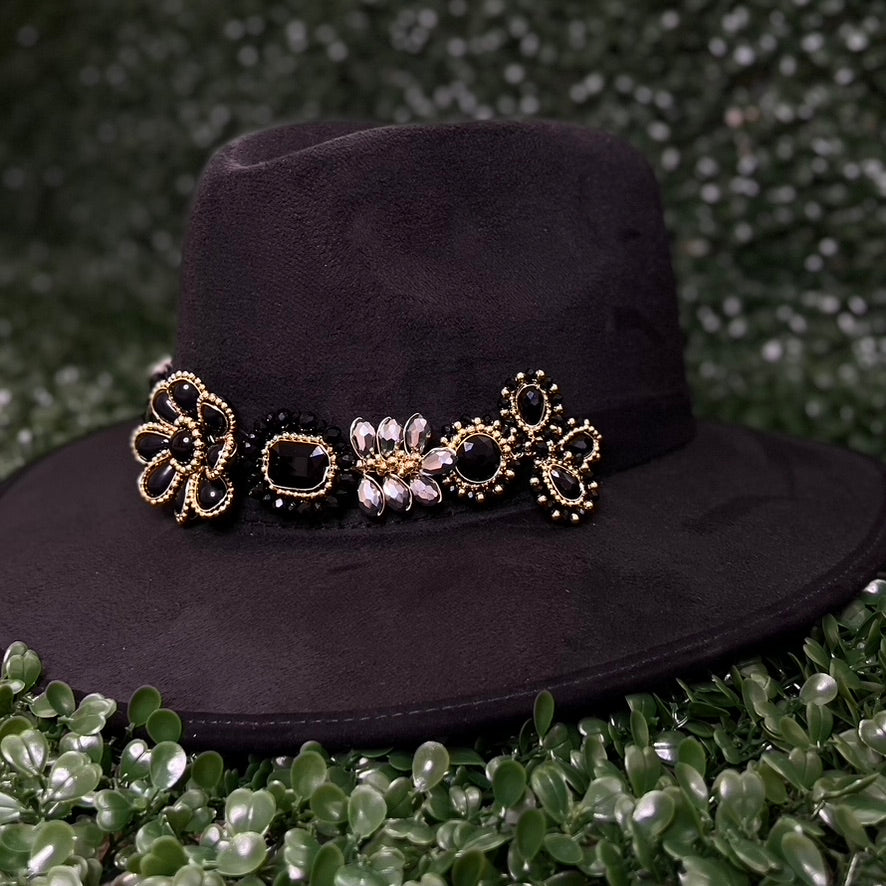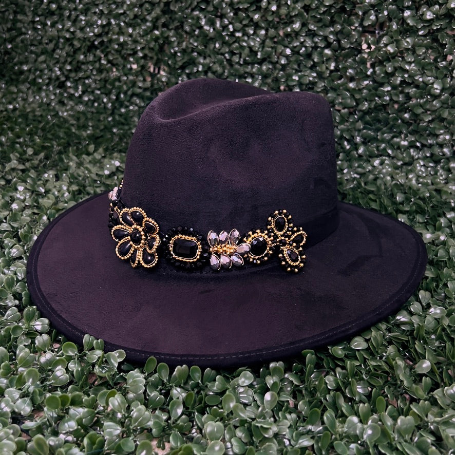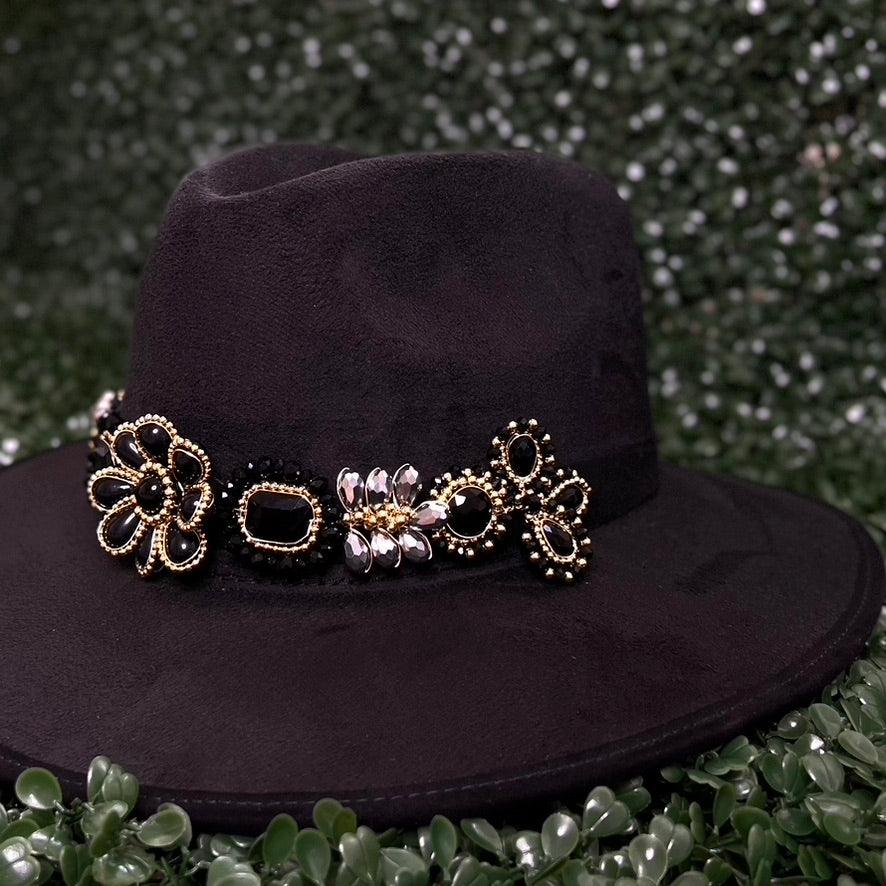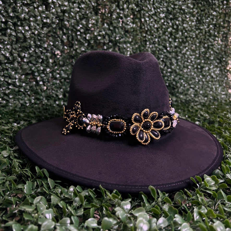 Black Sombrero de gamusa styled with traditional gemstone/crystal beaded multi-colored flower design.