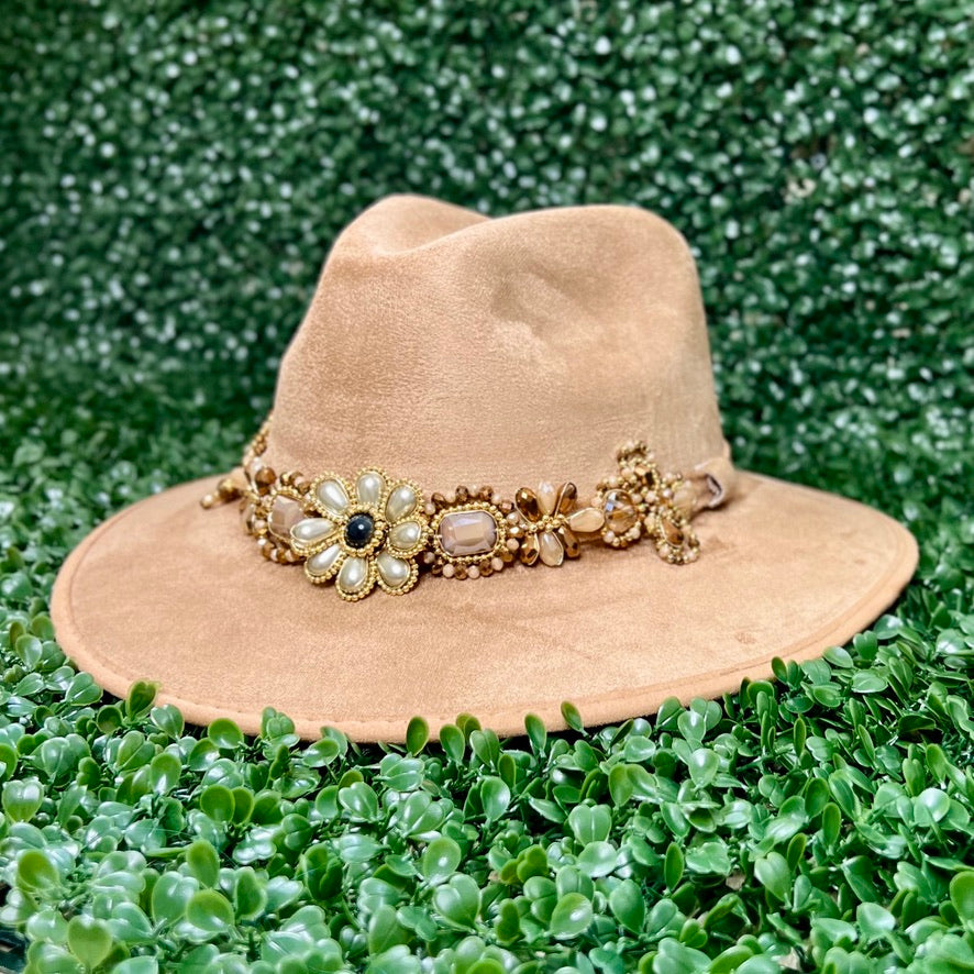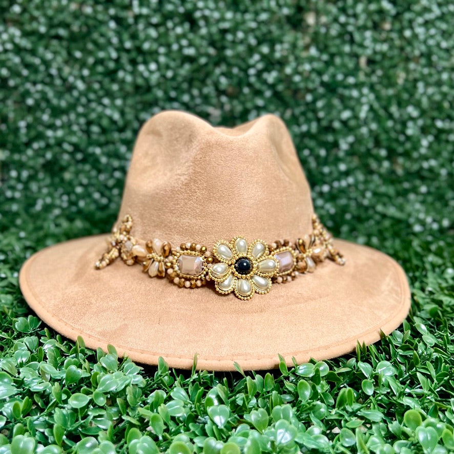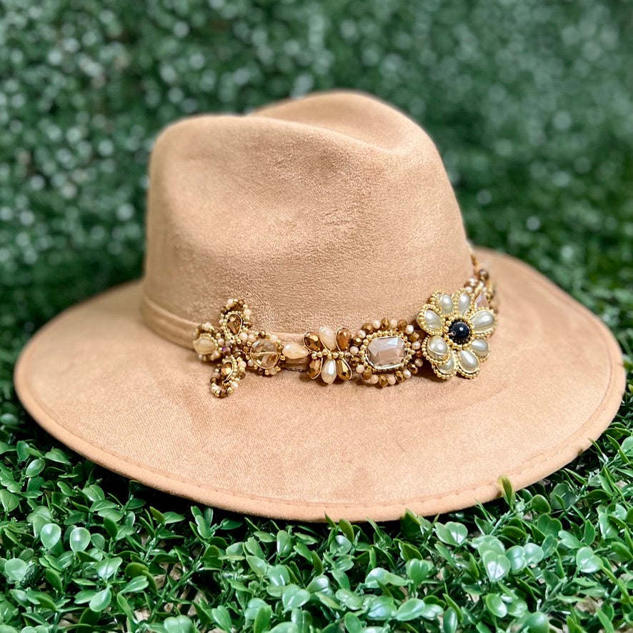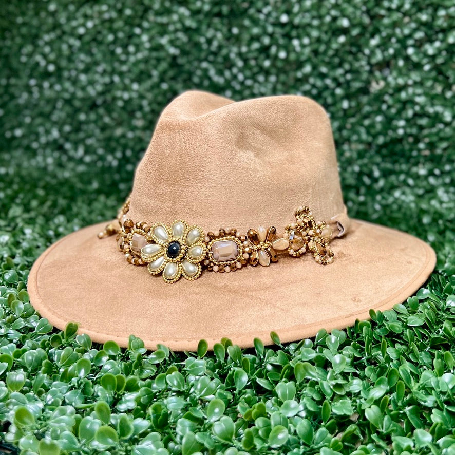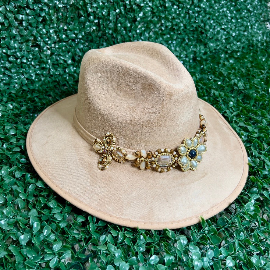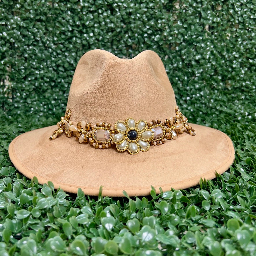Light Brown Sombrero de gamusa styled with traditional gemstone/crystal beaded multi-colored flower design.