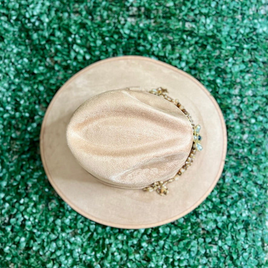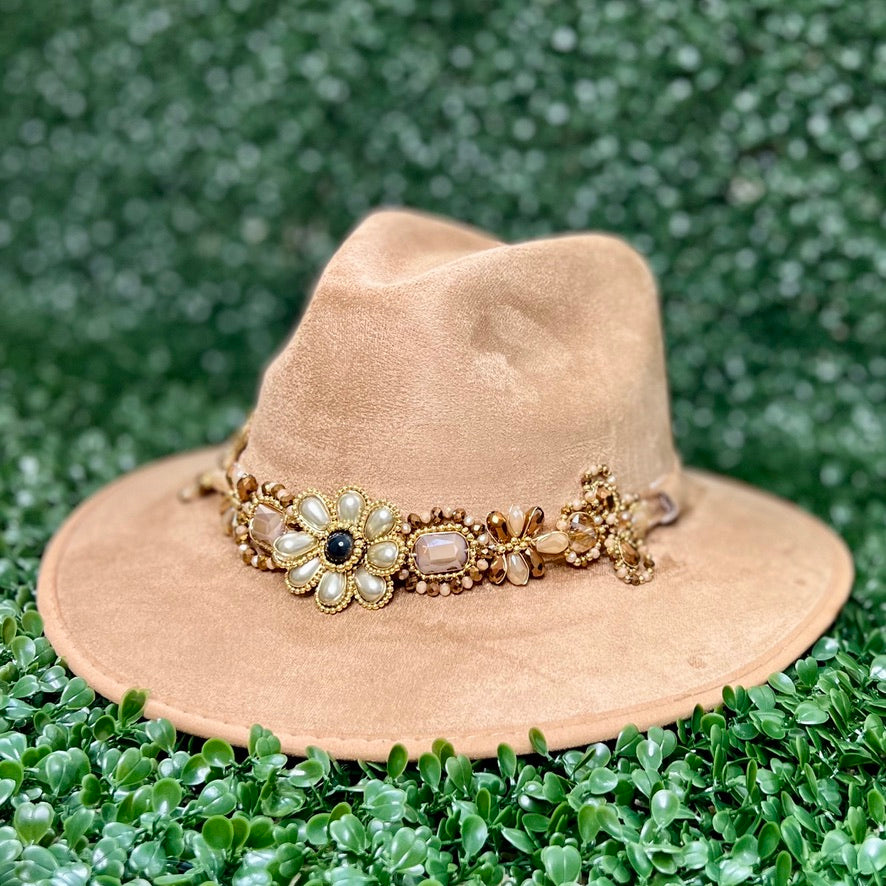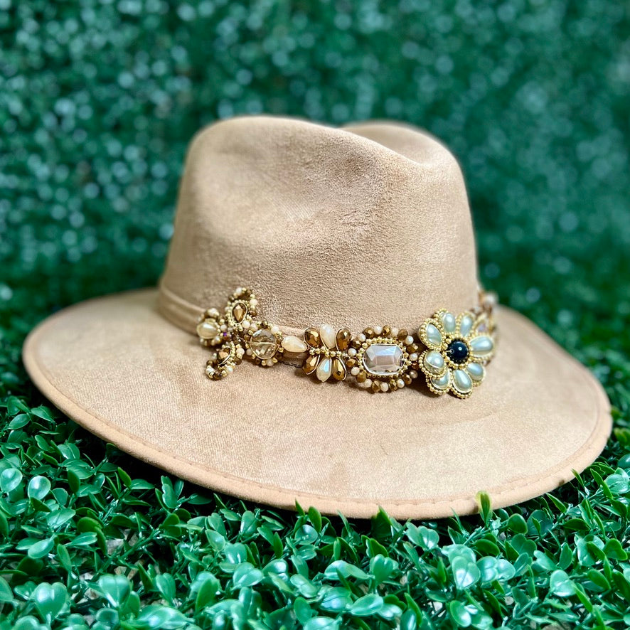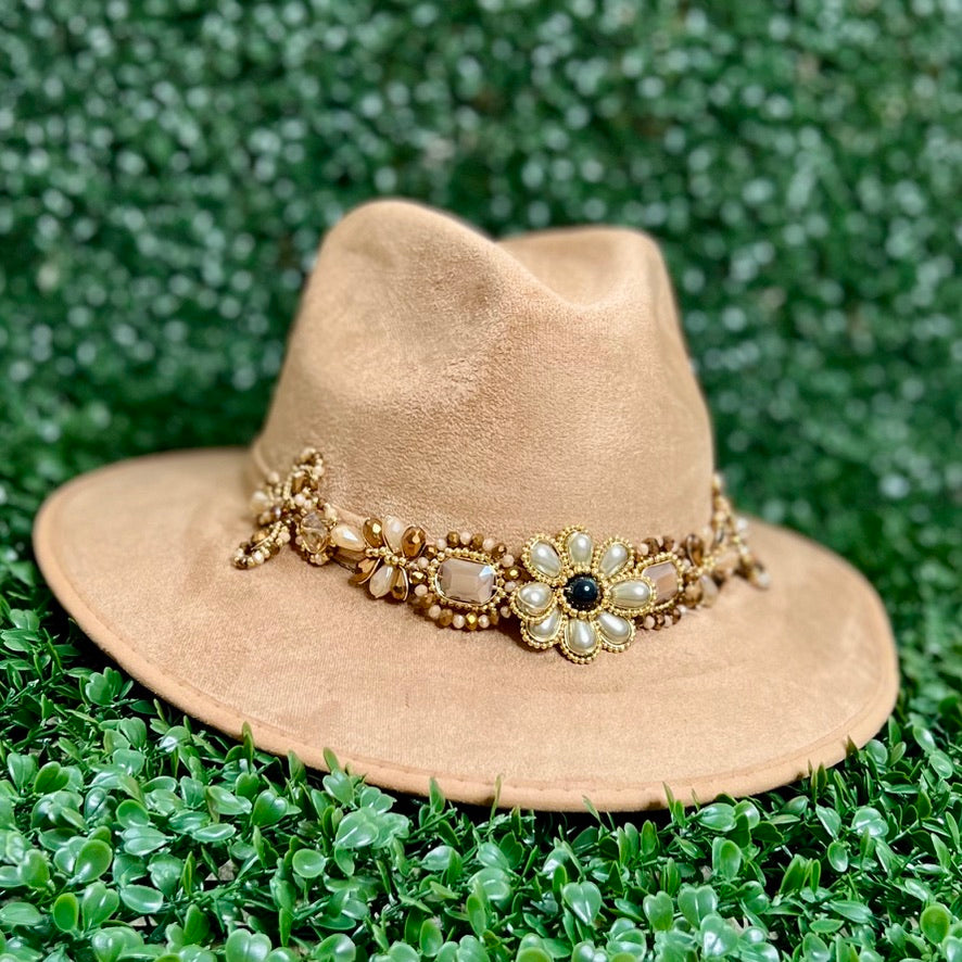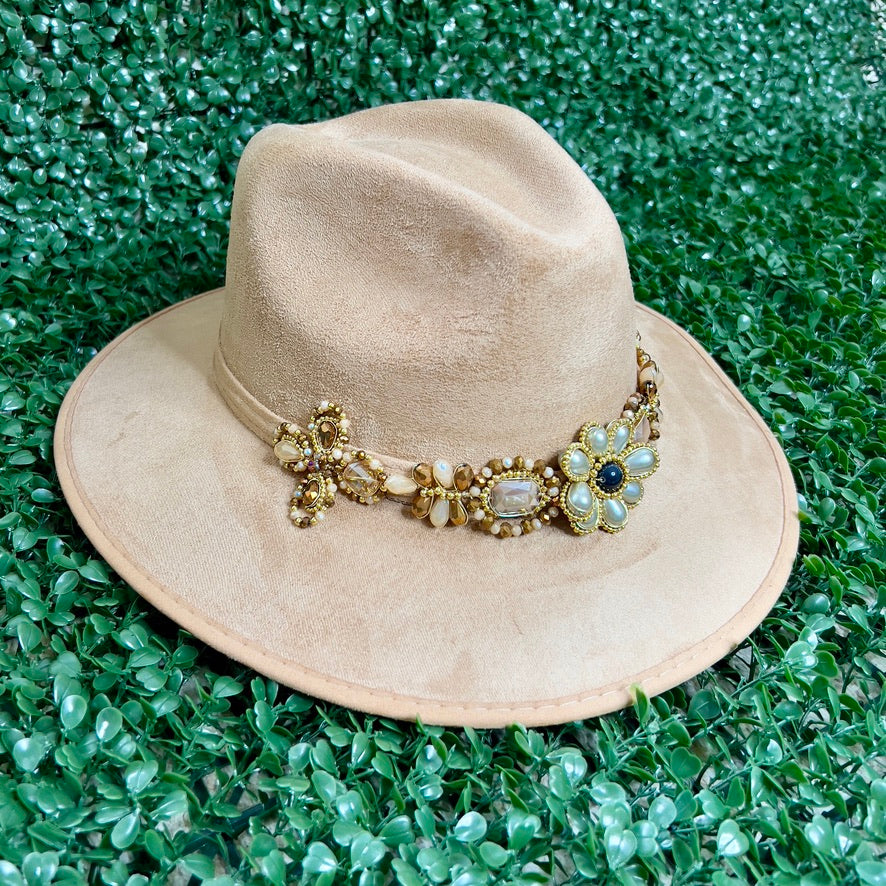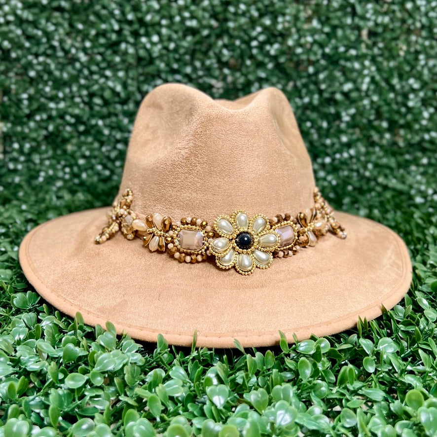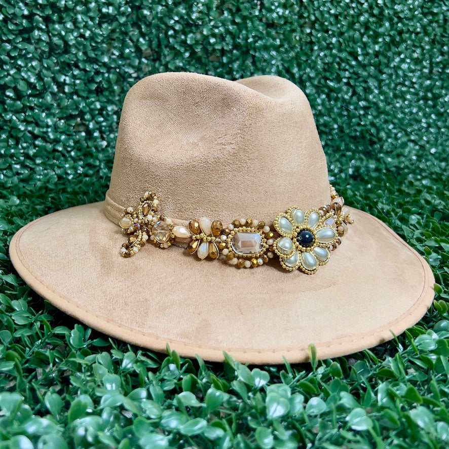 Light Brown Sombrero de gamusa styled with traditional gemstone/crystal beaded multi-colored flower design.
