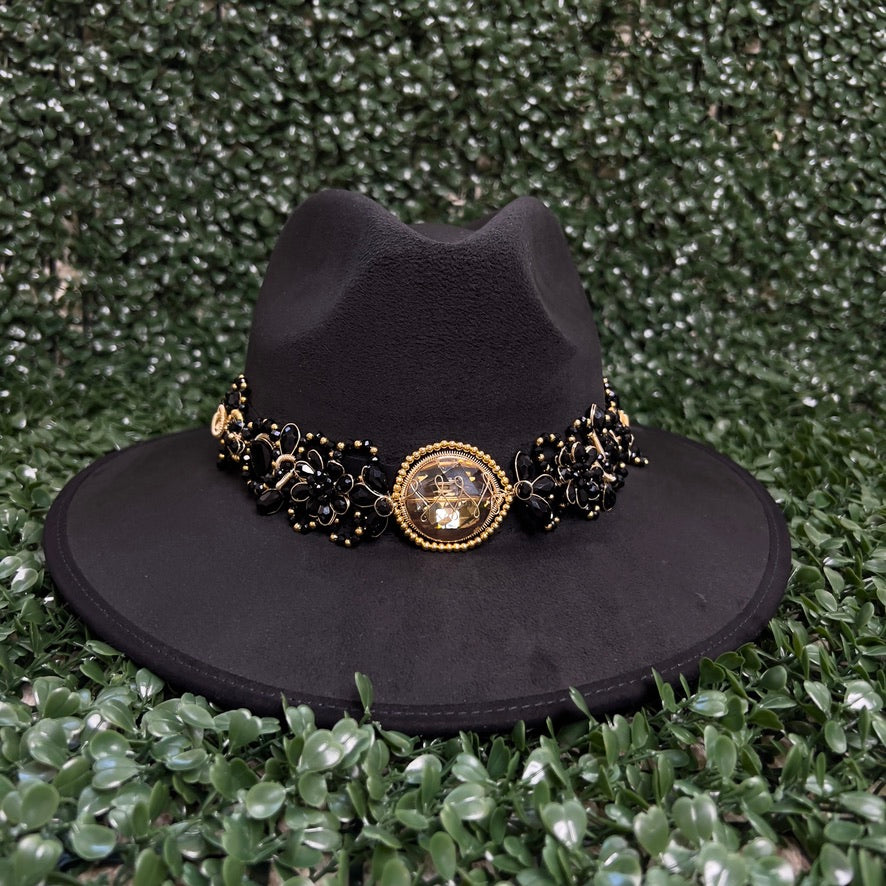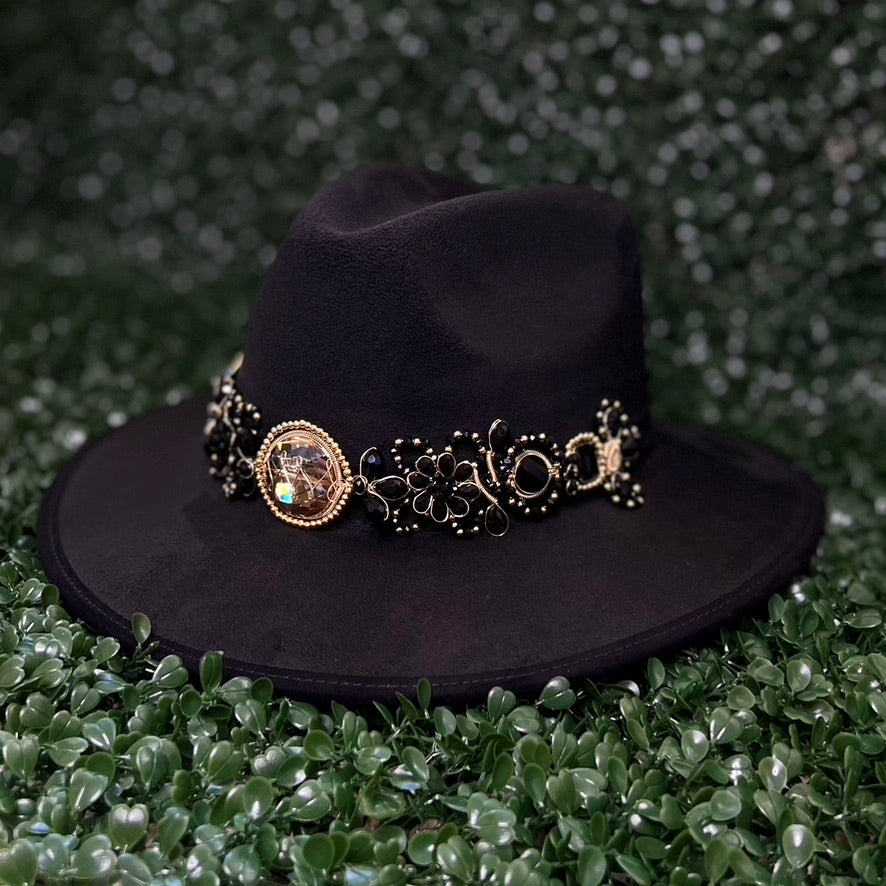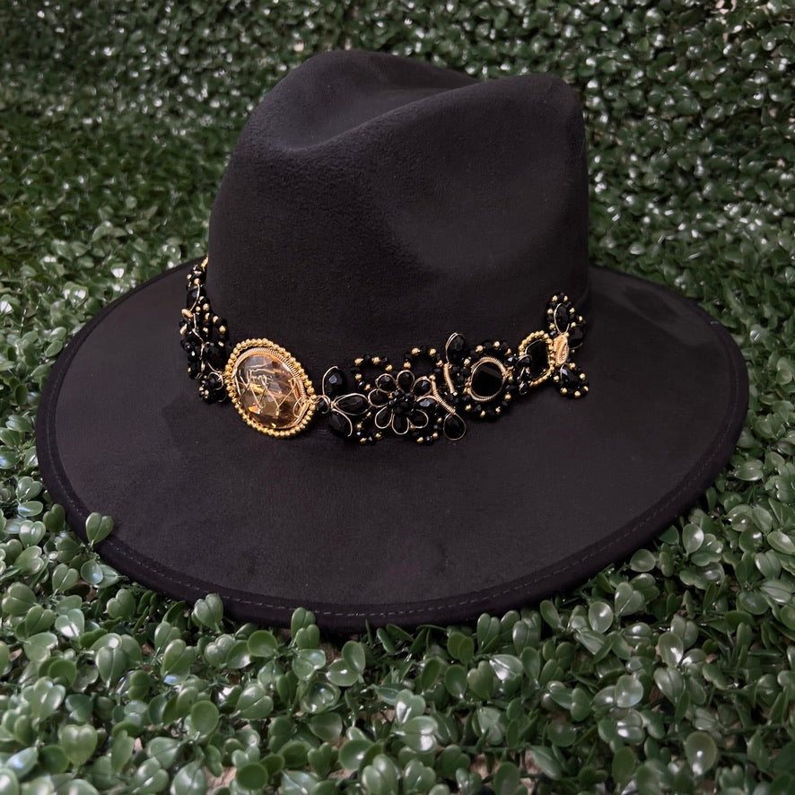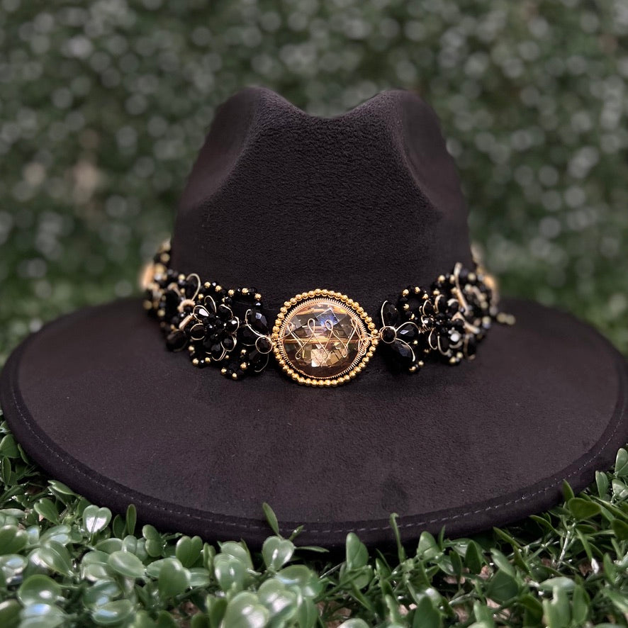 Black Sombrero de gamusa styled with traditional gemstone/crystal beaded multi-colored flower design.