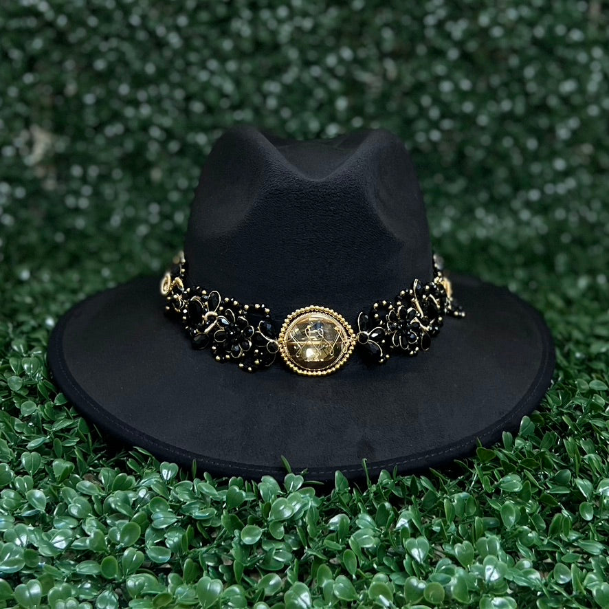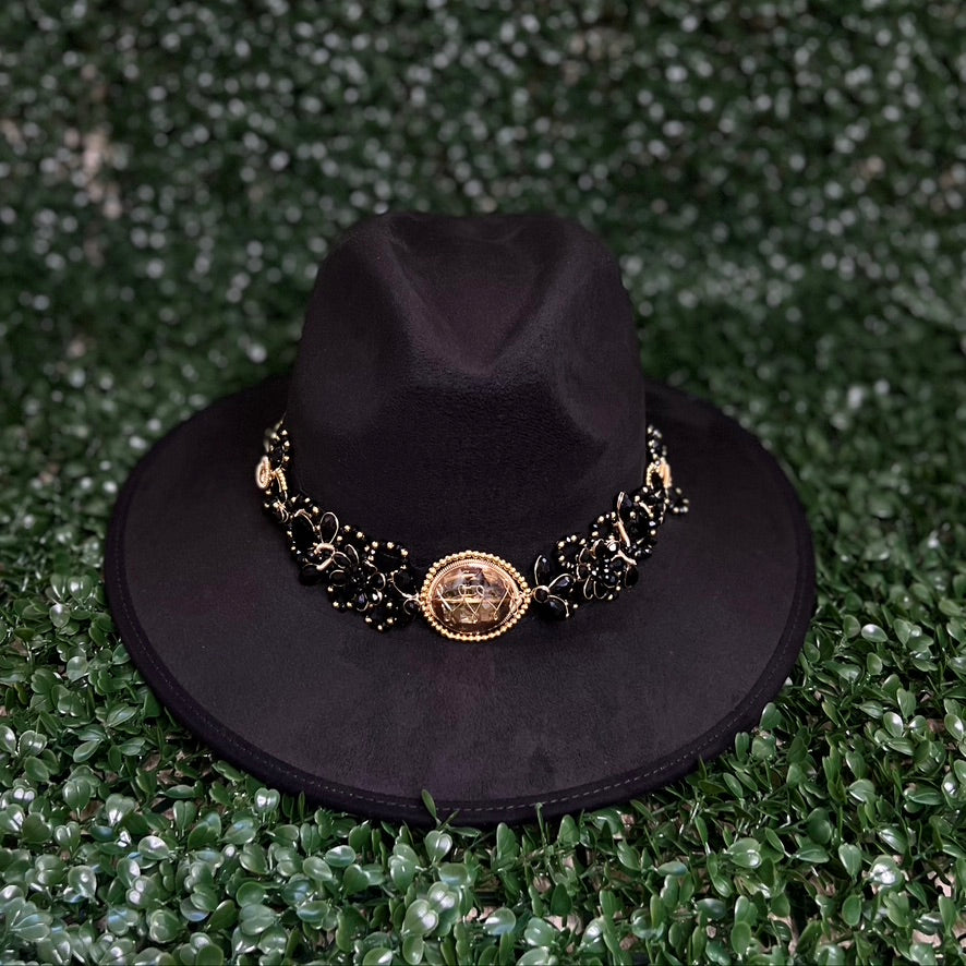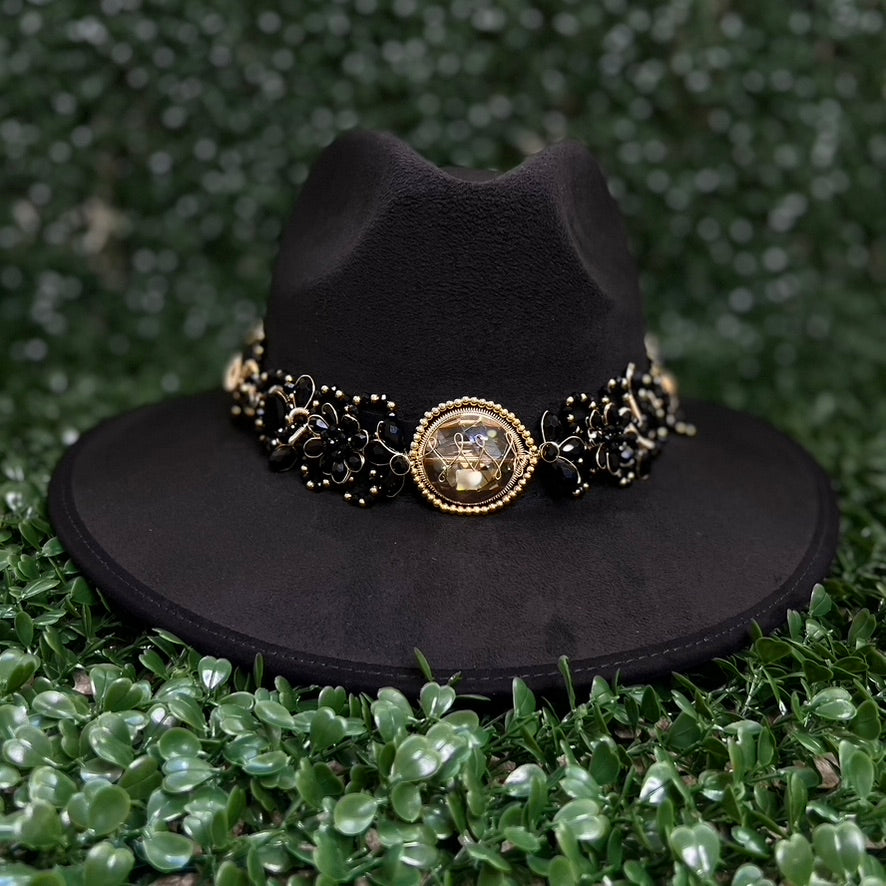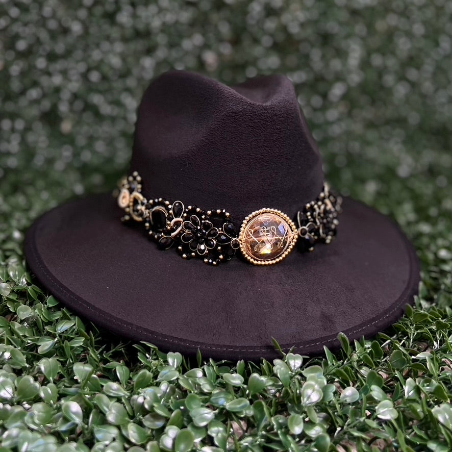 Black Sombrero de gamusa styled with traditional gemstone/crystal beaded multi-colored flower design.
