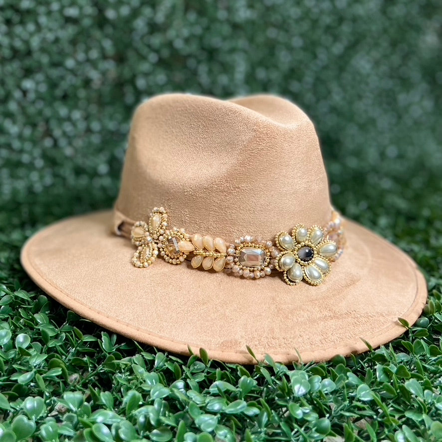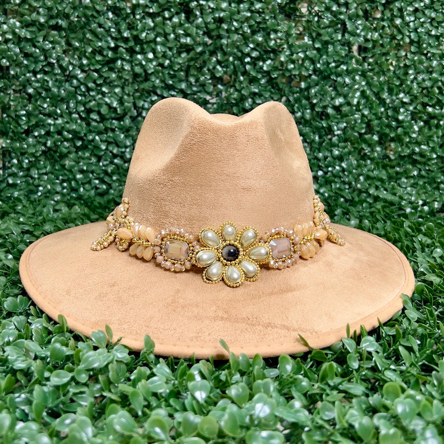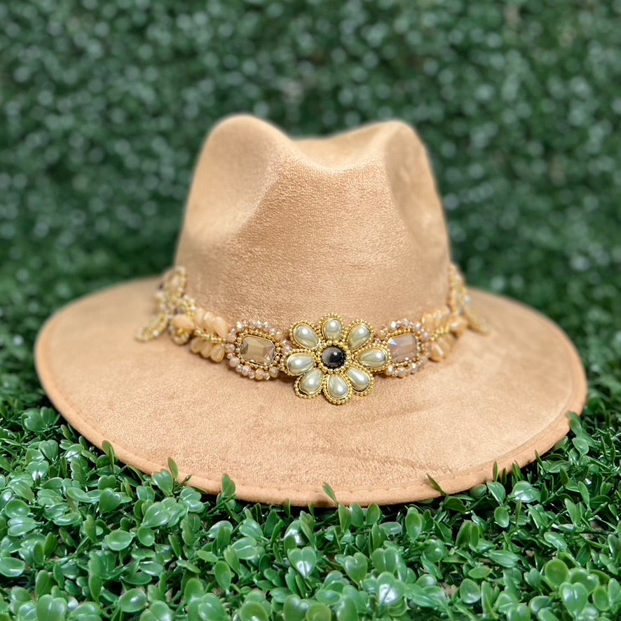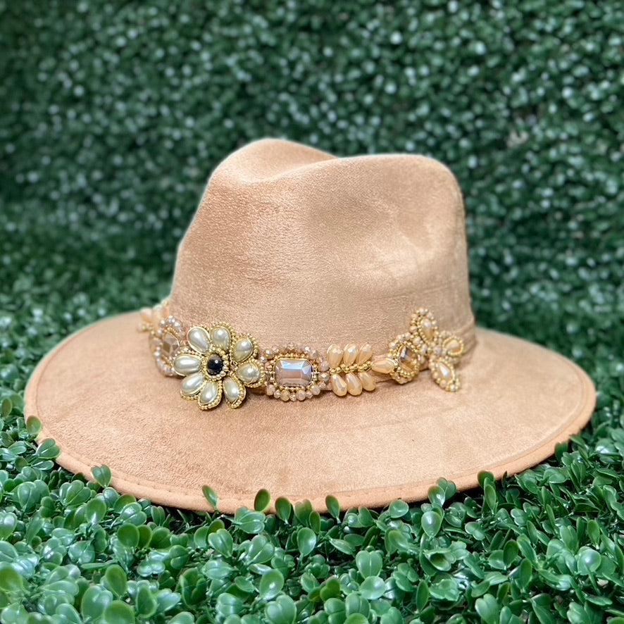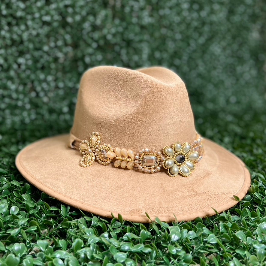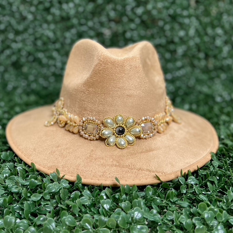 Light Brown Sombrero de gamusa styled with traditional gemstone/crystal beaded multi-colored flower design.