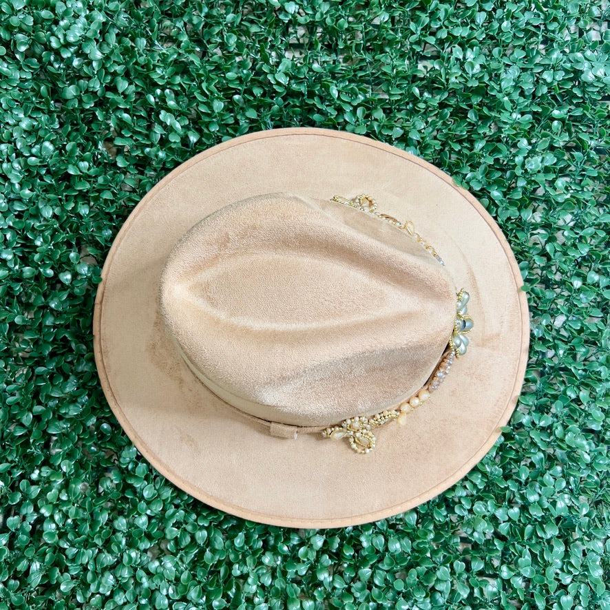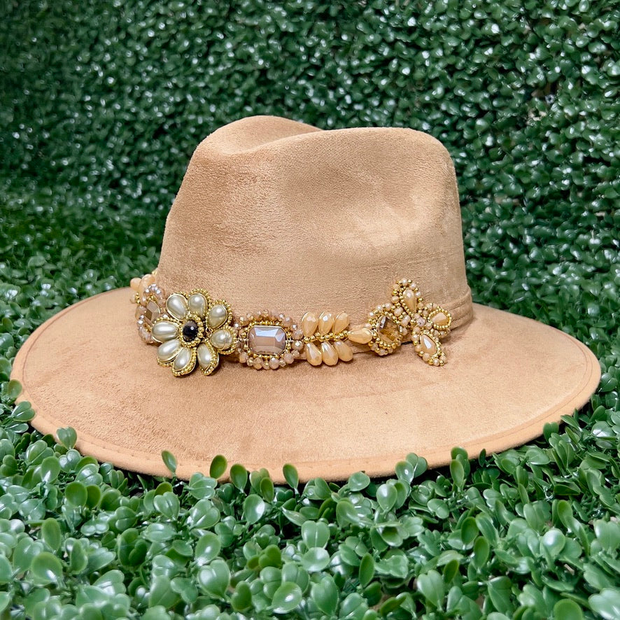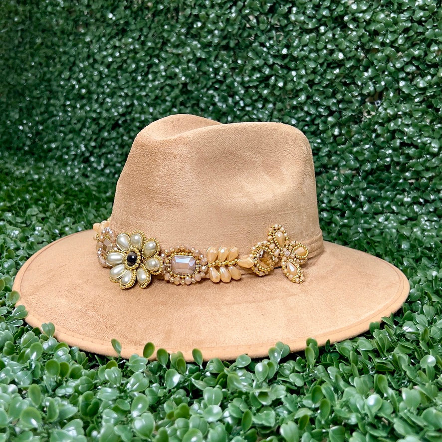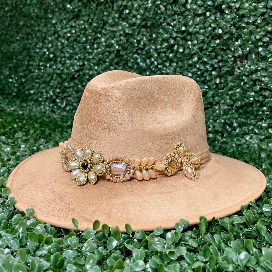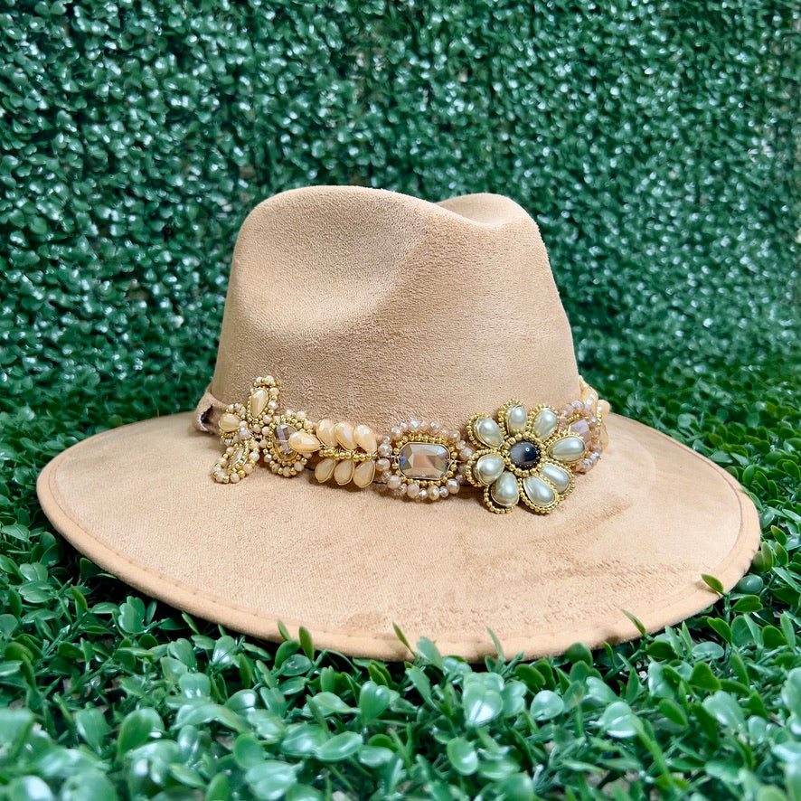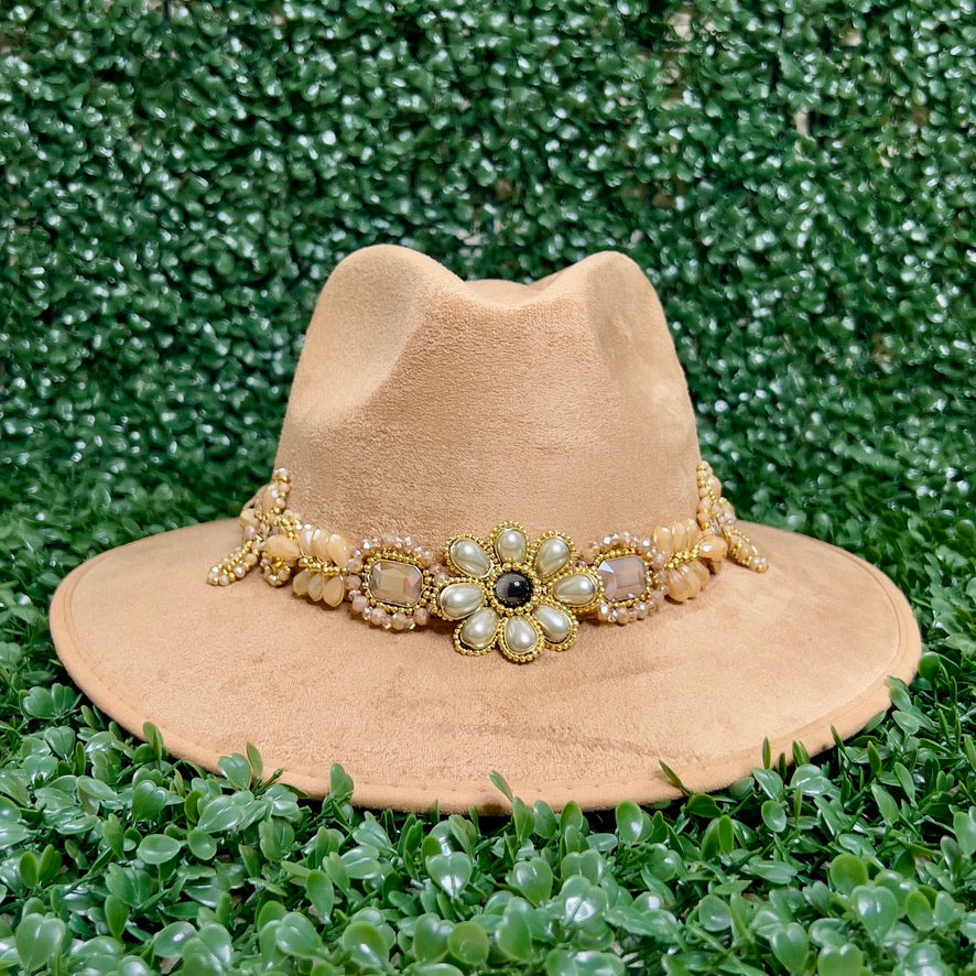 Light Brown Sombrero de gamusa styled with traditional gemstone/crystal beaded multi-colored flower design.
