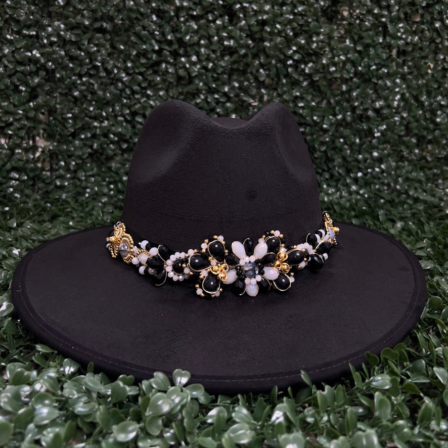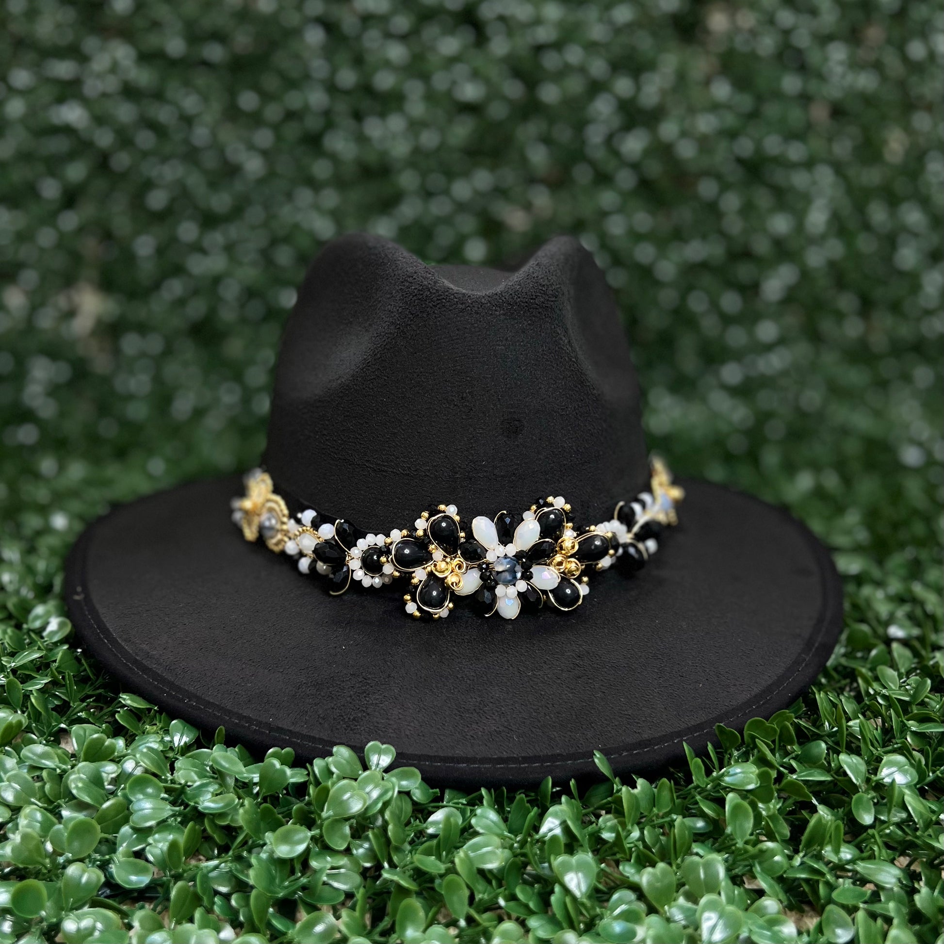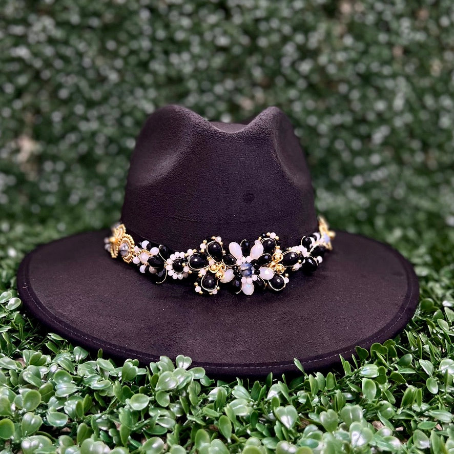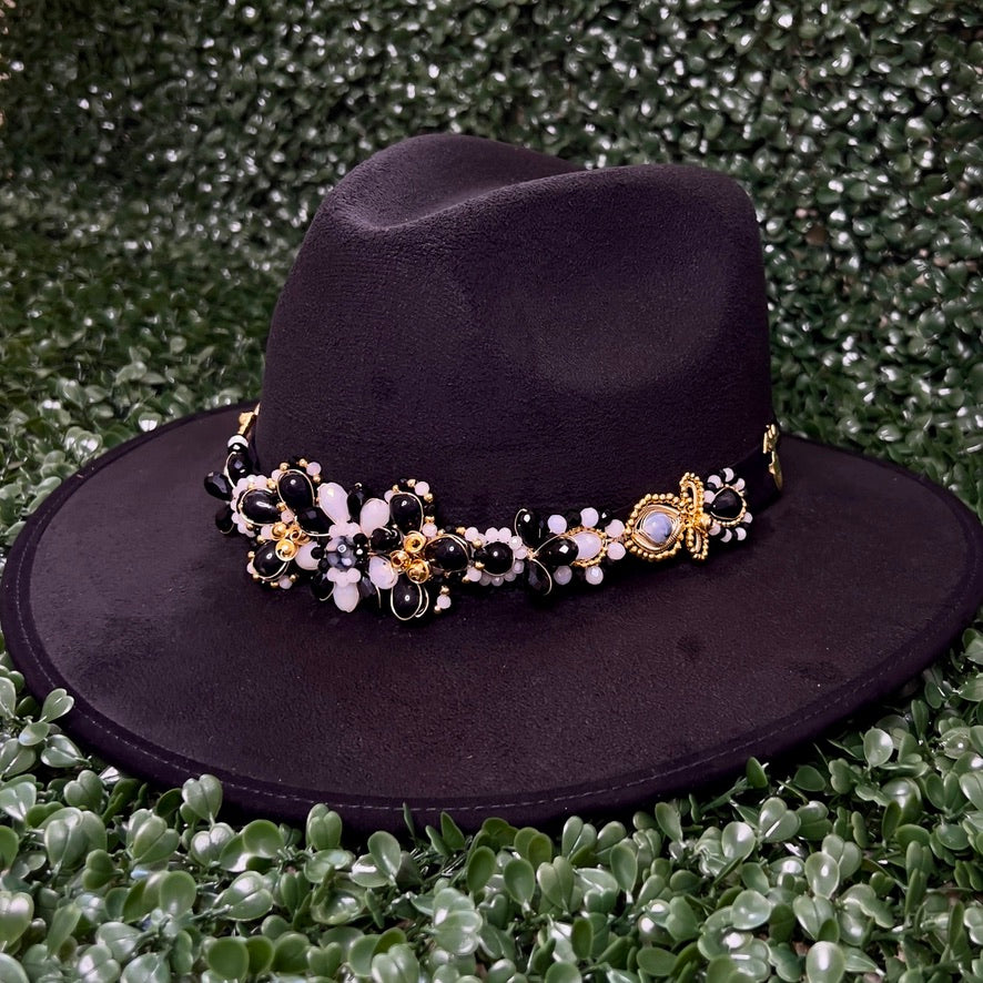 Black Sombrero de gamusa styled with traditional gemstone/crystal beaded multi-colored flower design.