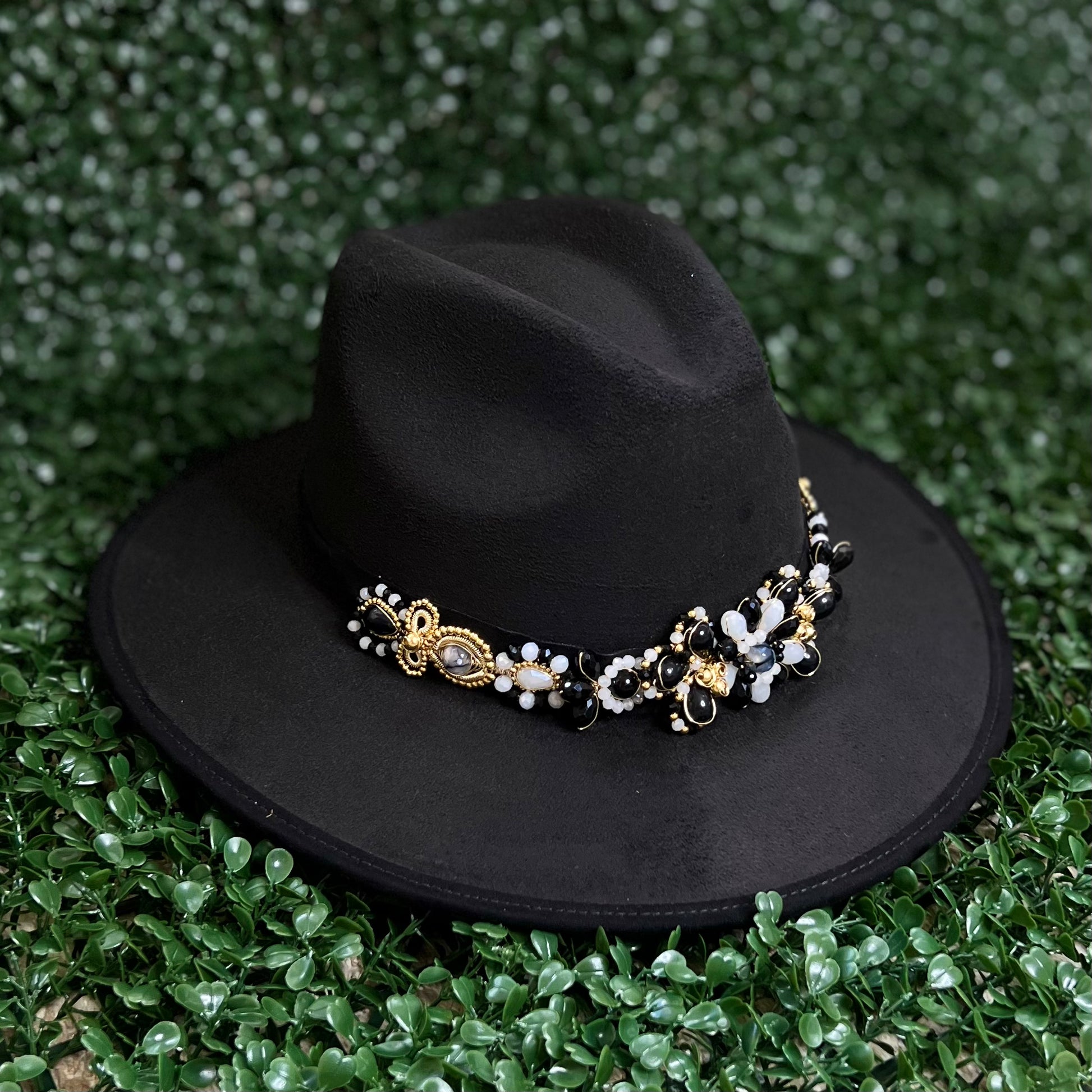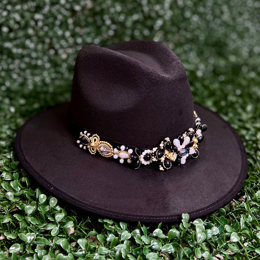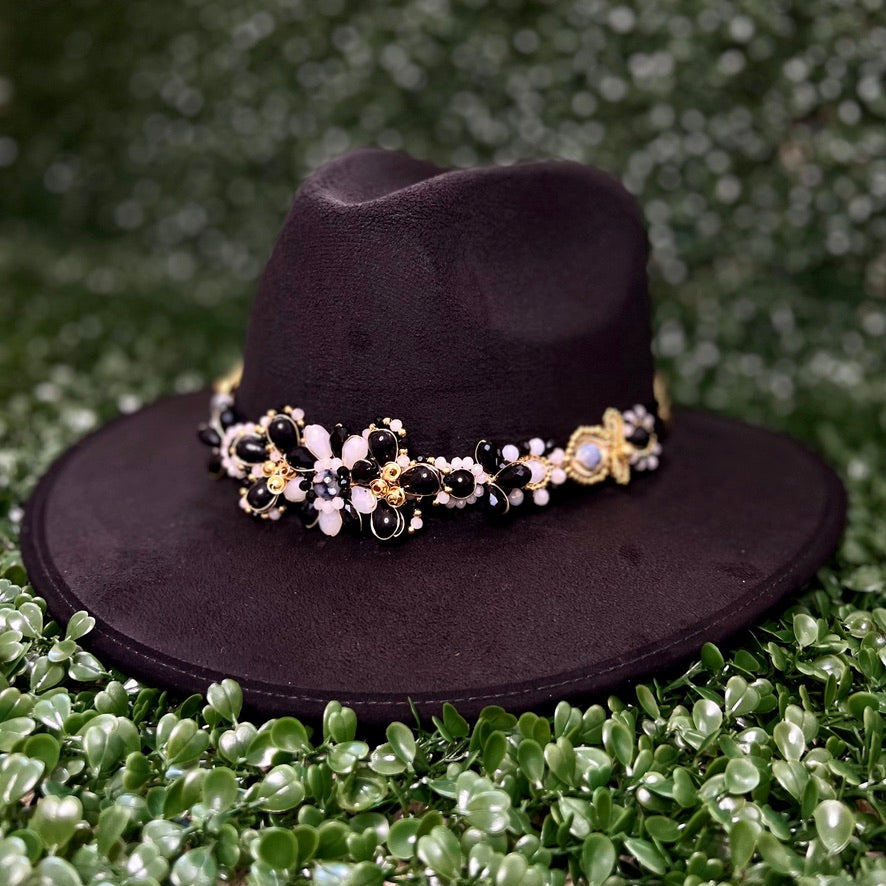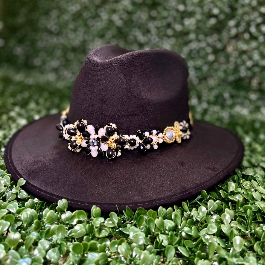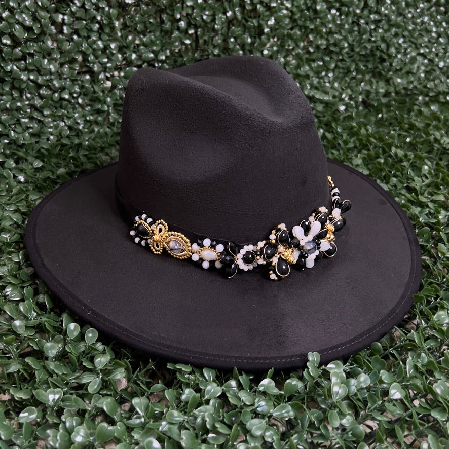 Black Sombrero de gamusa styled with traditional gemstone/crystal beaded multi-colored flower design.