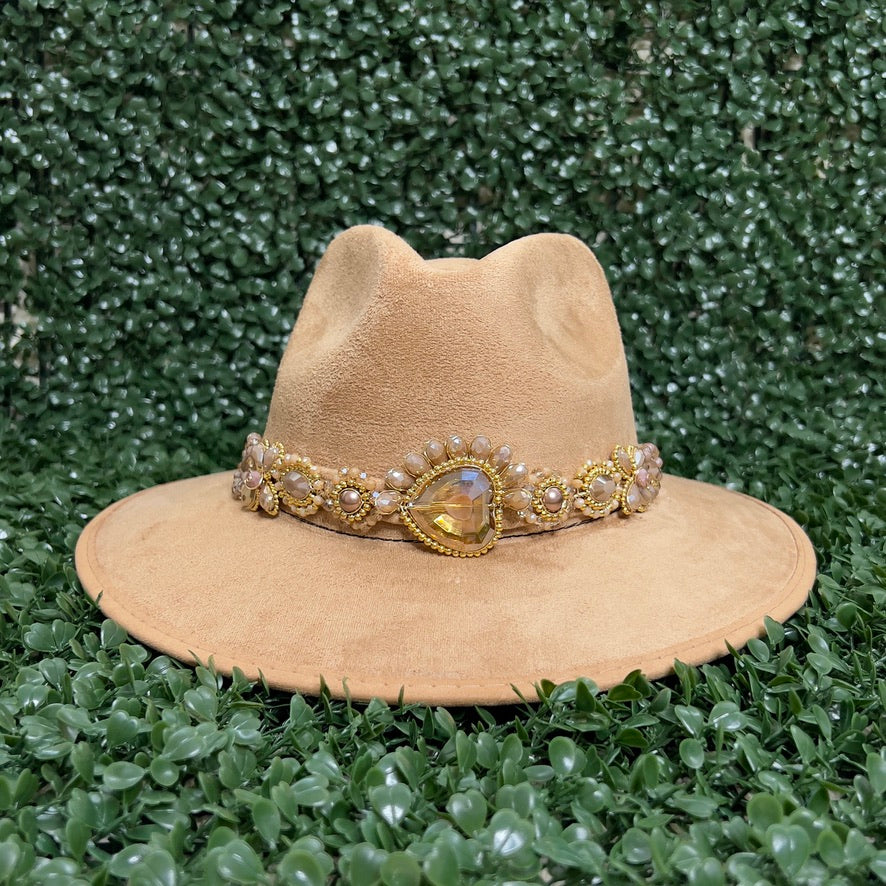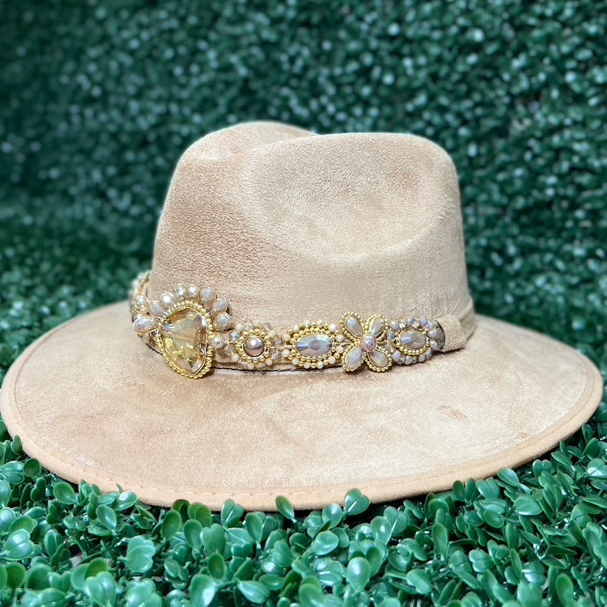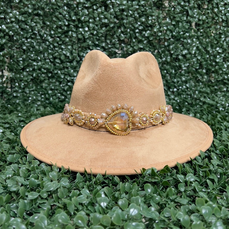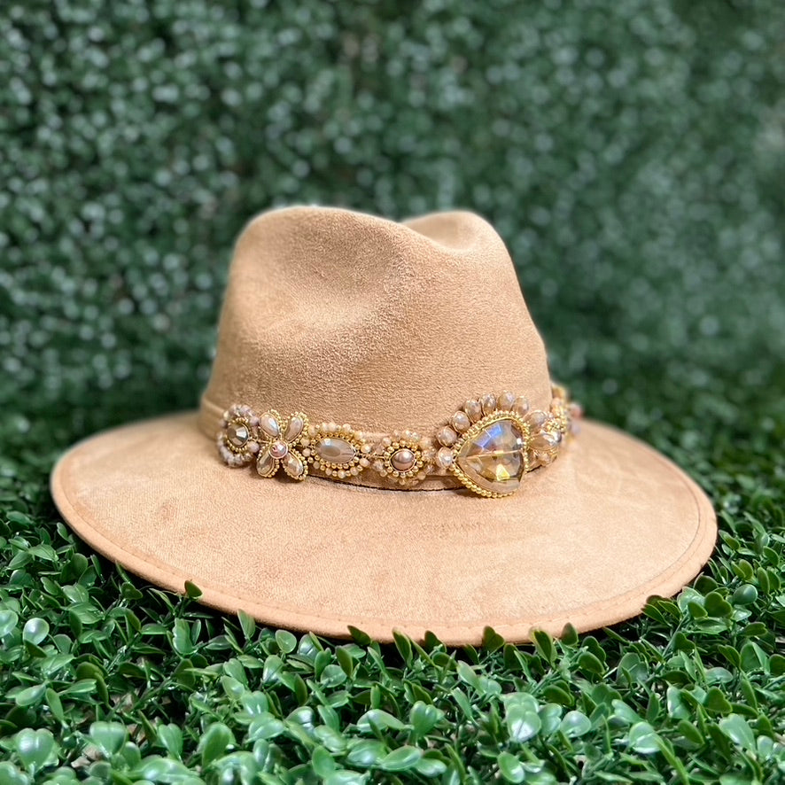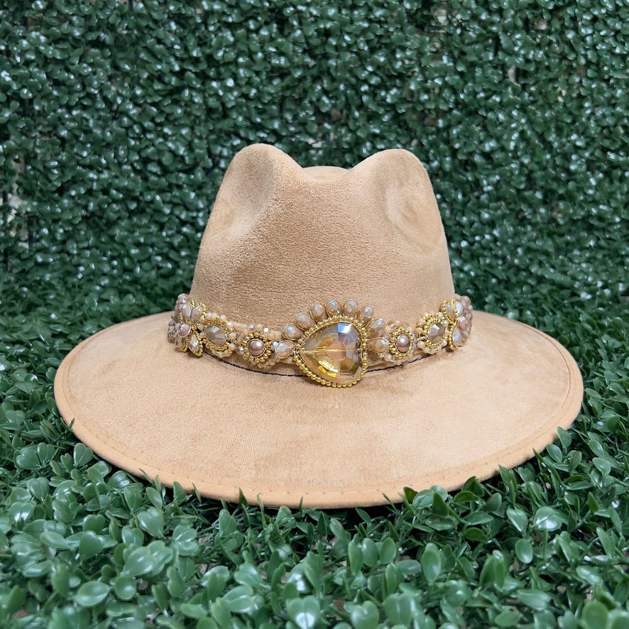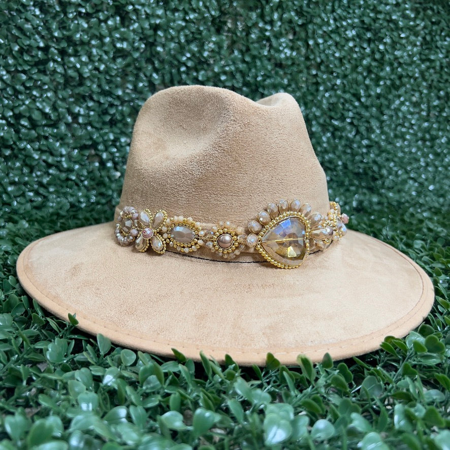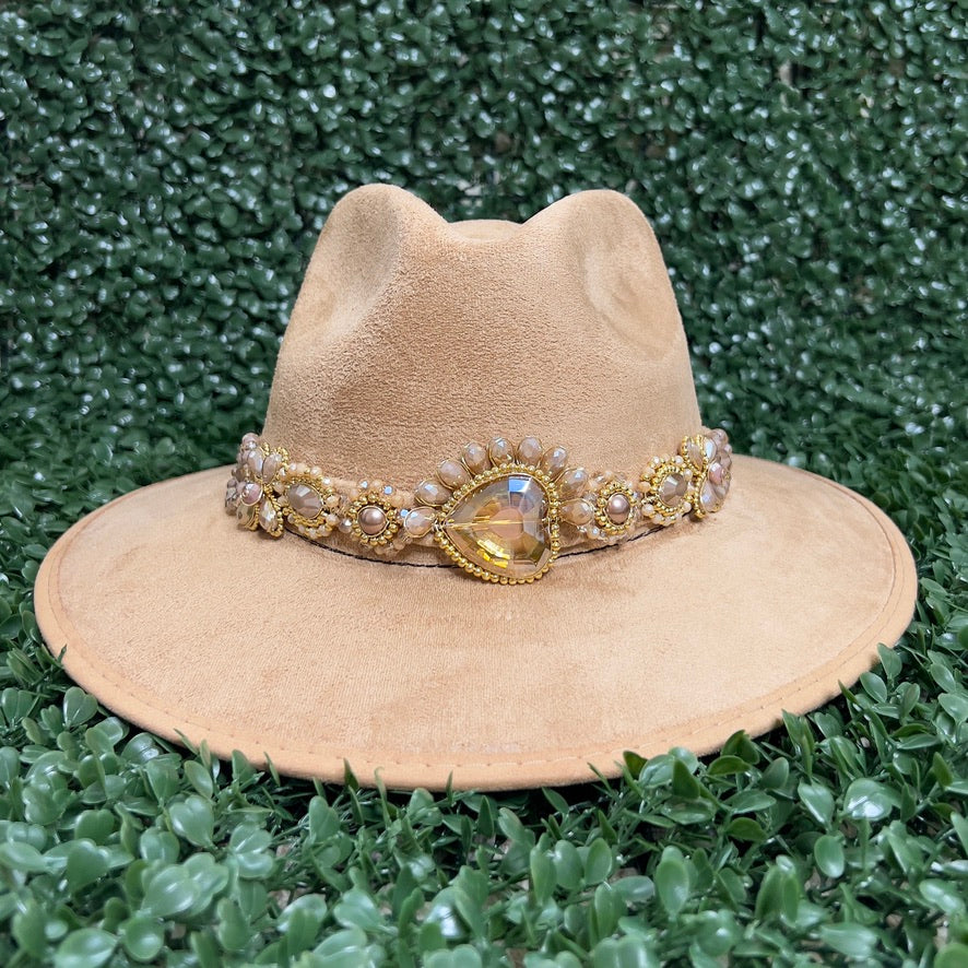 Light Brown Sombrero de gamusa styled with traditional gemstone/crystal beaded multi-colored flower design.