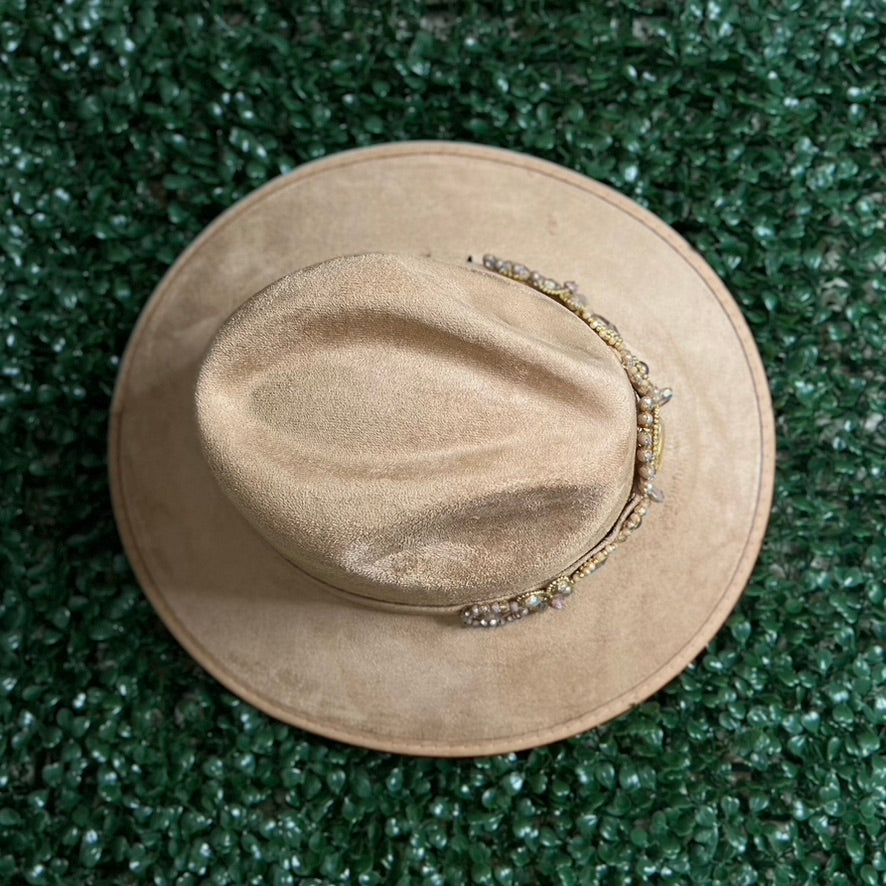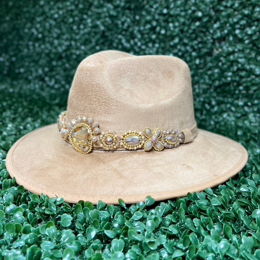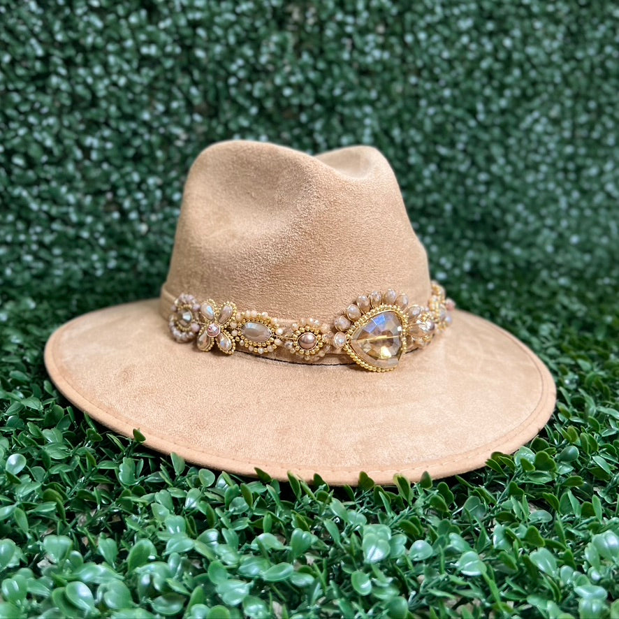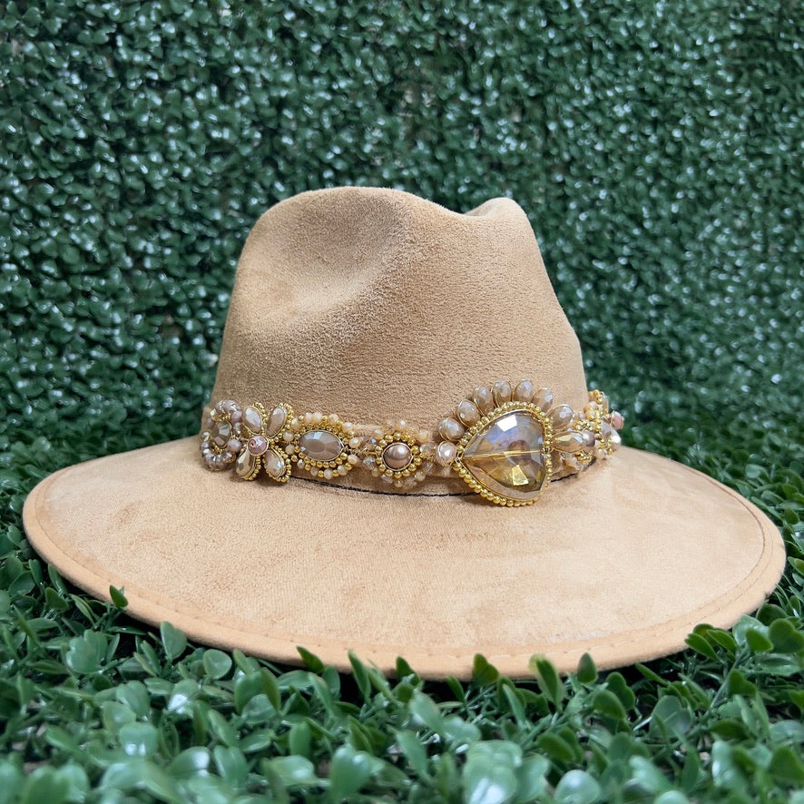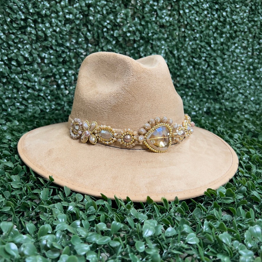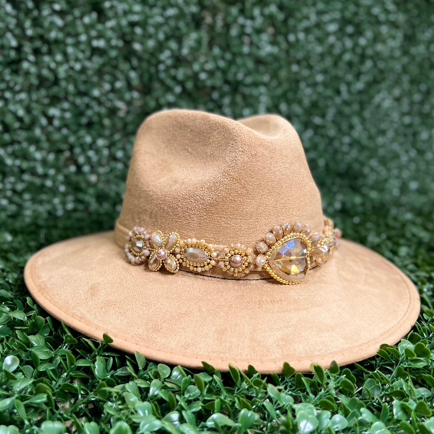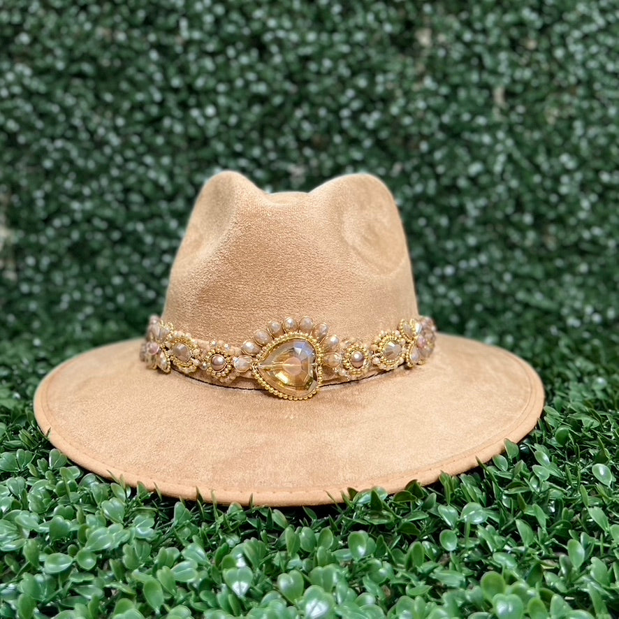 Light Brown Sombrero de gamusa styled with traditional gemstone/crystal beaded multi-colored flower design.