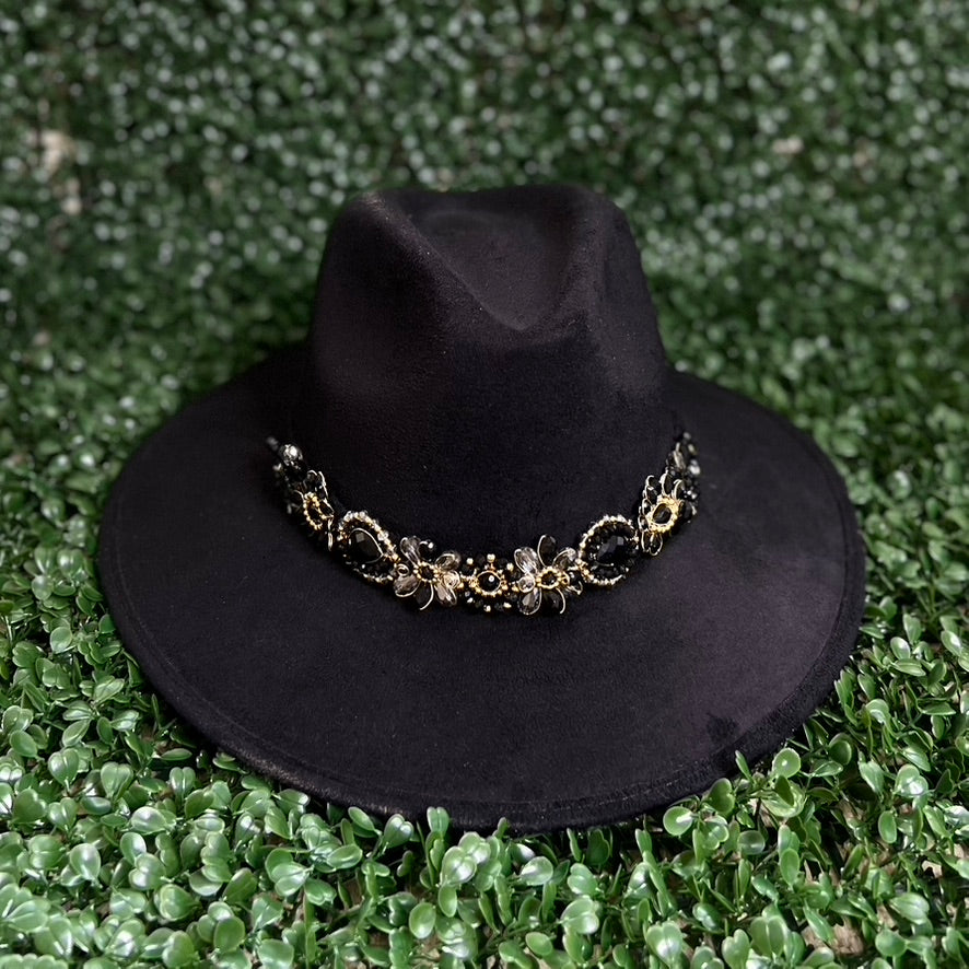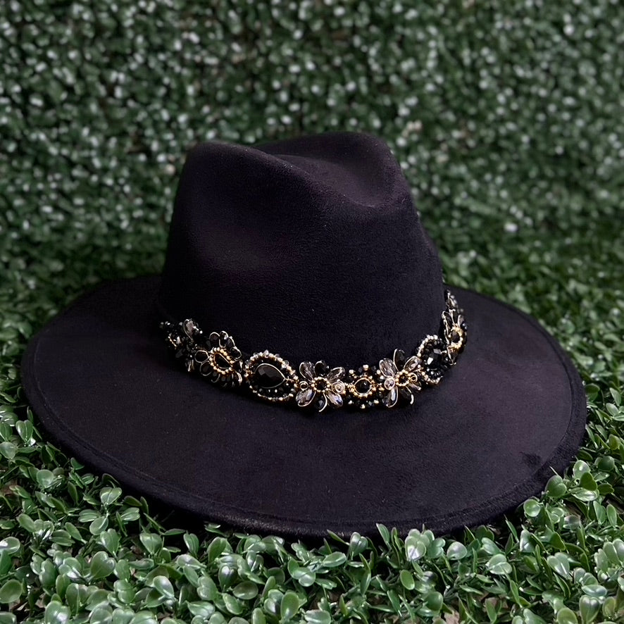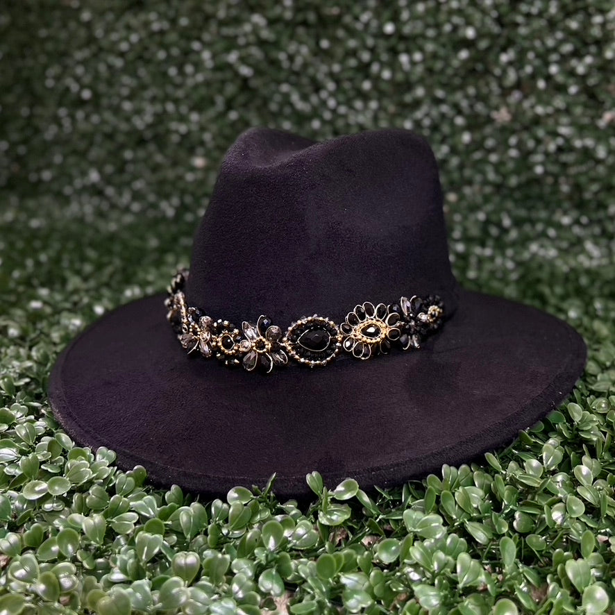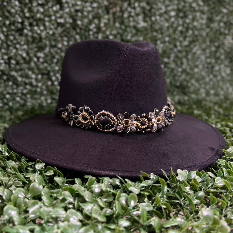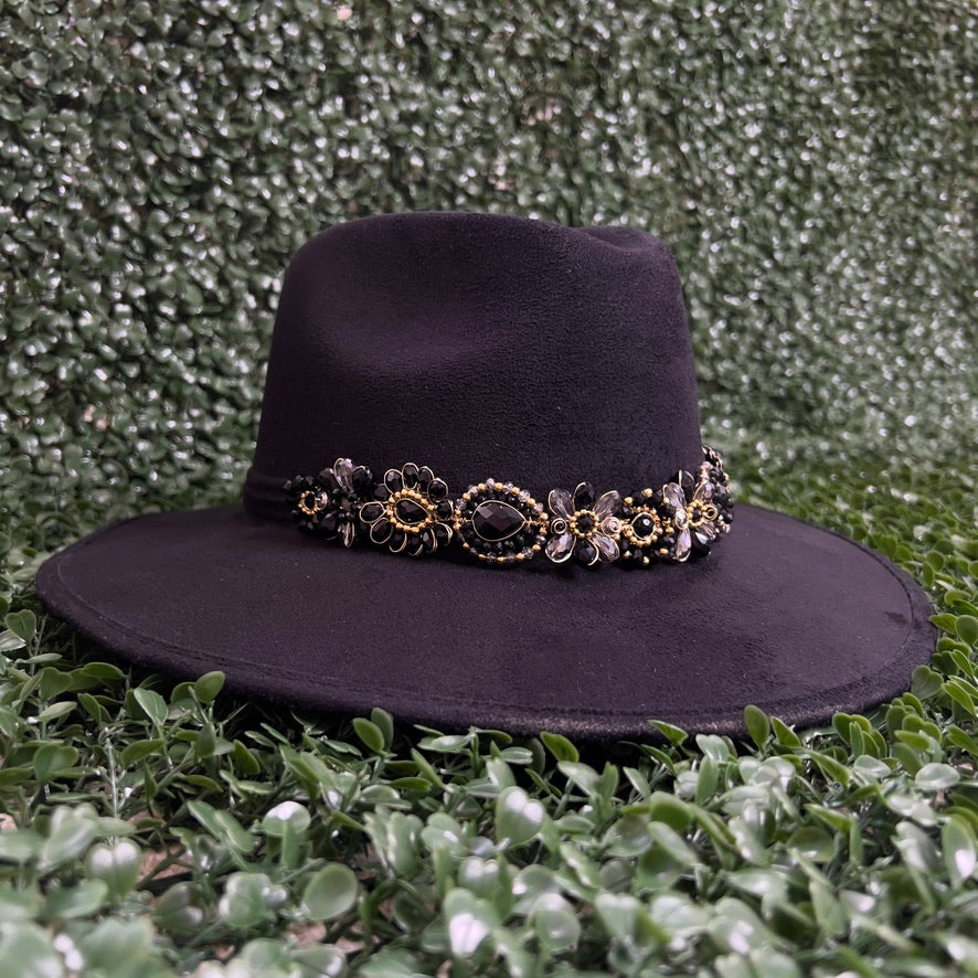 Black Sombrero de gamusa styled with traditional gemstone/crystal beaded multi-colored flower design.