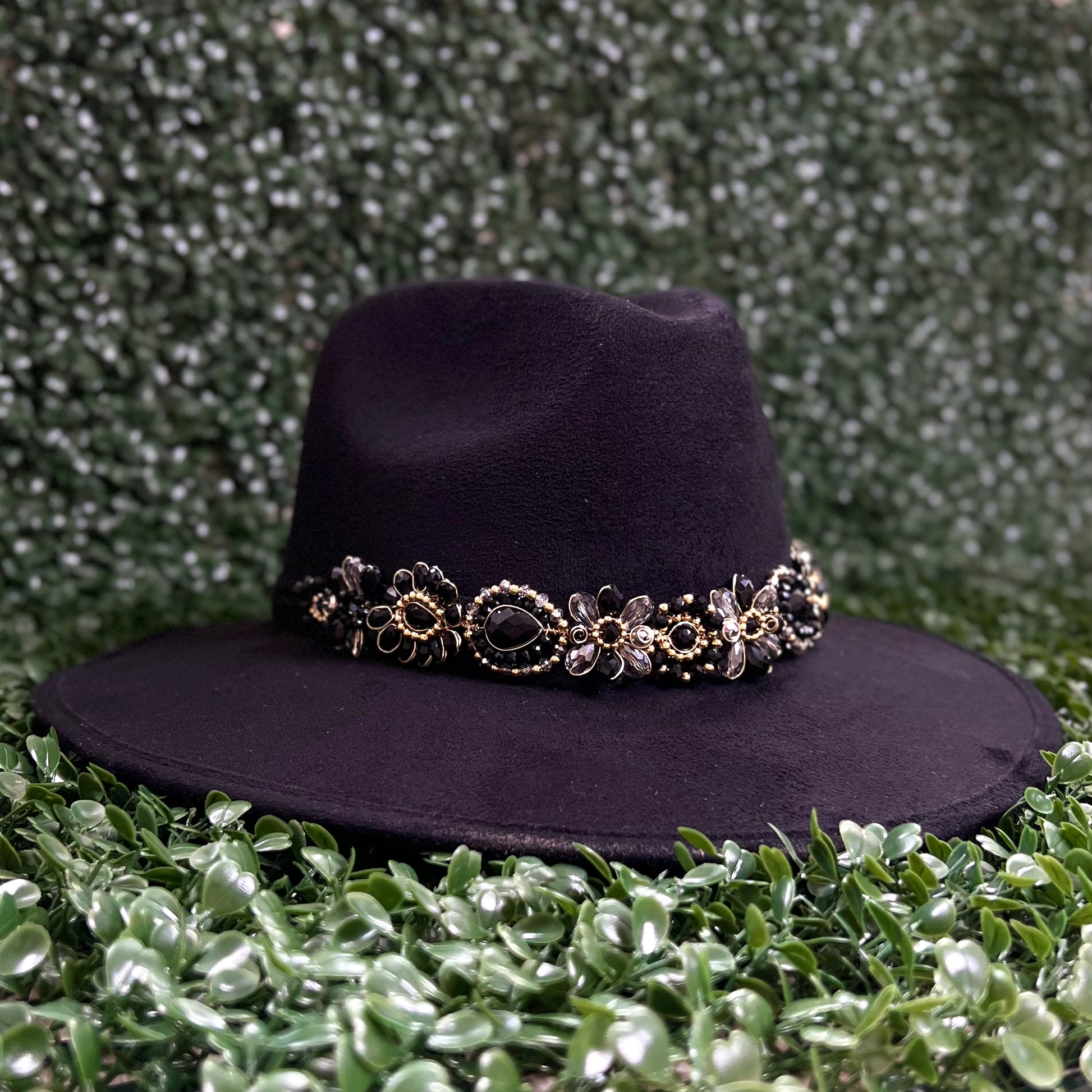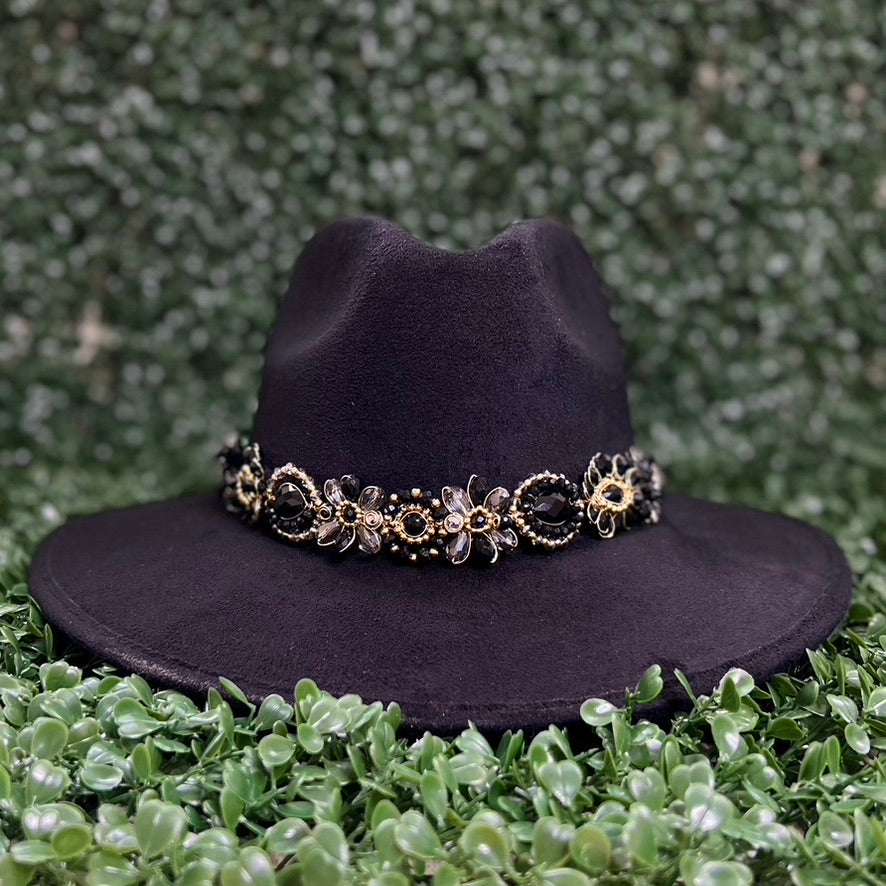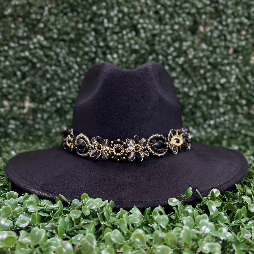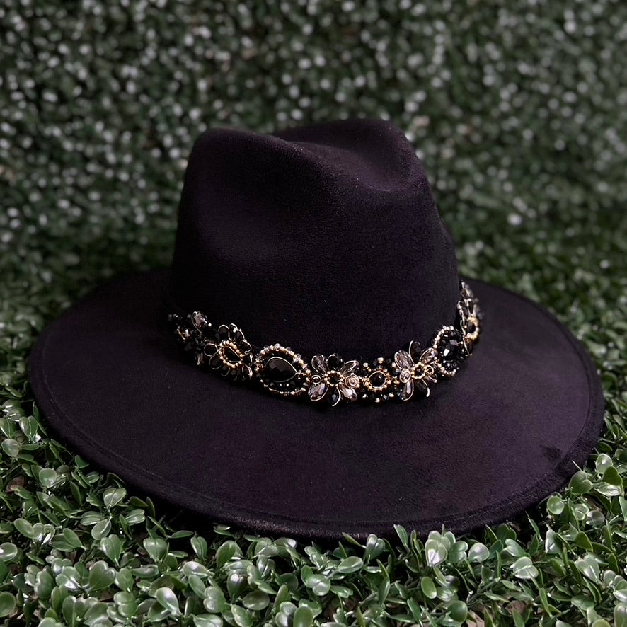 Black Sombrero de gamusa styled with traditional gemstone/crystal beaded multi-colored flower design.