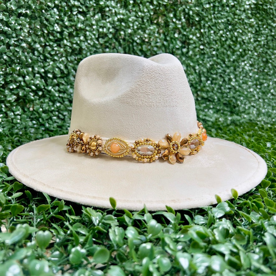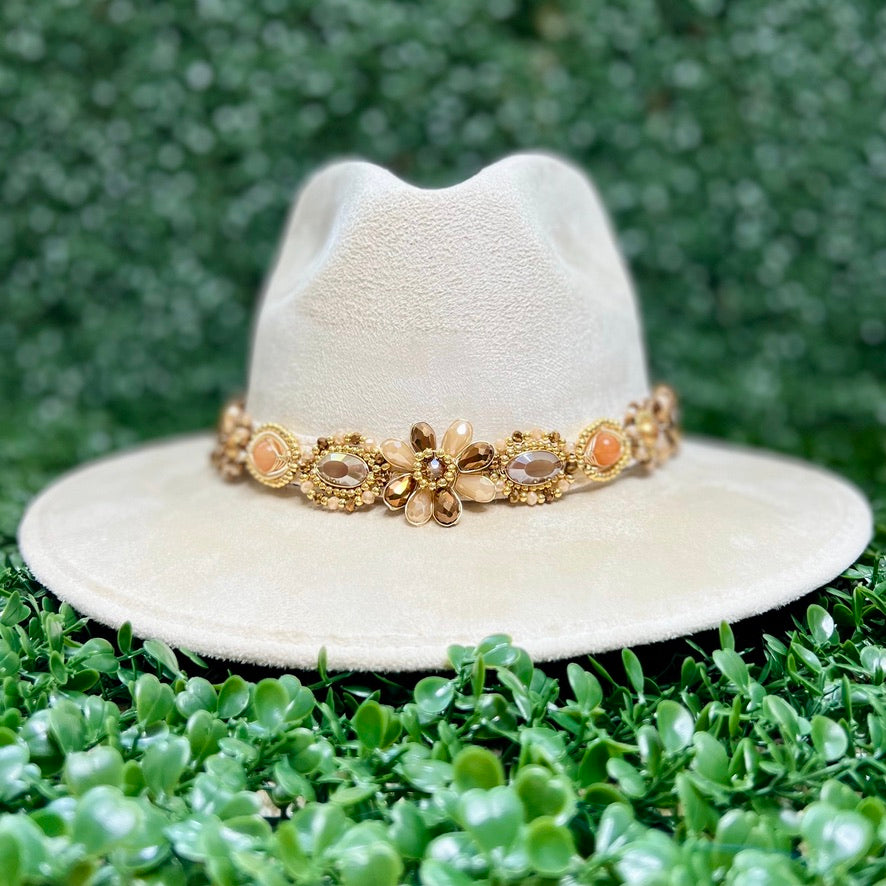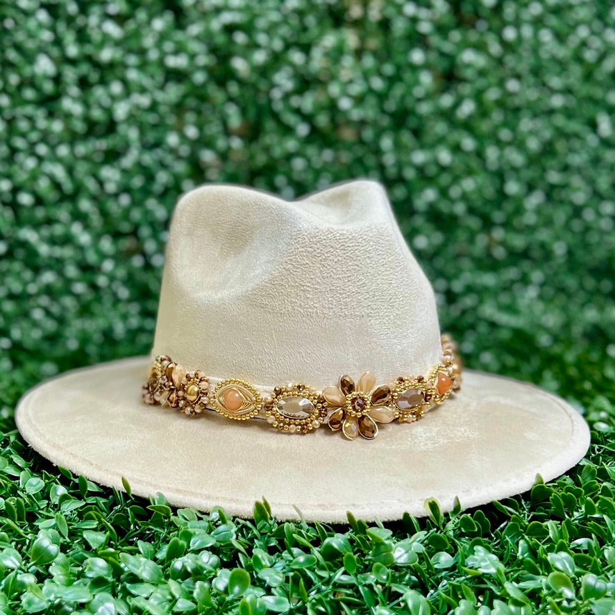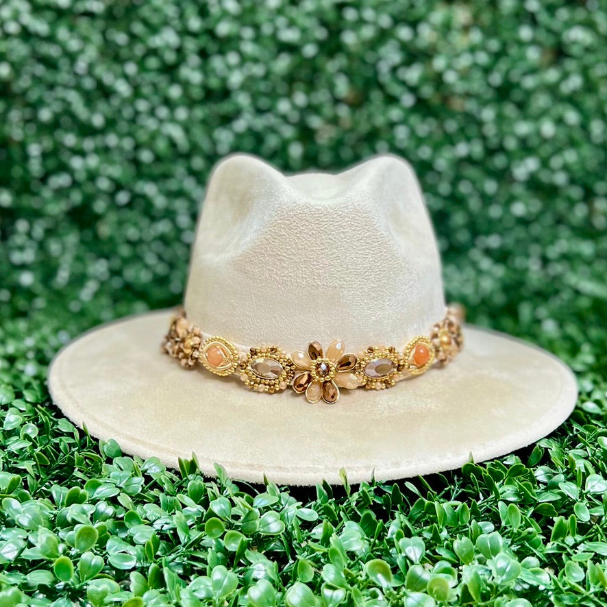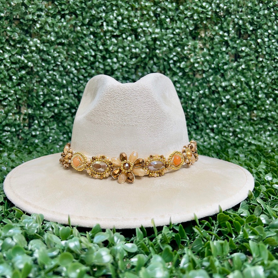 White Sombrero de gamusa styled with traditional gemstone/crystal beaded multi-colored flower design.