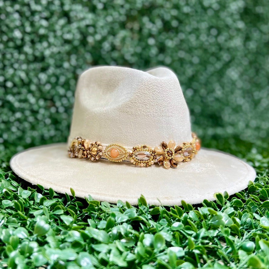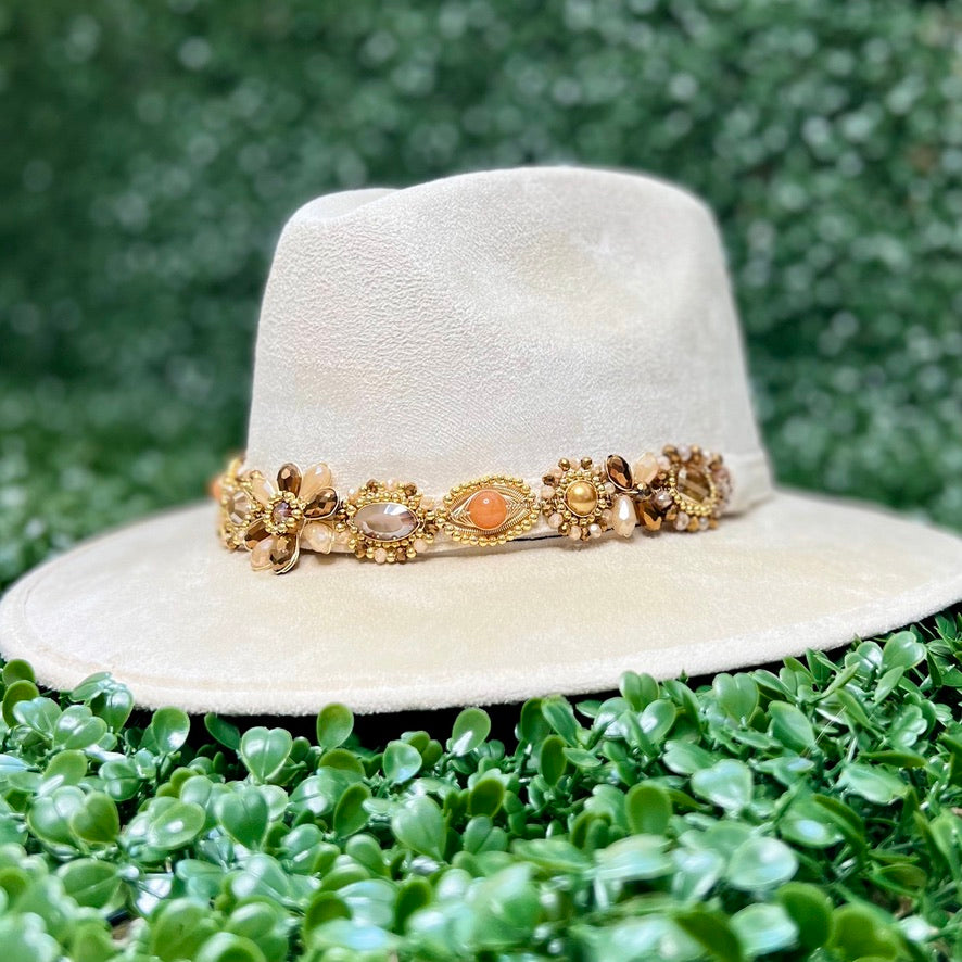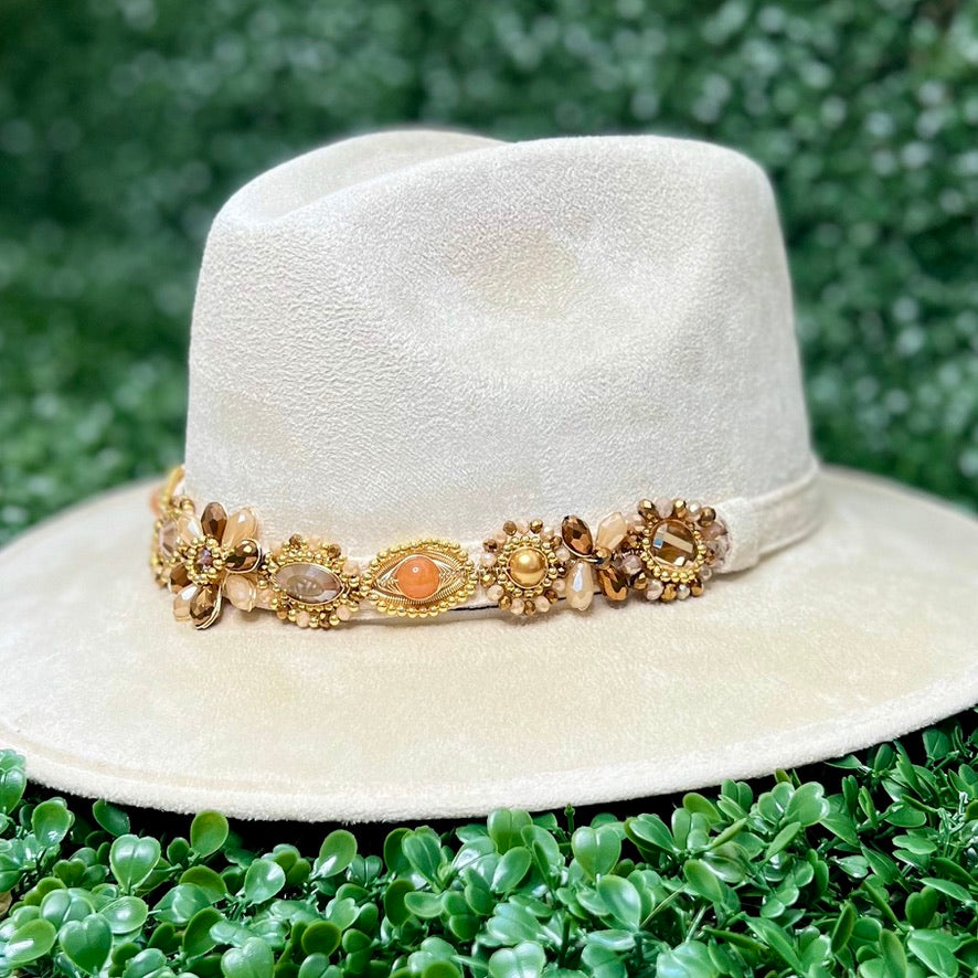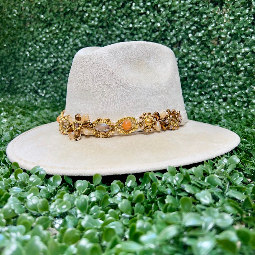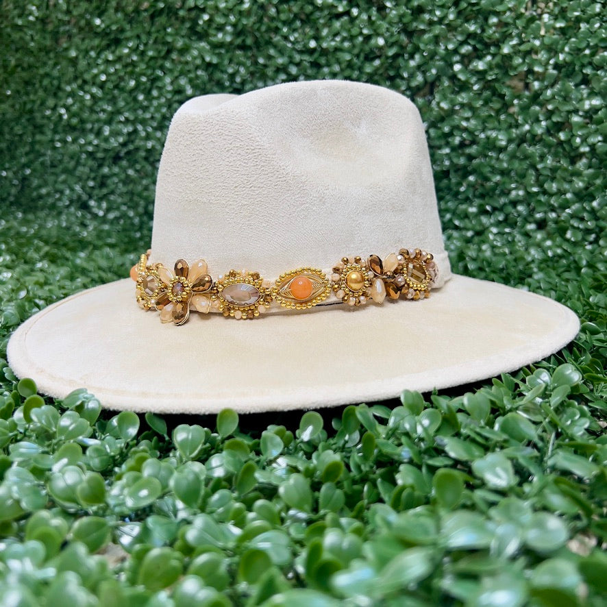 White Sombrero de gamusa styled with traditional gemstone/crystal beaded multi-colored flower design.