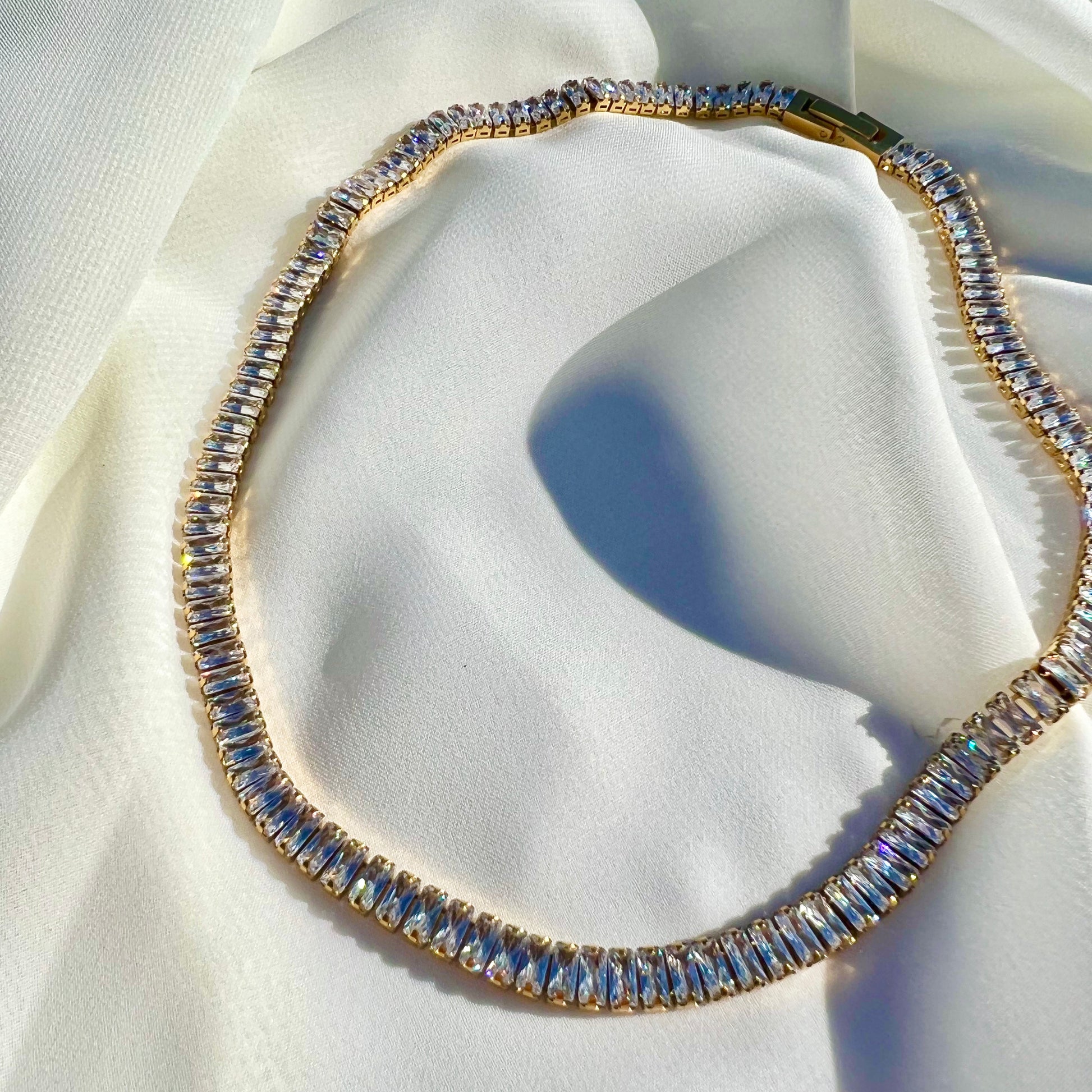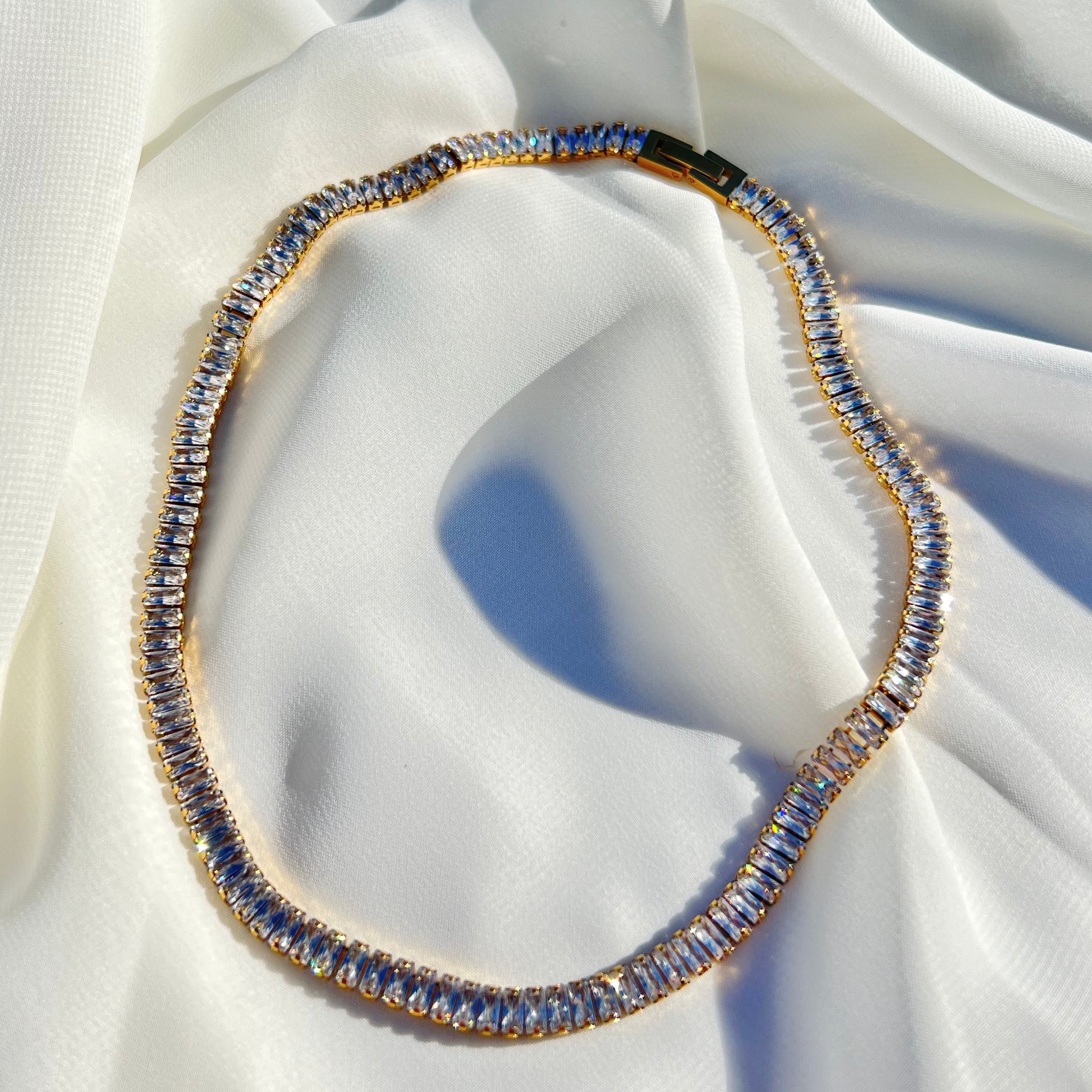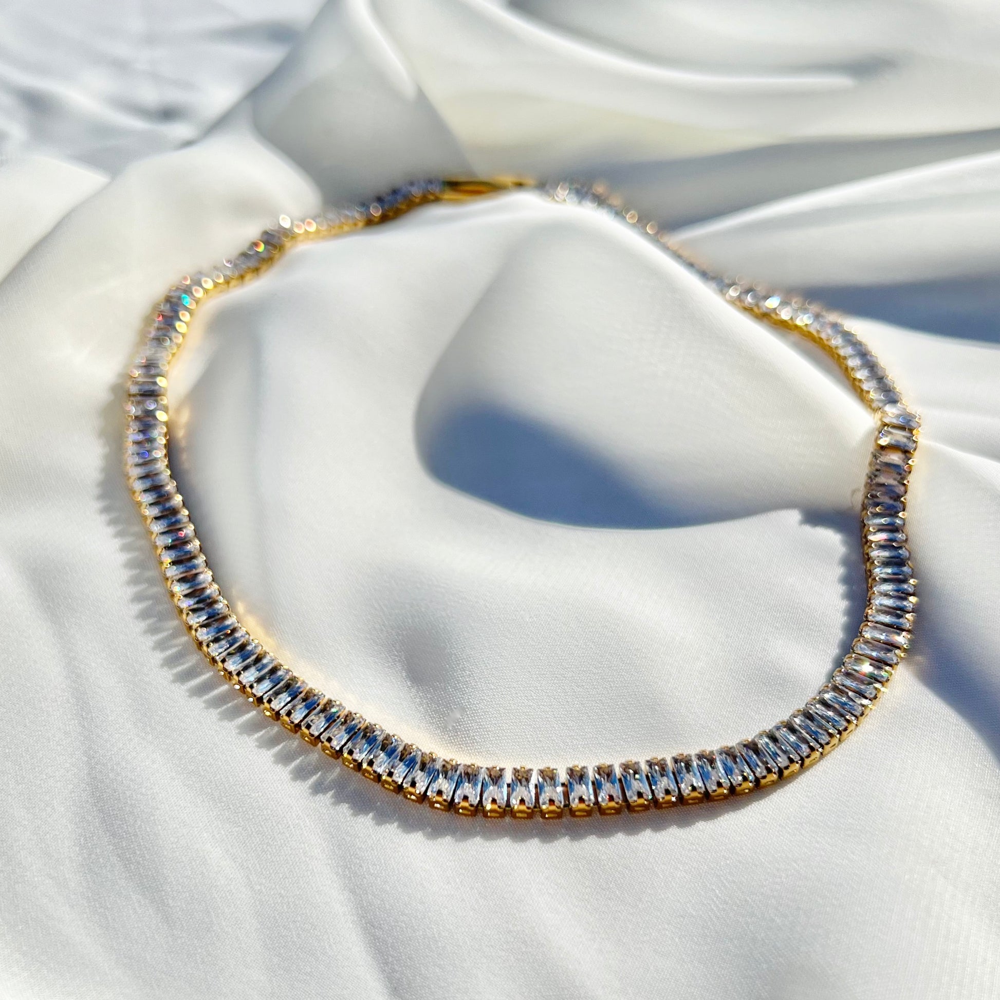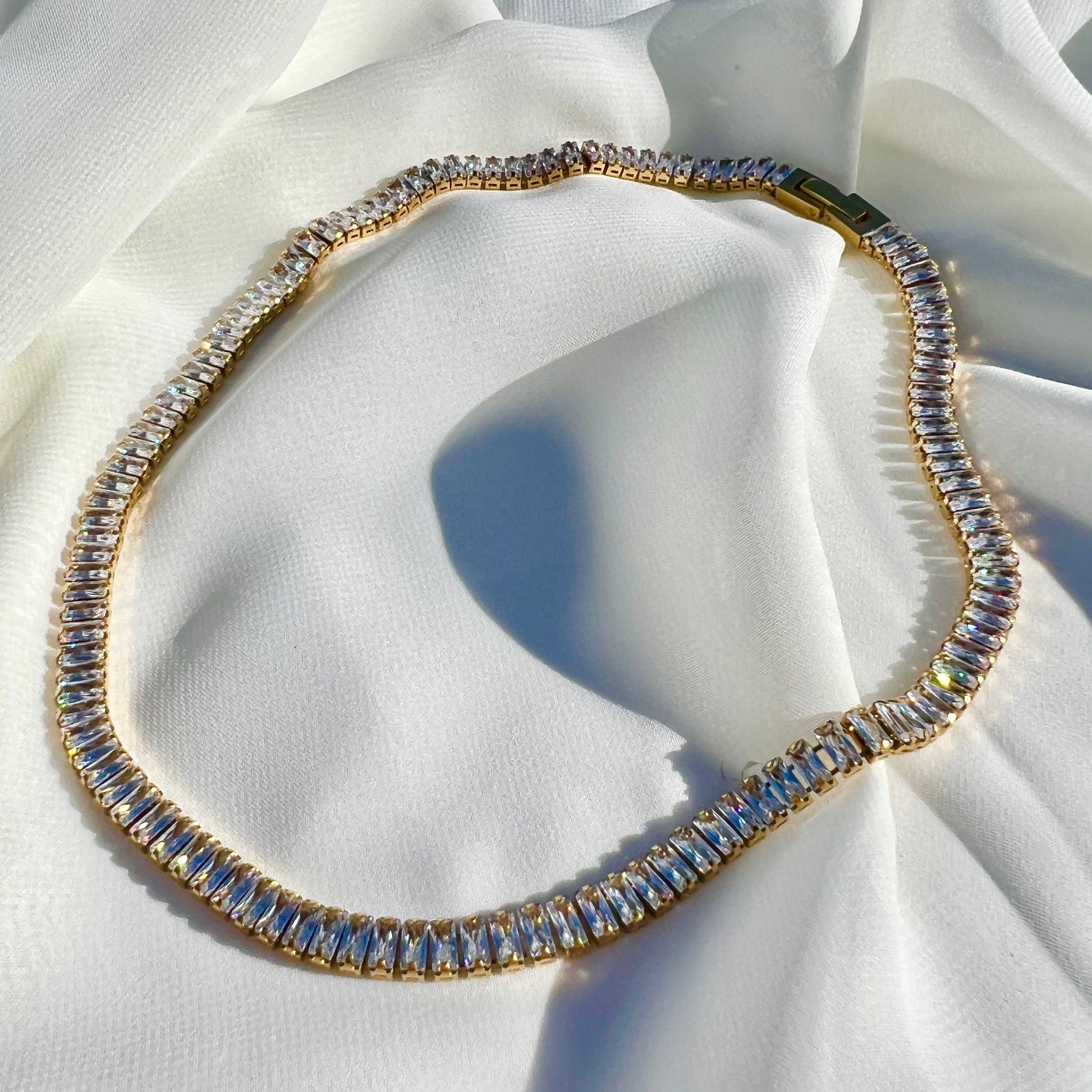 Luxury Non Tarnish & Waterproof Shiny Baguette 18K Gold Plated Statement Zirconia Stainless Steel crystal Necklace.