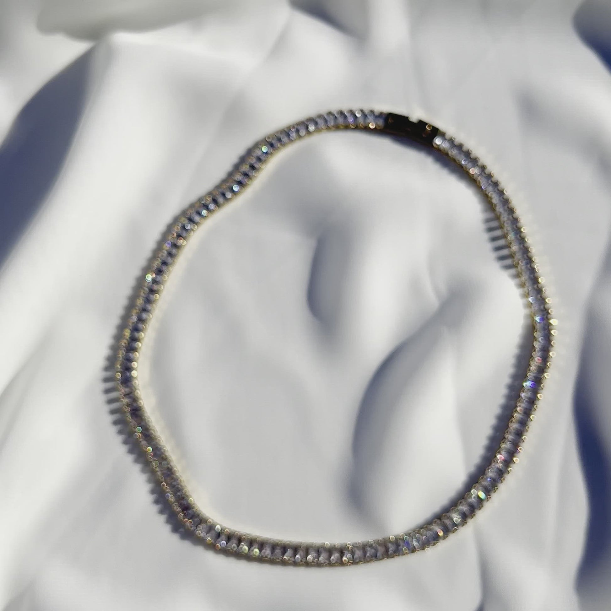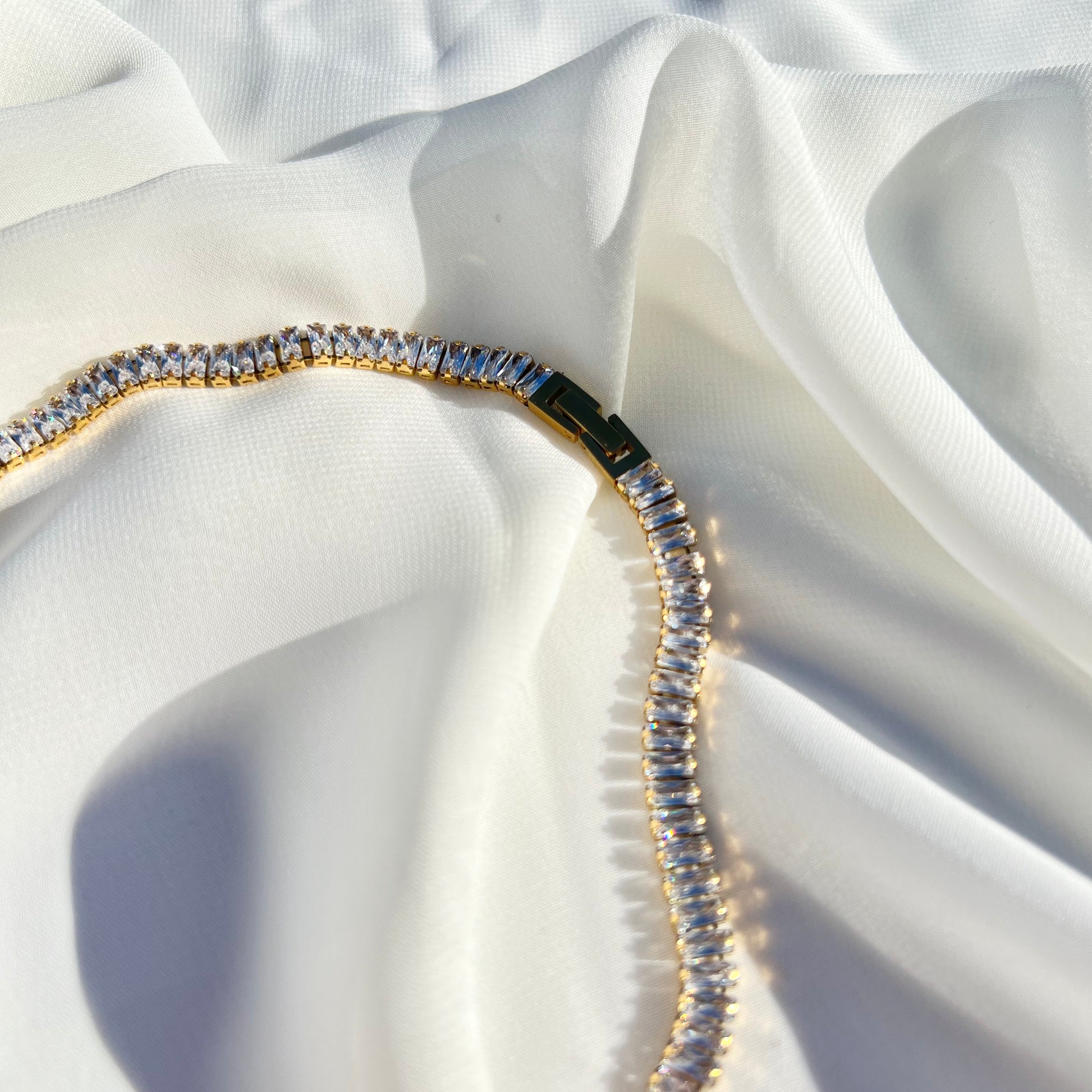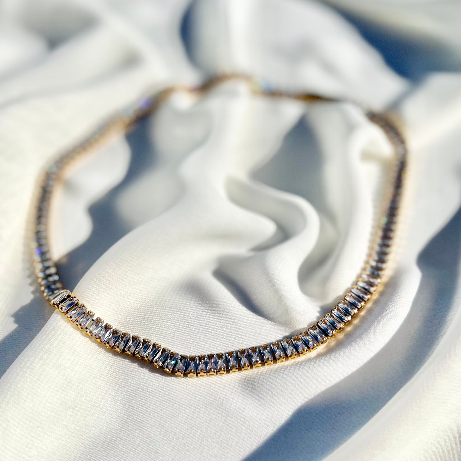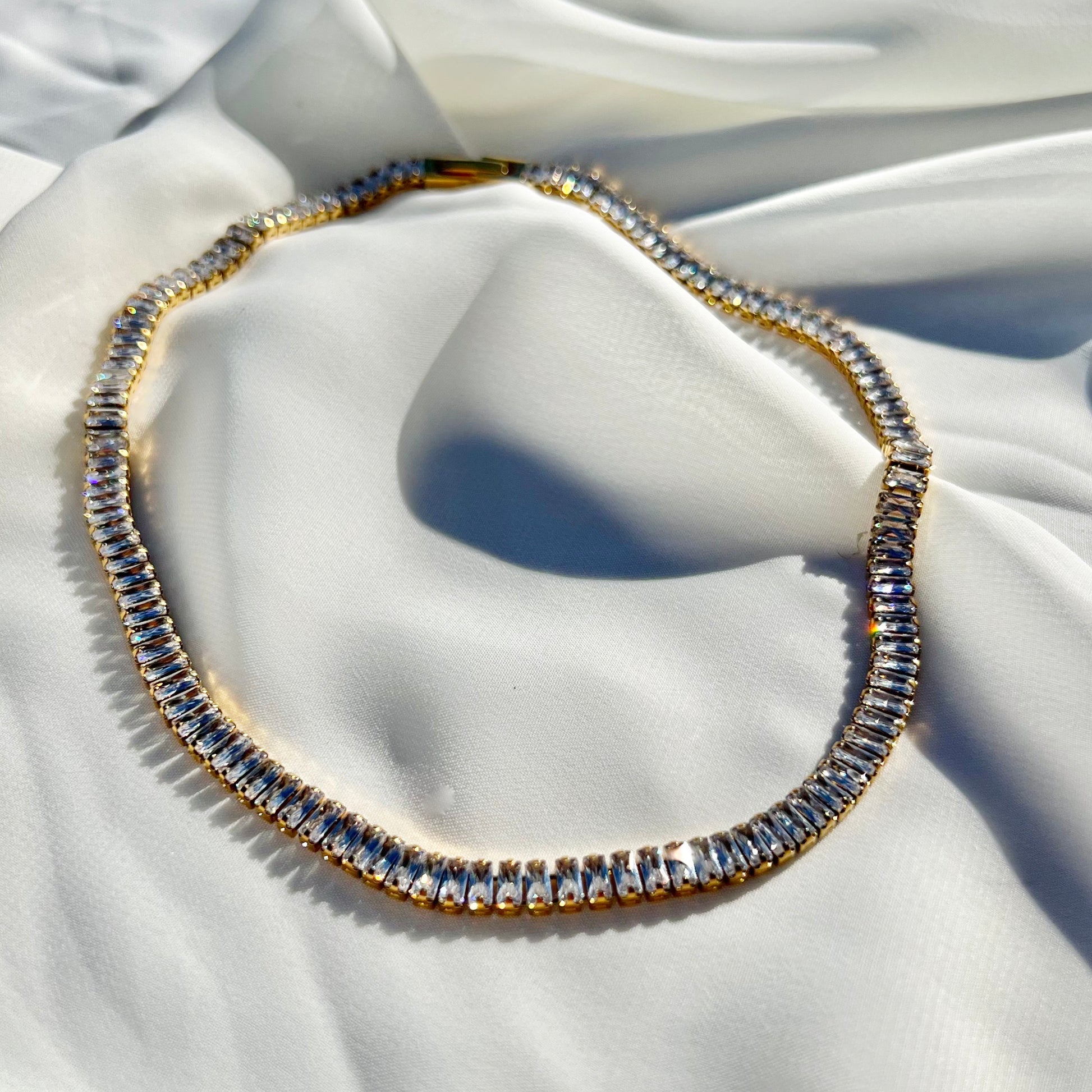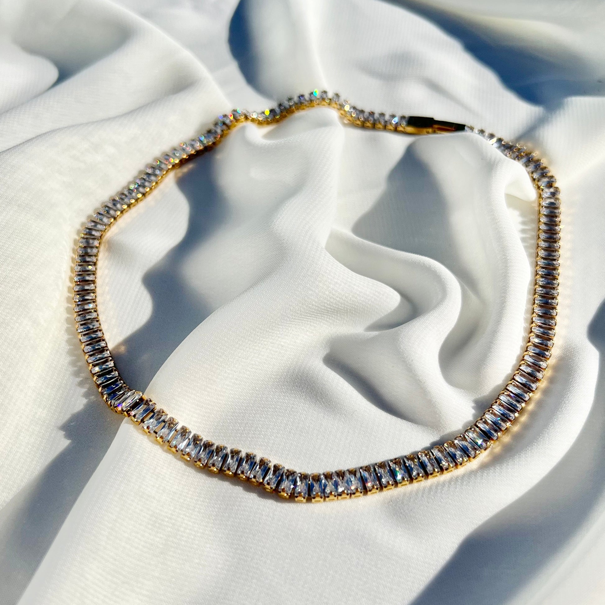 Luxury Non Tarnish & Waterproof Shiny Baguette 18K Gold Plated Statement Zirconia Stainless Steel crystal Necklace.
