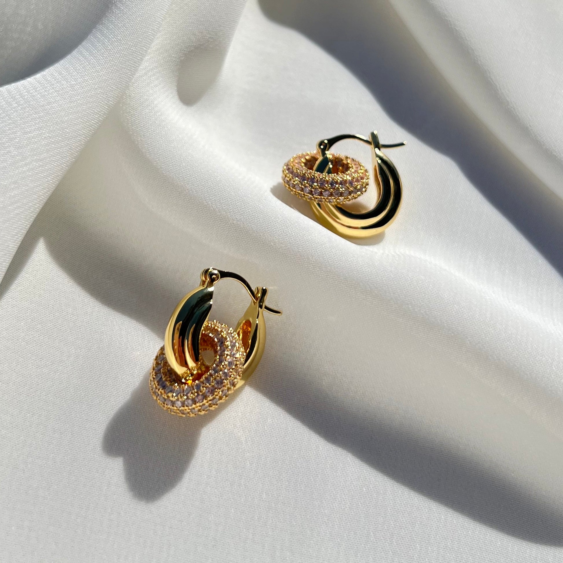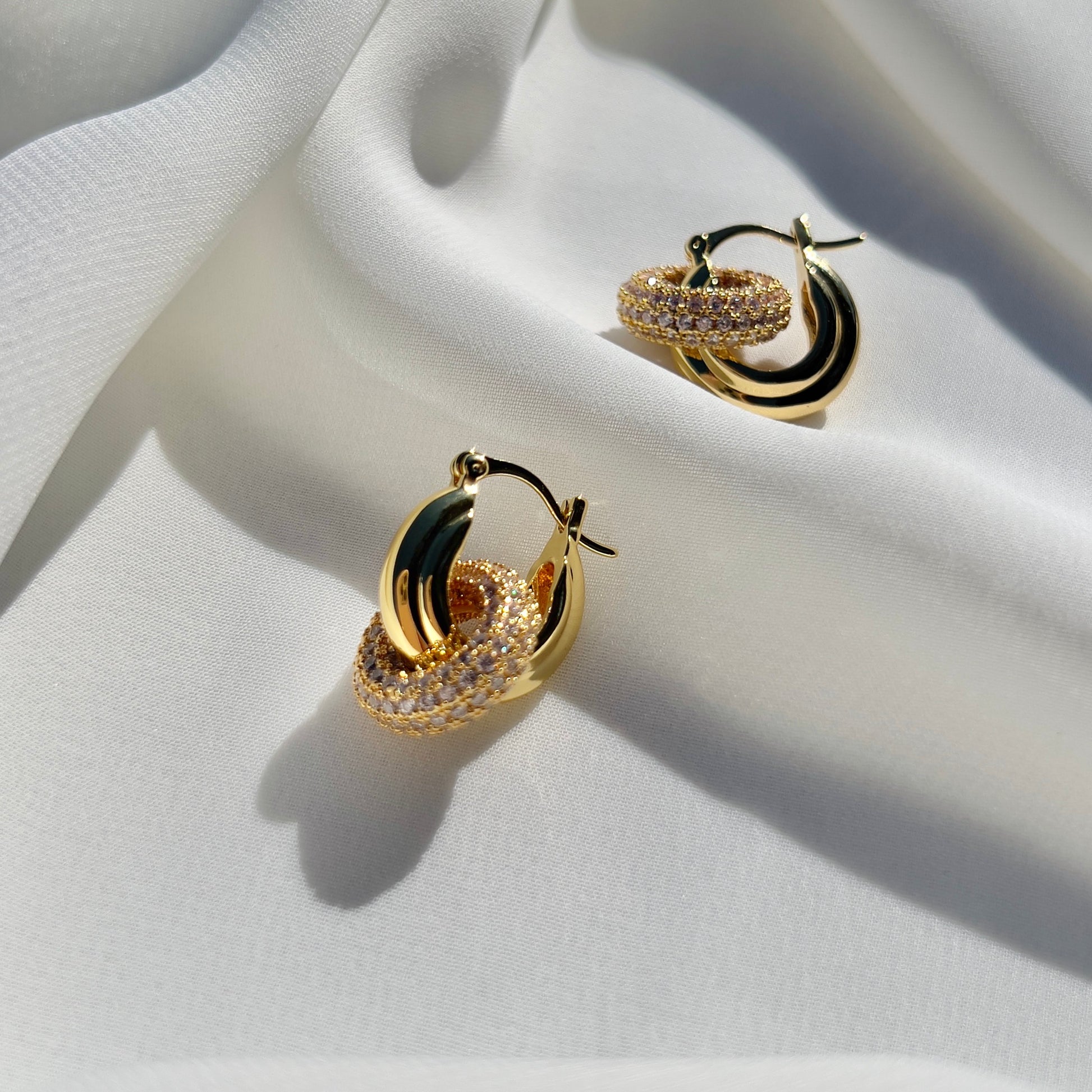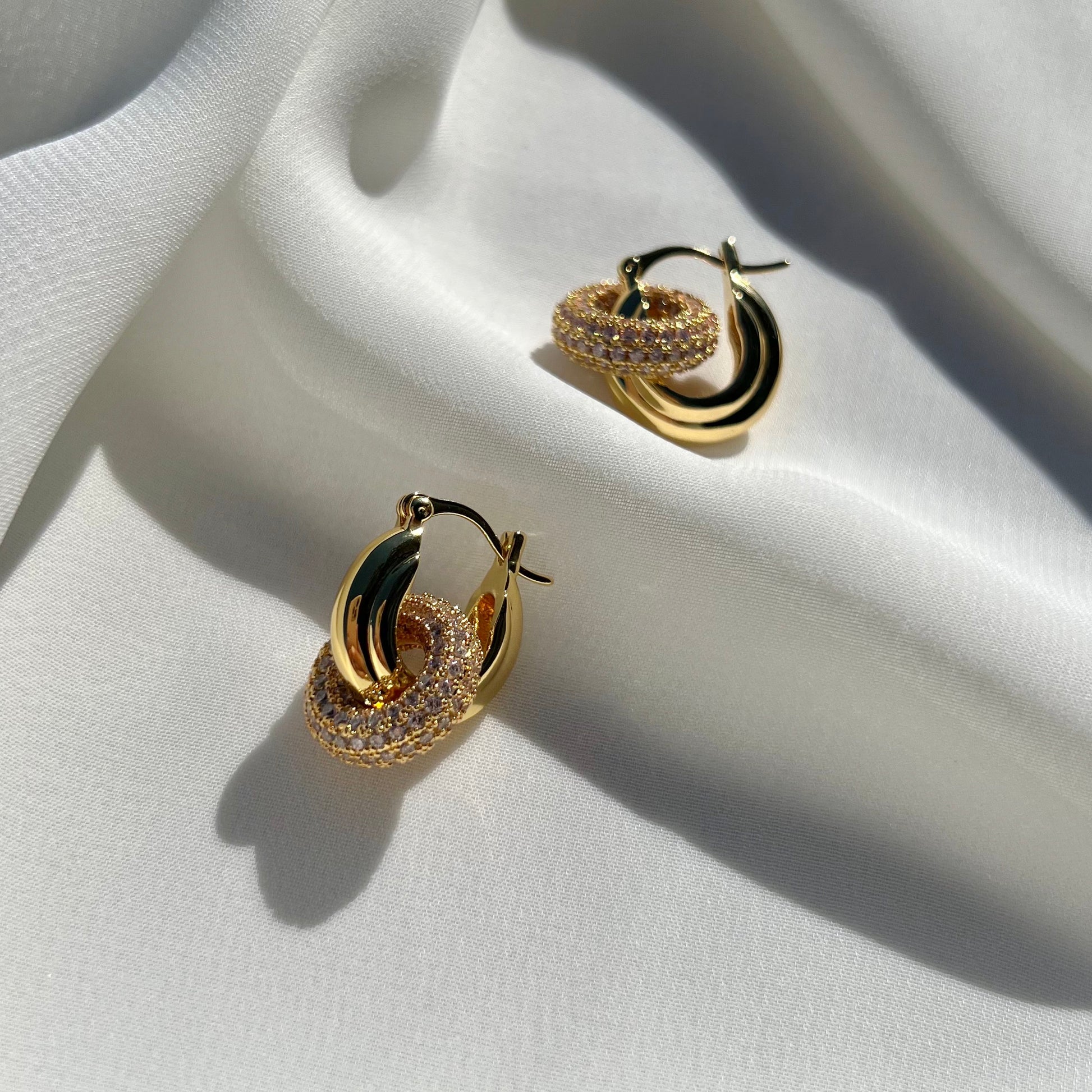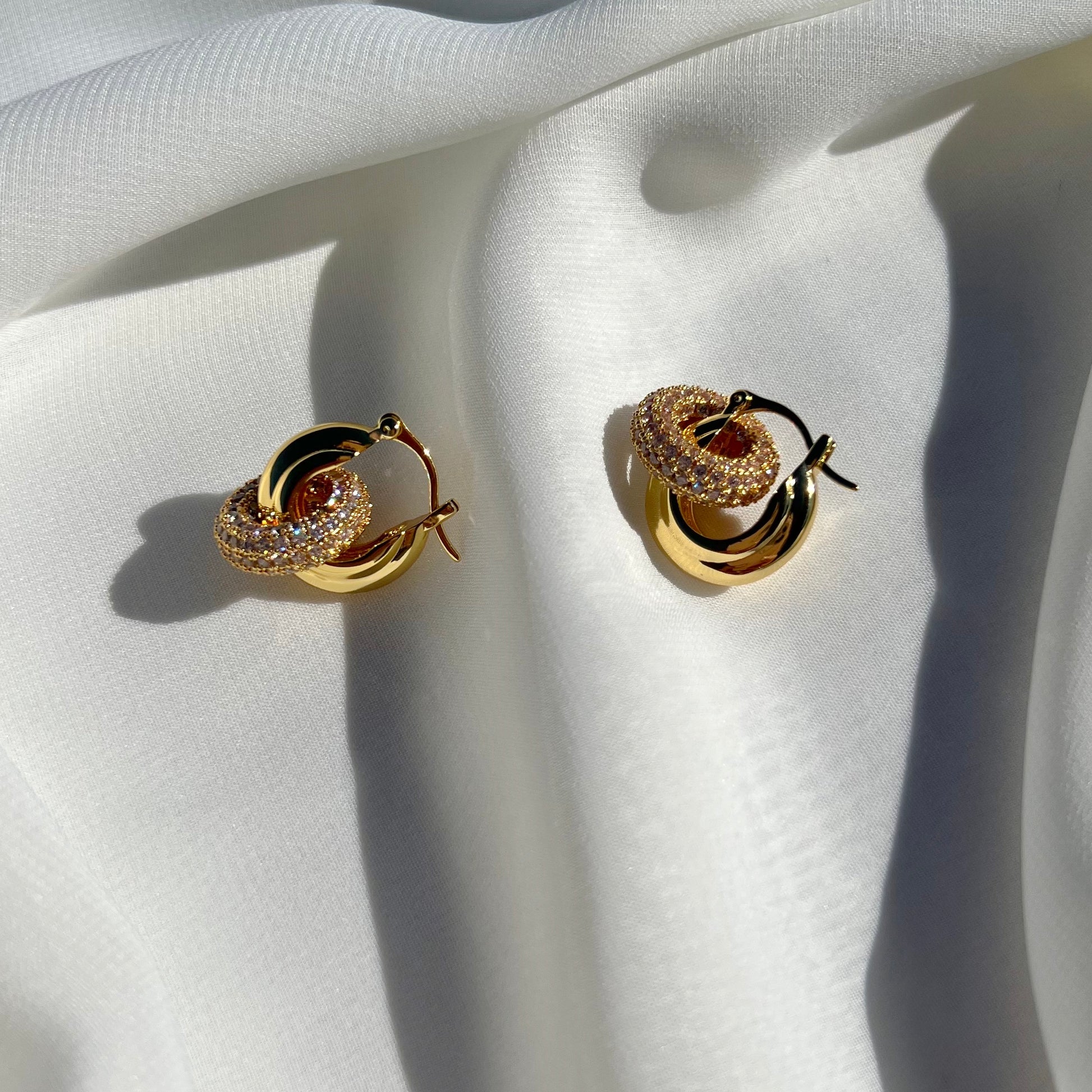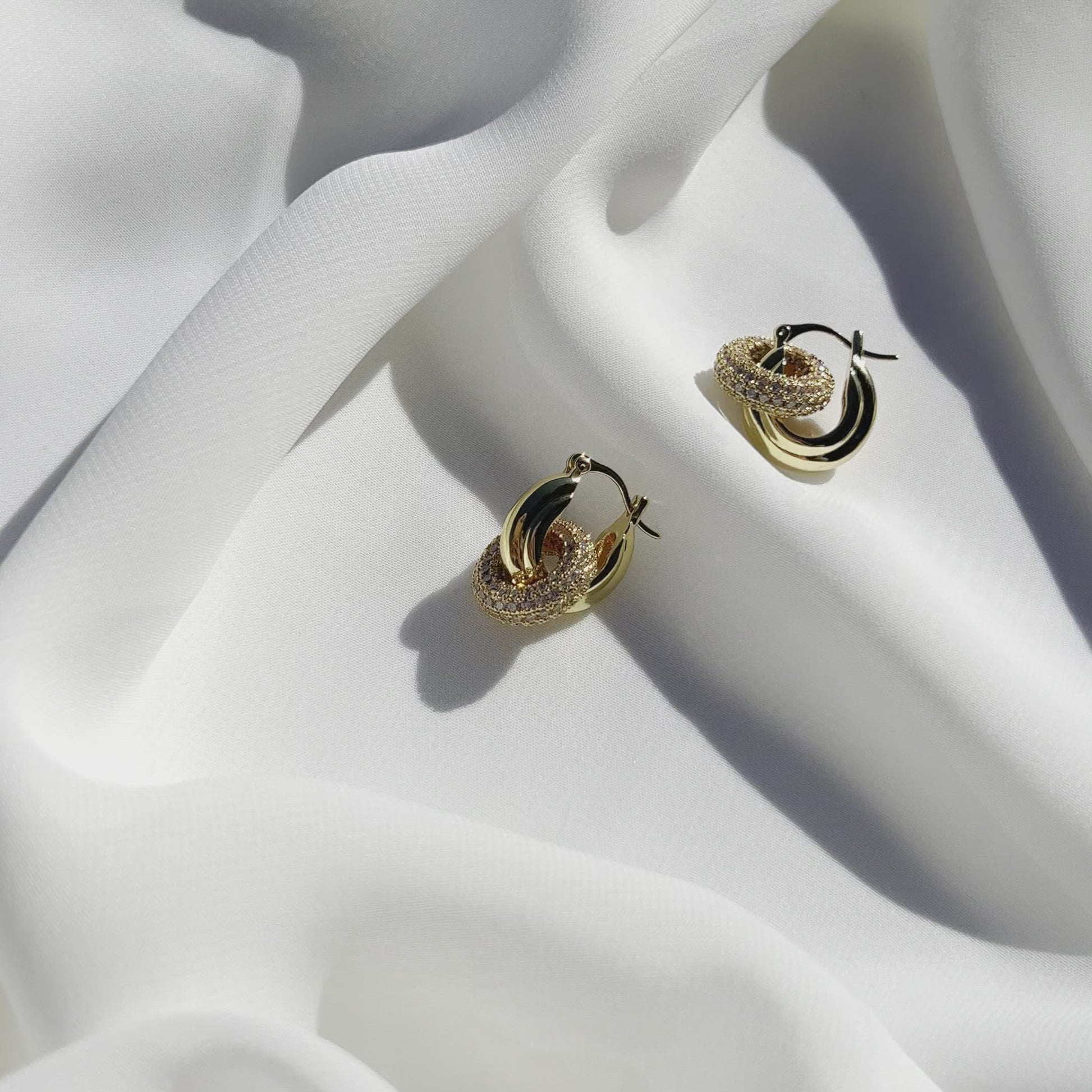 Gold Brass Vintage Studded Zircon earrings, double ring stud geometric round detachable multi-purpose hoop earrings.