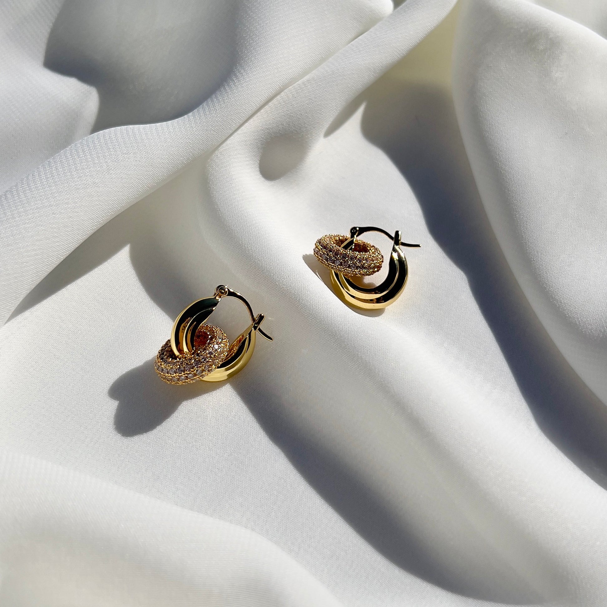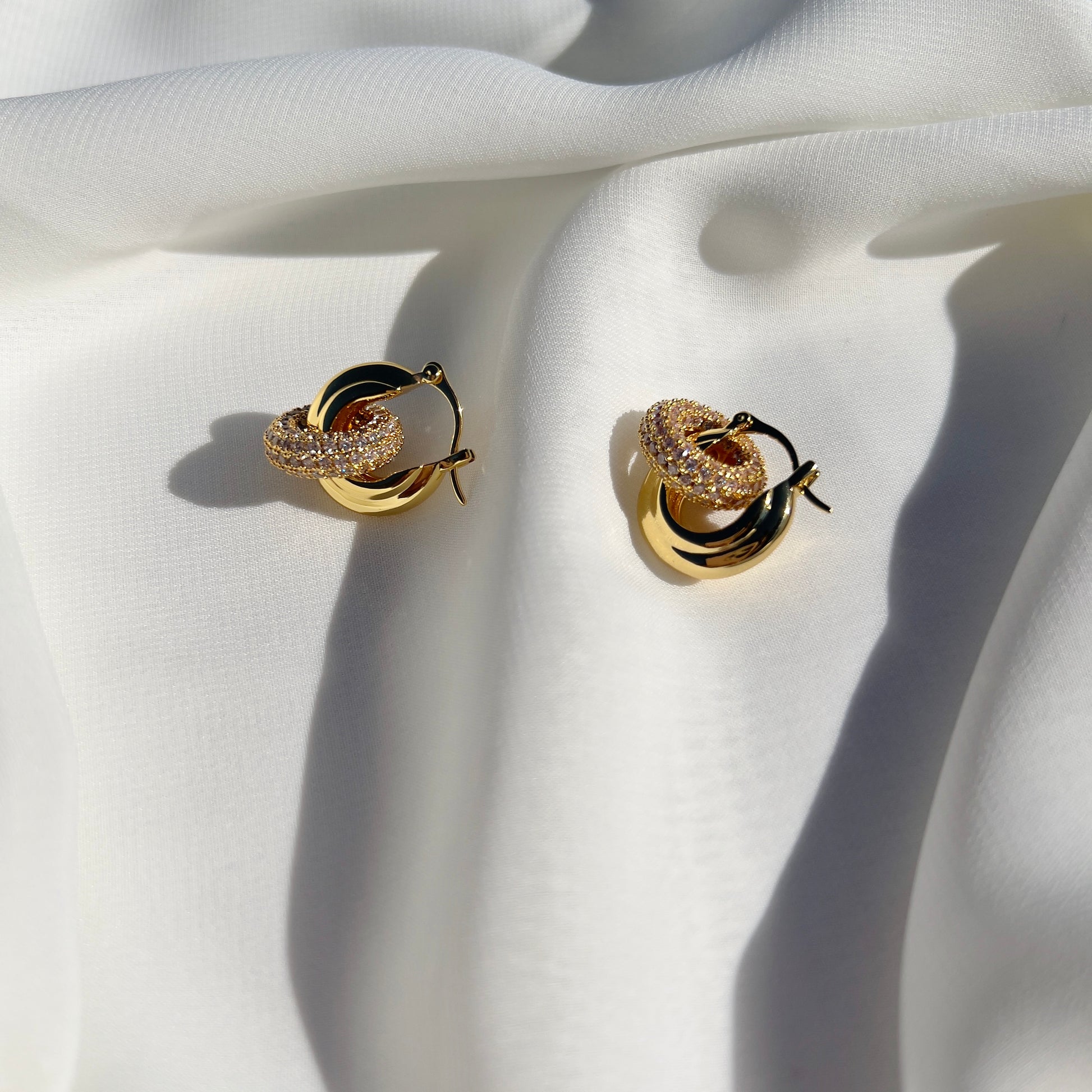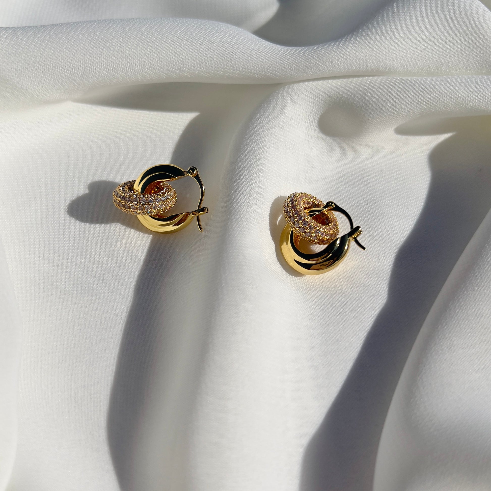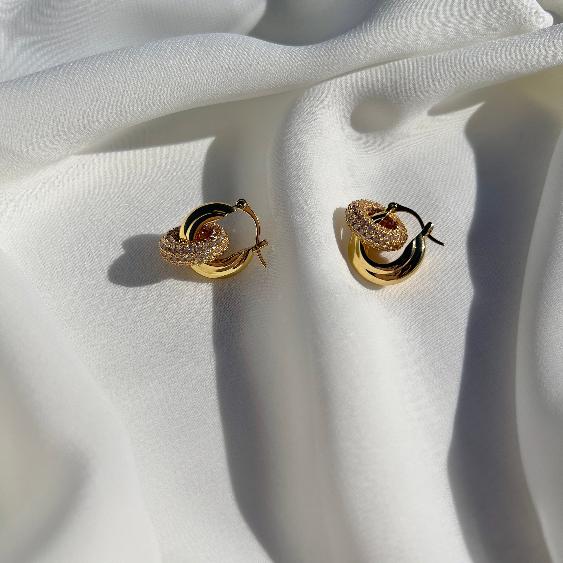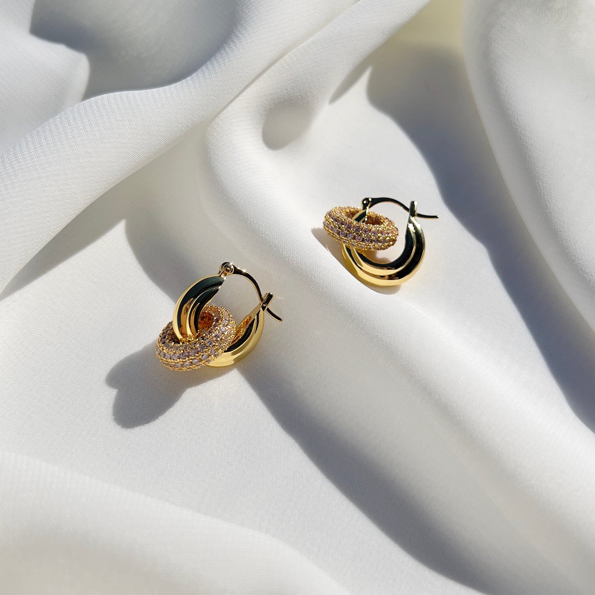 Gold Brass Vintage Studded Zircon earrings, double ring stud geometric round detachable multi-purpose hoop earrings.