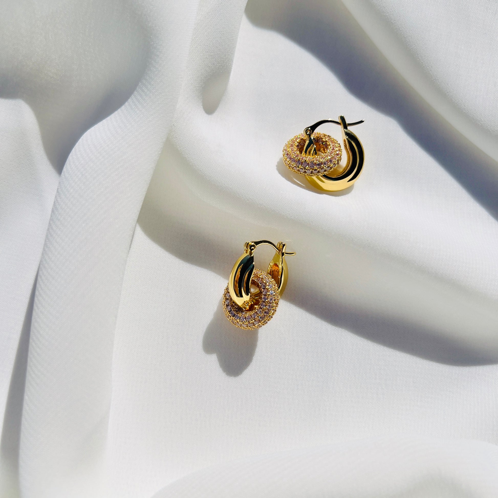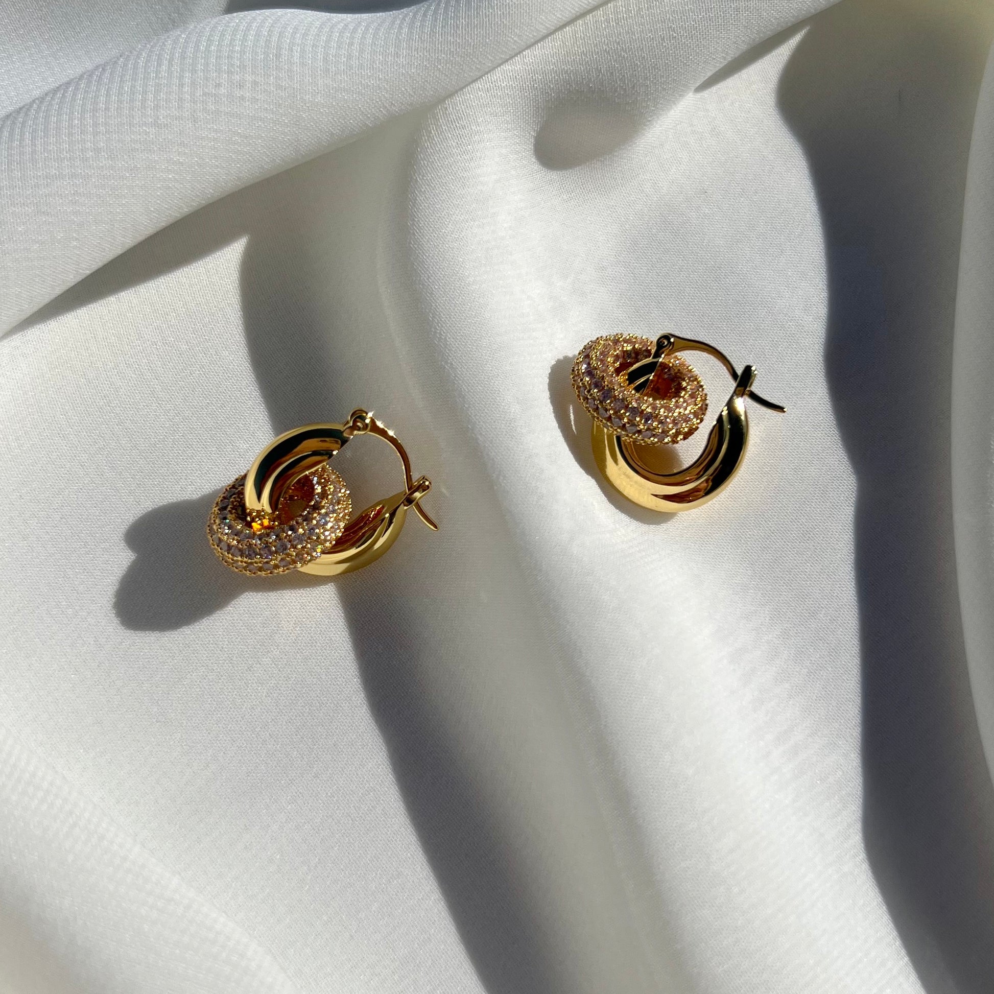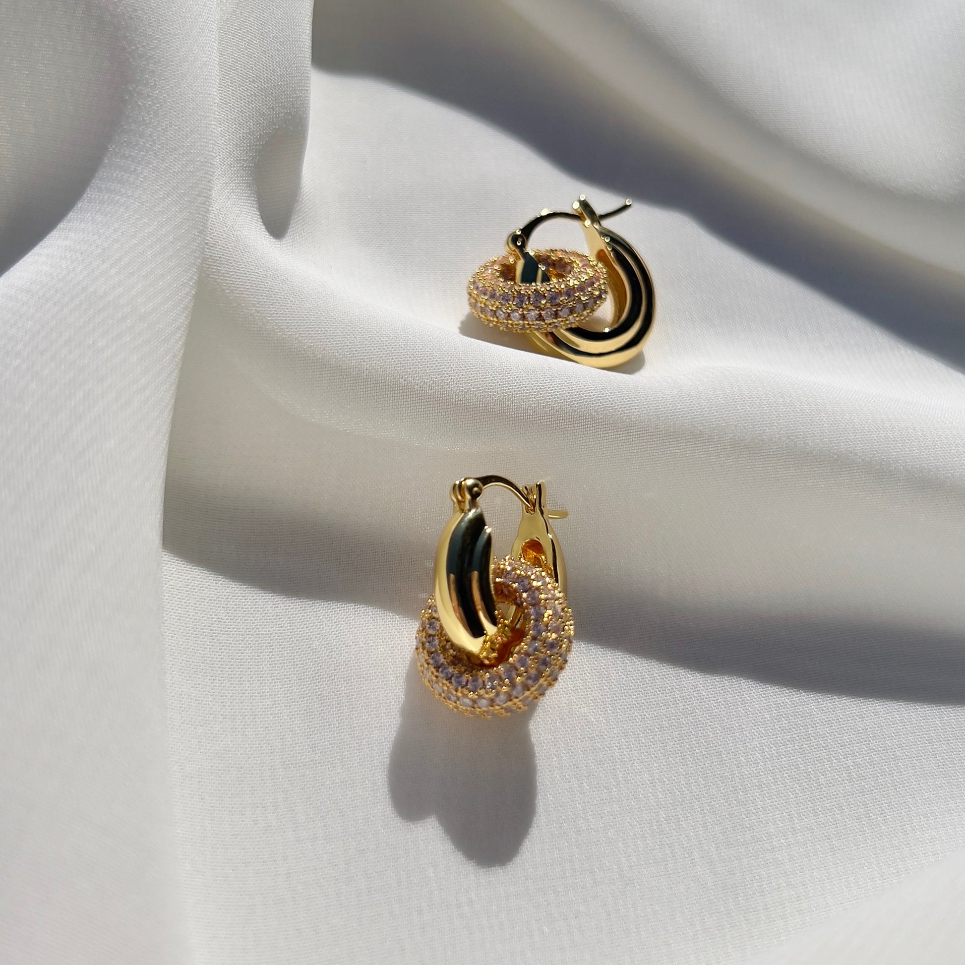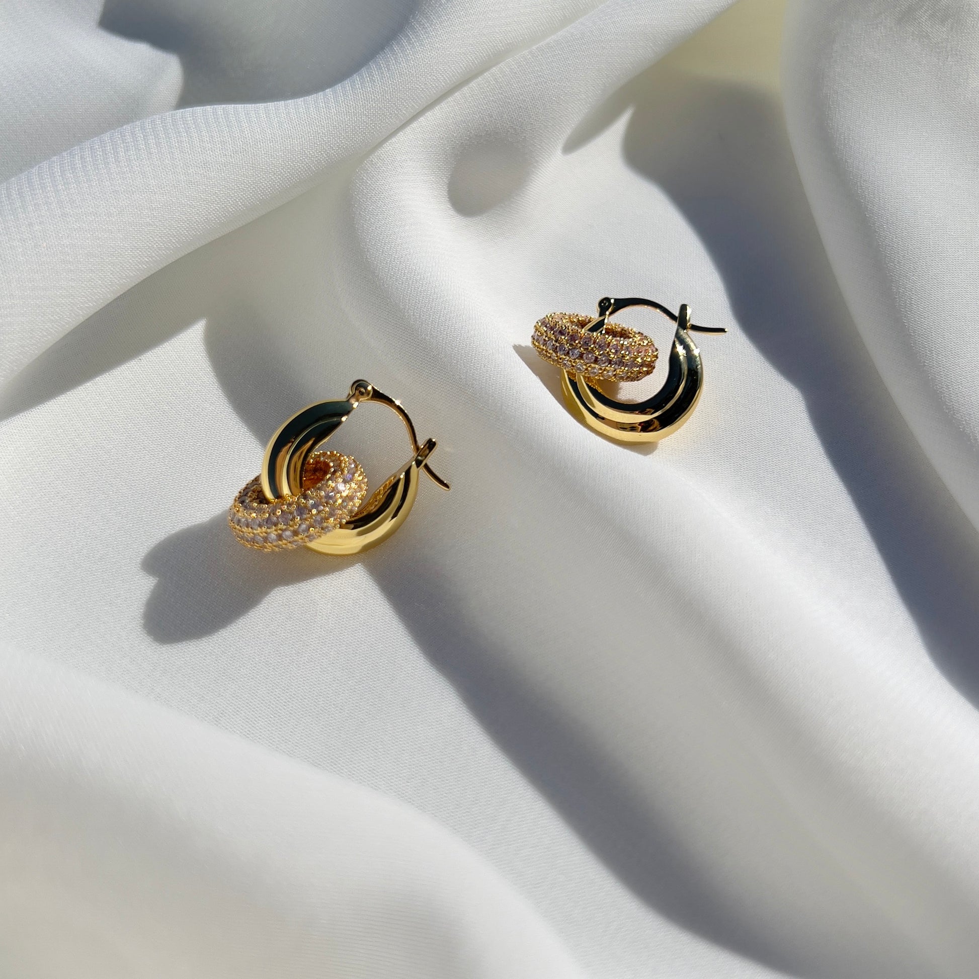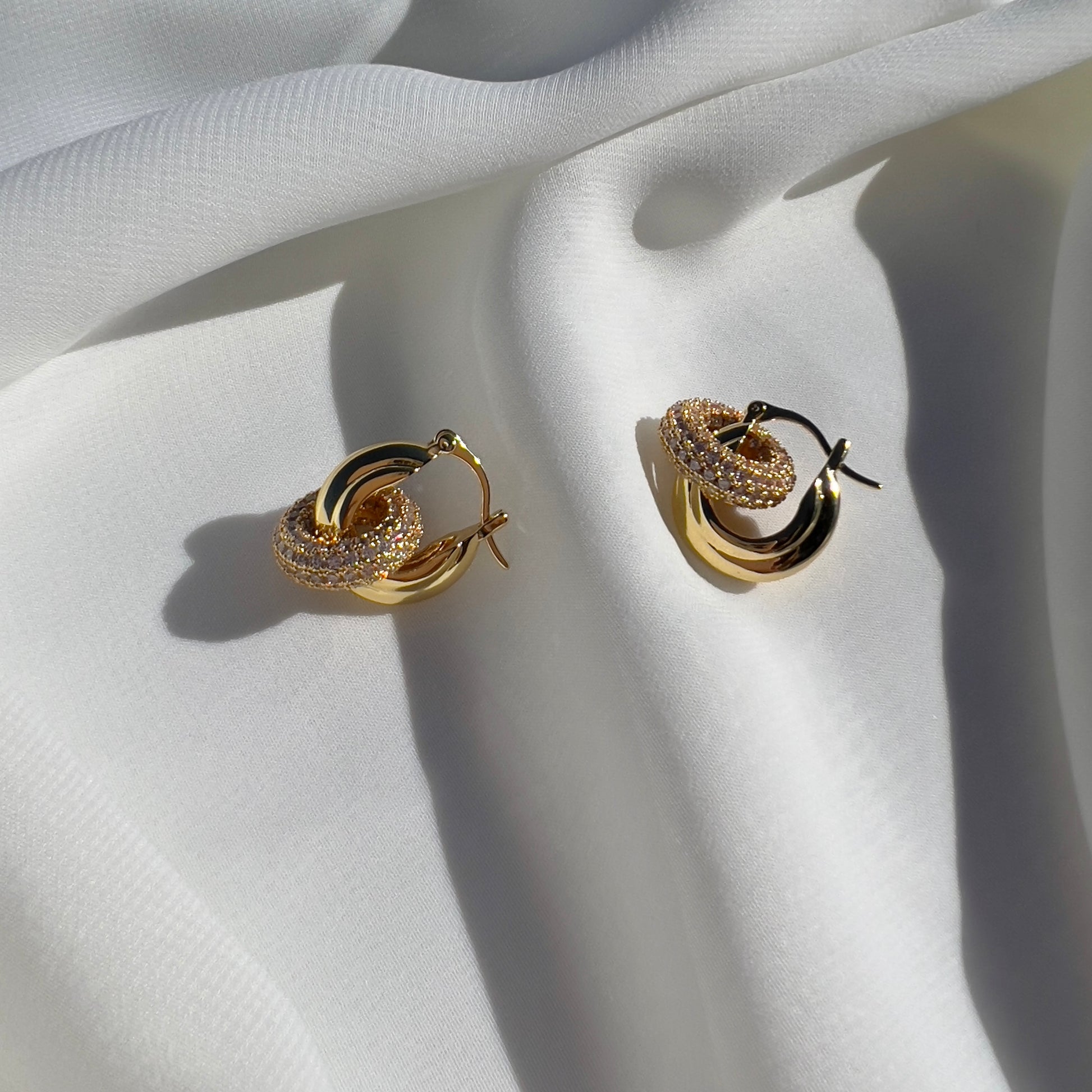 Gold Brass Vintage Studded Zircon earrings, double ring stud geometric round detachable multi-purpose hoop earrings.