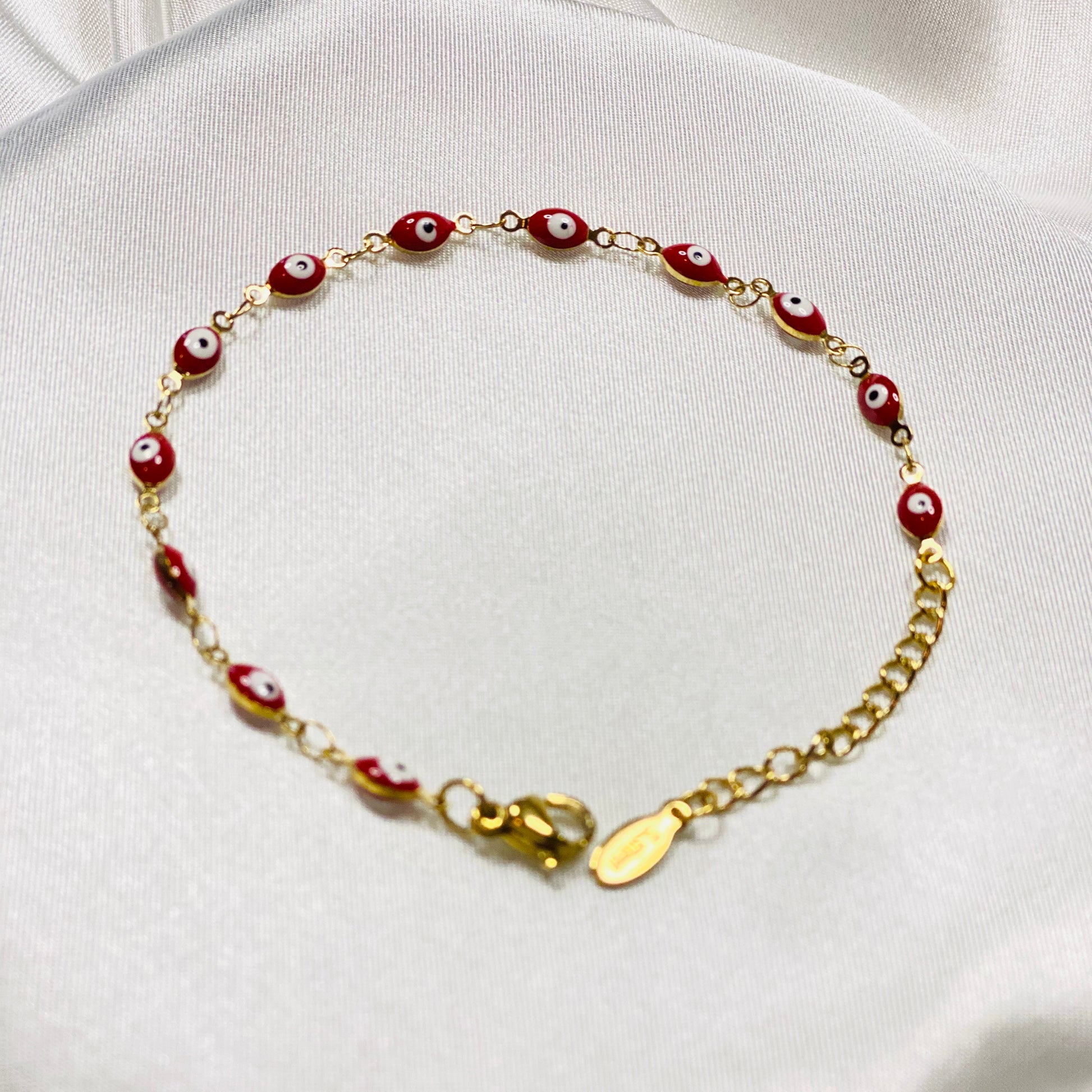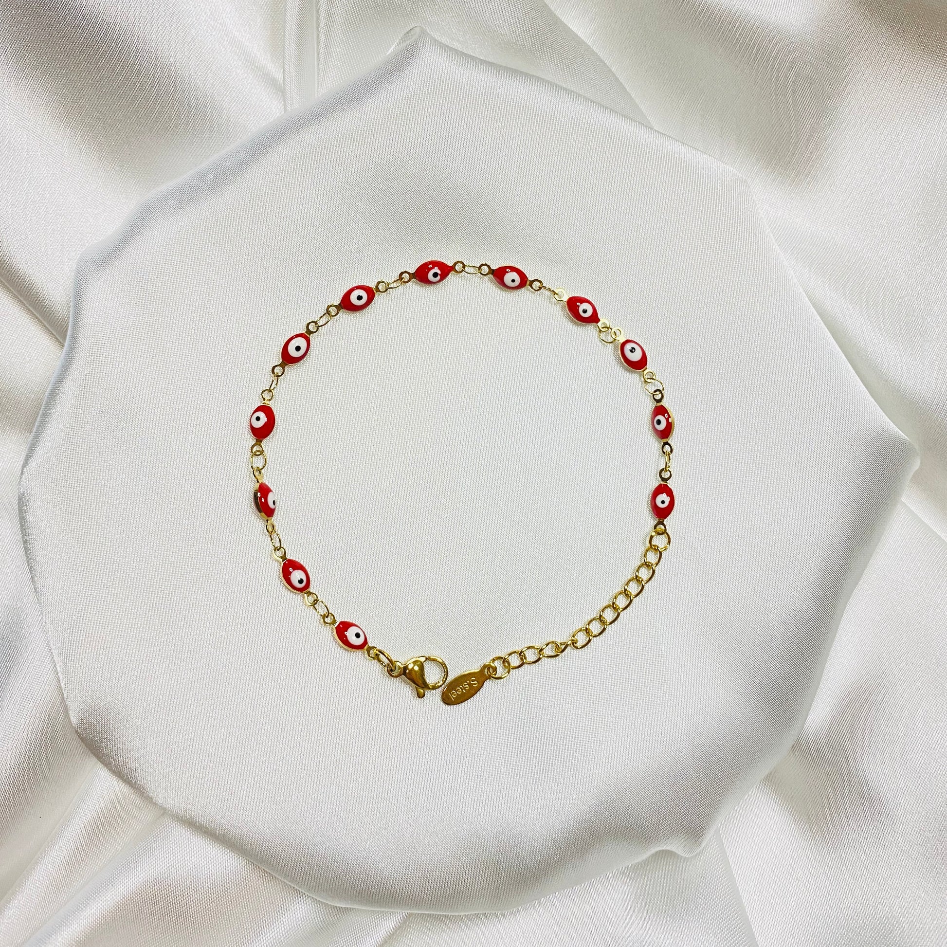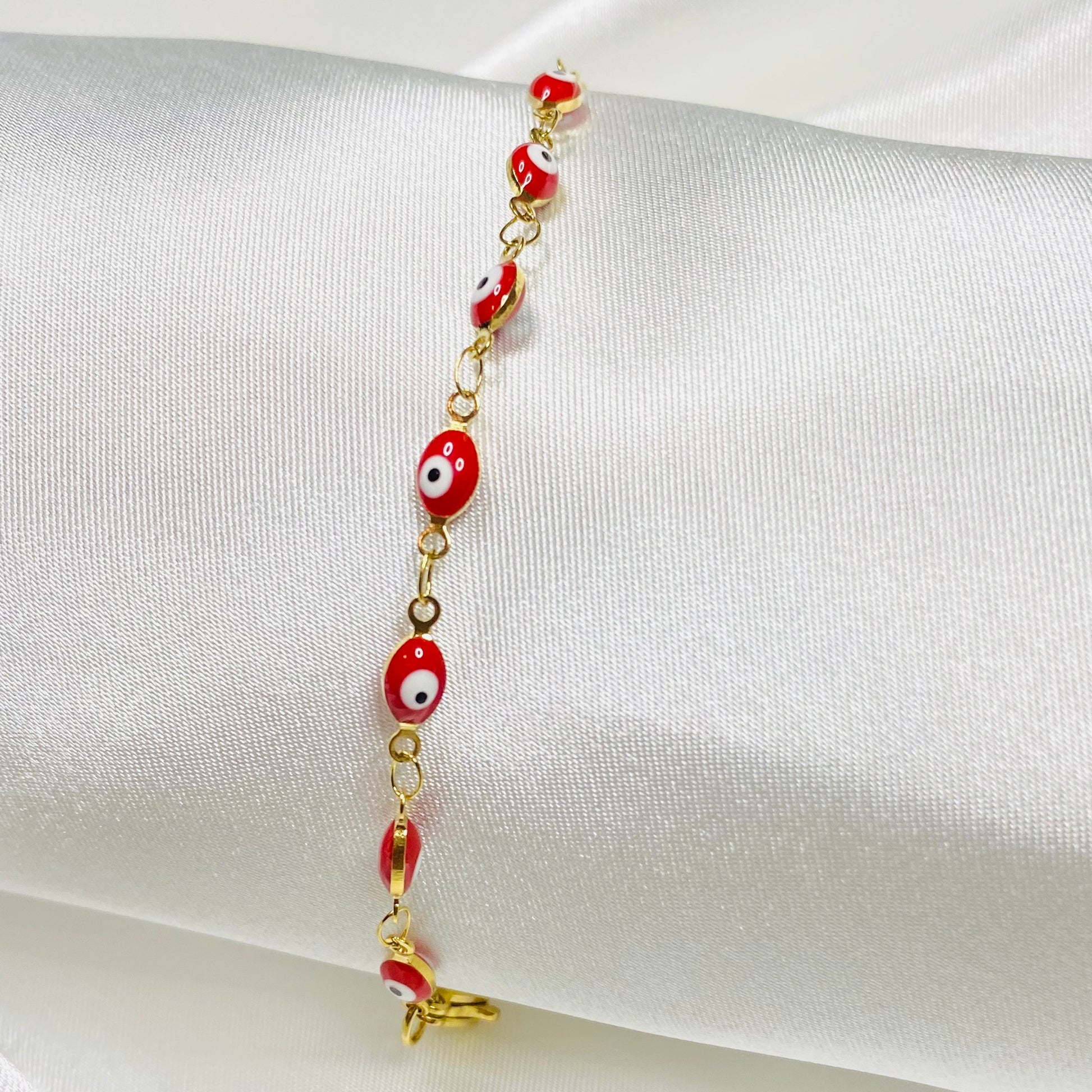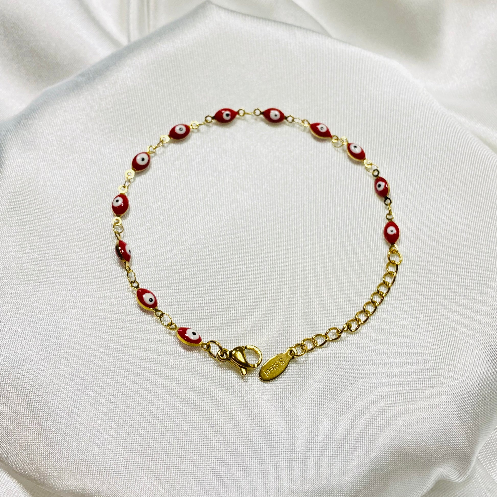Ojitos Rojos (Red Eyes) stainless steel 18K gold plated Turkish evil eyes bracelet.