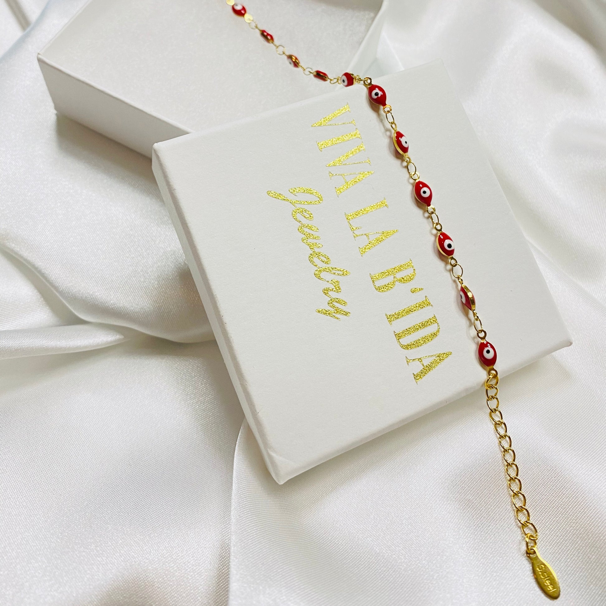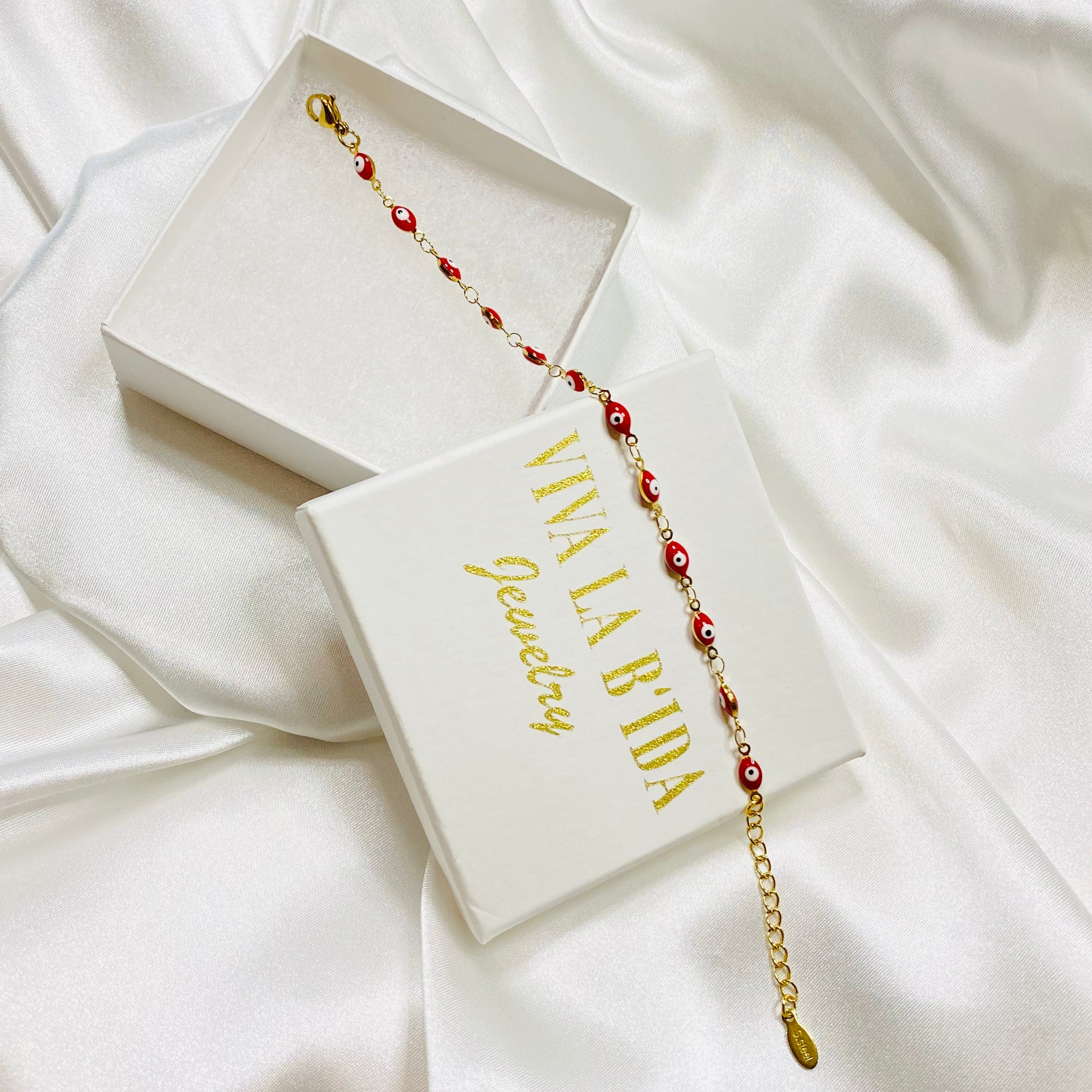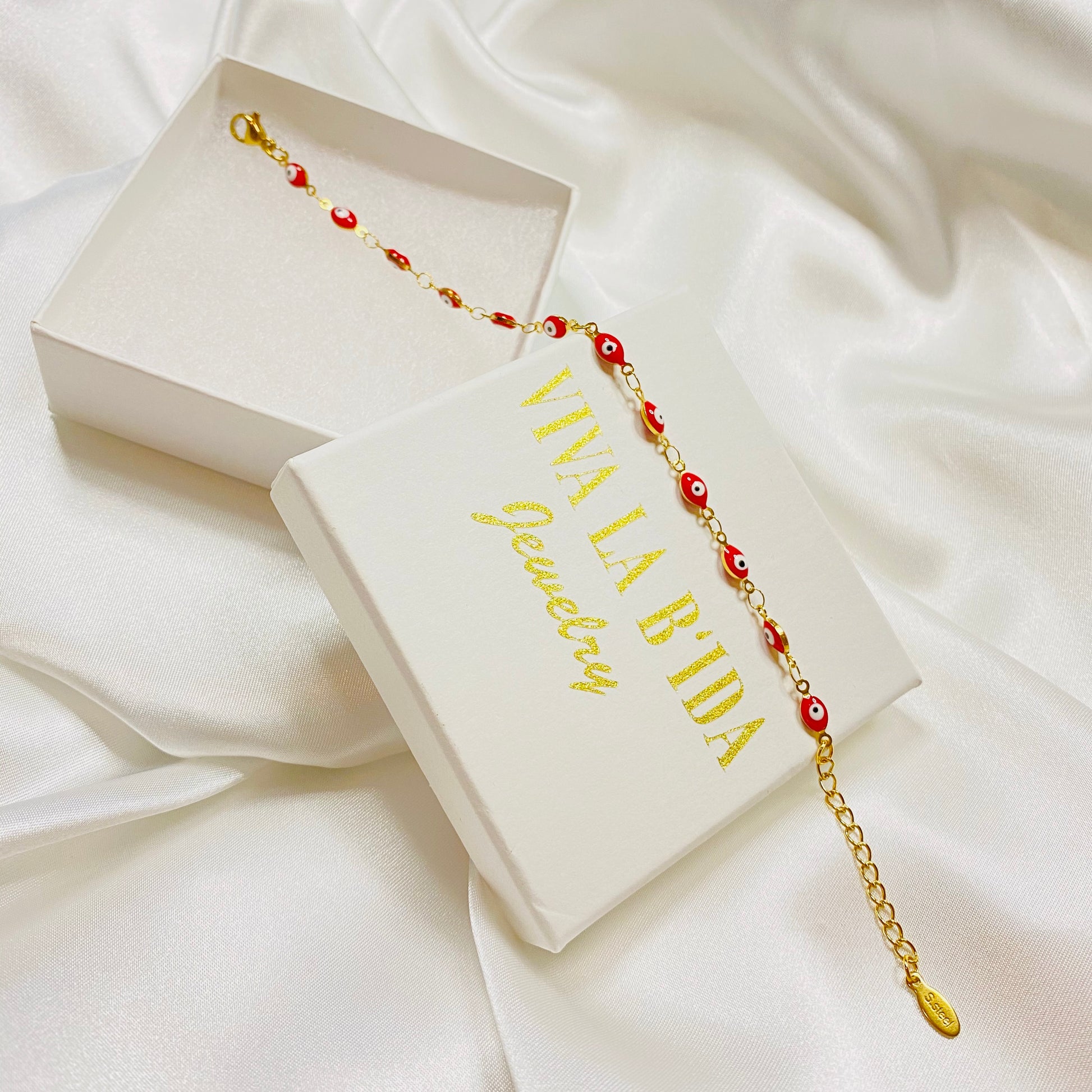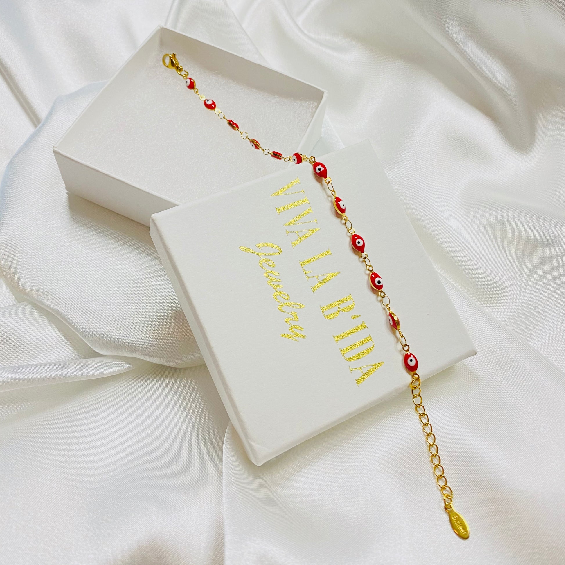 Ojitos Rojos (Red Eyes) stainless steel 18K gold plated Turkish evil eyes bracelet.